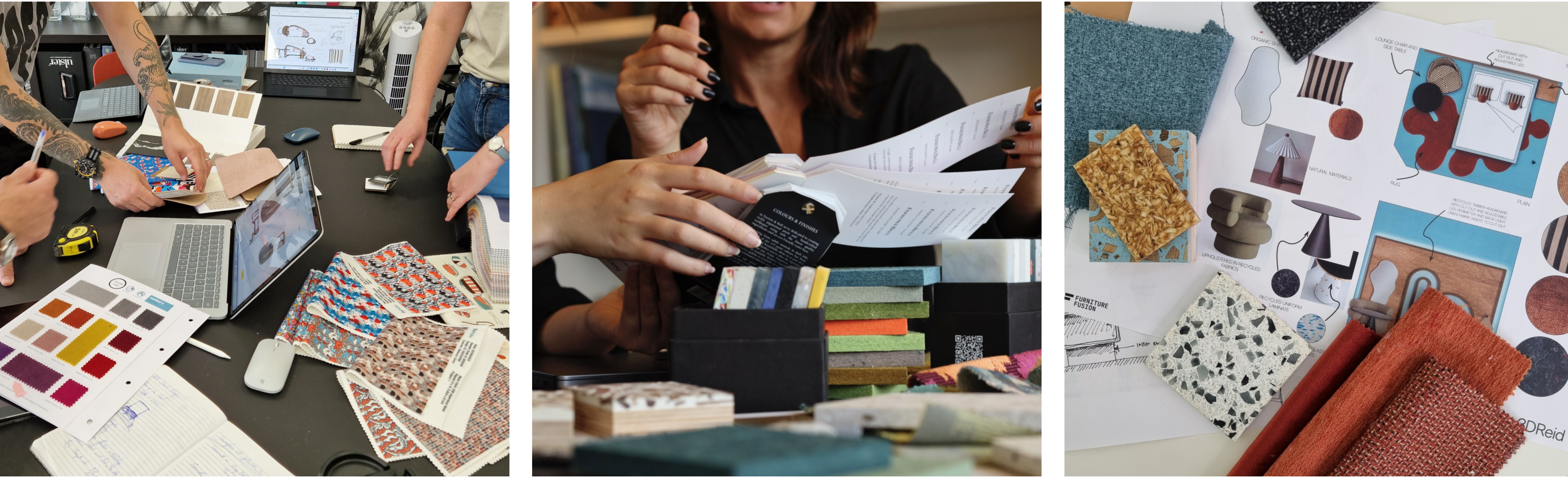 Each of the three studios opted to use some kind of sustainable or recyclable material, whether recycled fabric, board made from agricultural waste or plastic made from industrial tubes and acoustic panel waste. We understand and support the drive to use these innovative materials wherever possible, but sometimes project budgets just don’t allow for it.