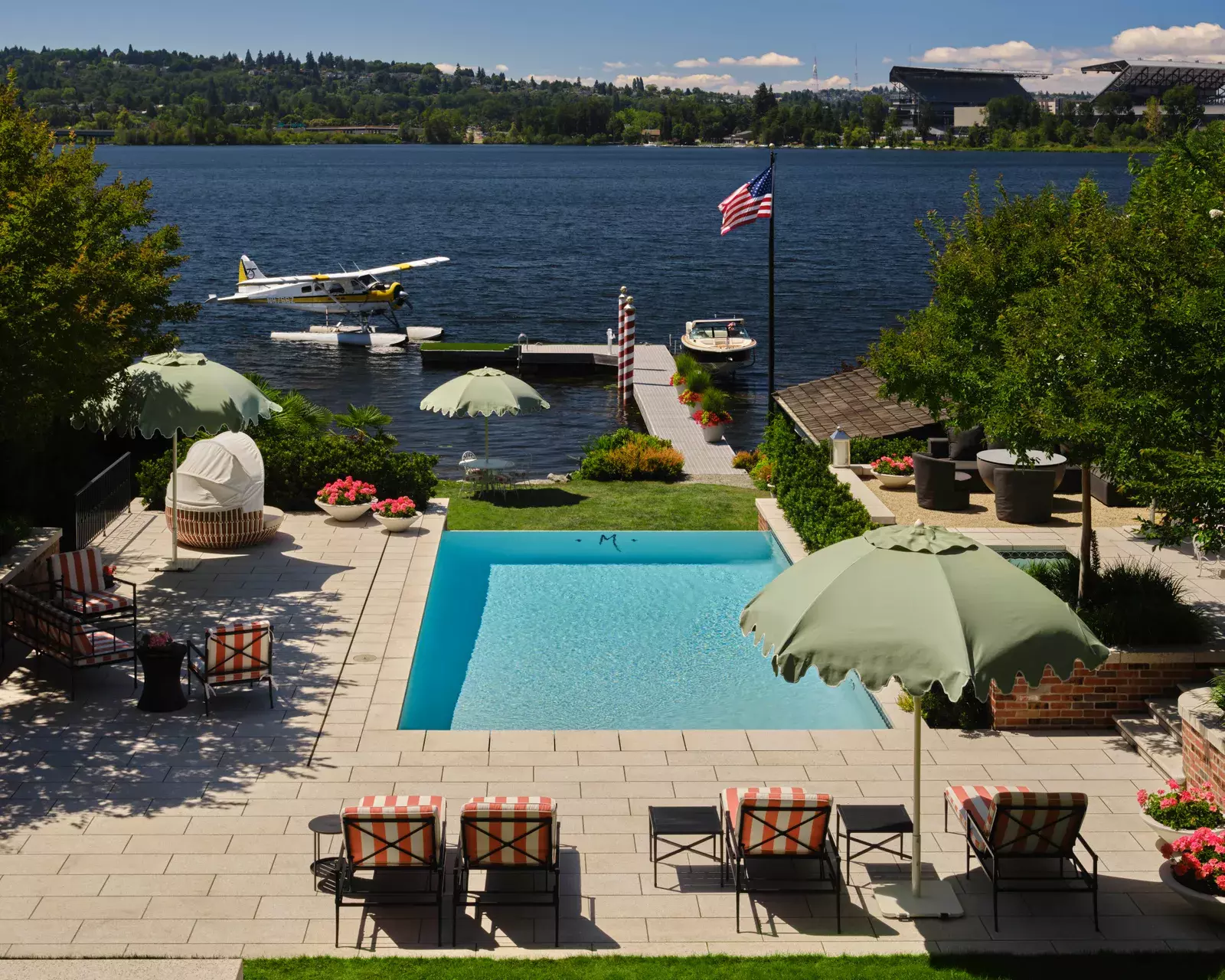 The 1927 Tudor mansion sits on the shores of Lake Washington, making super-stylish outdoor furniture non-negotiable. Taking inspiration from their stay at Lake Como, the pair have brought a luxe hotel feel to the garden and pool terrace, with retro striped upholstery and elegant loungers around the pool. Guests can arrive by boat or seaplane - not the average commute!