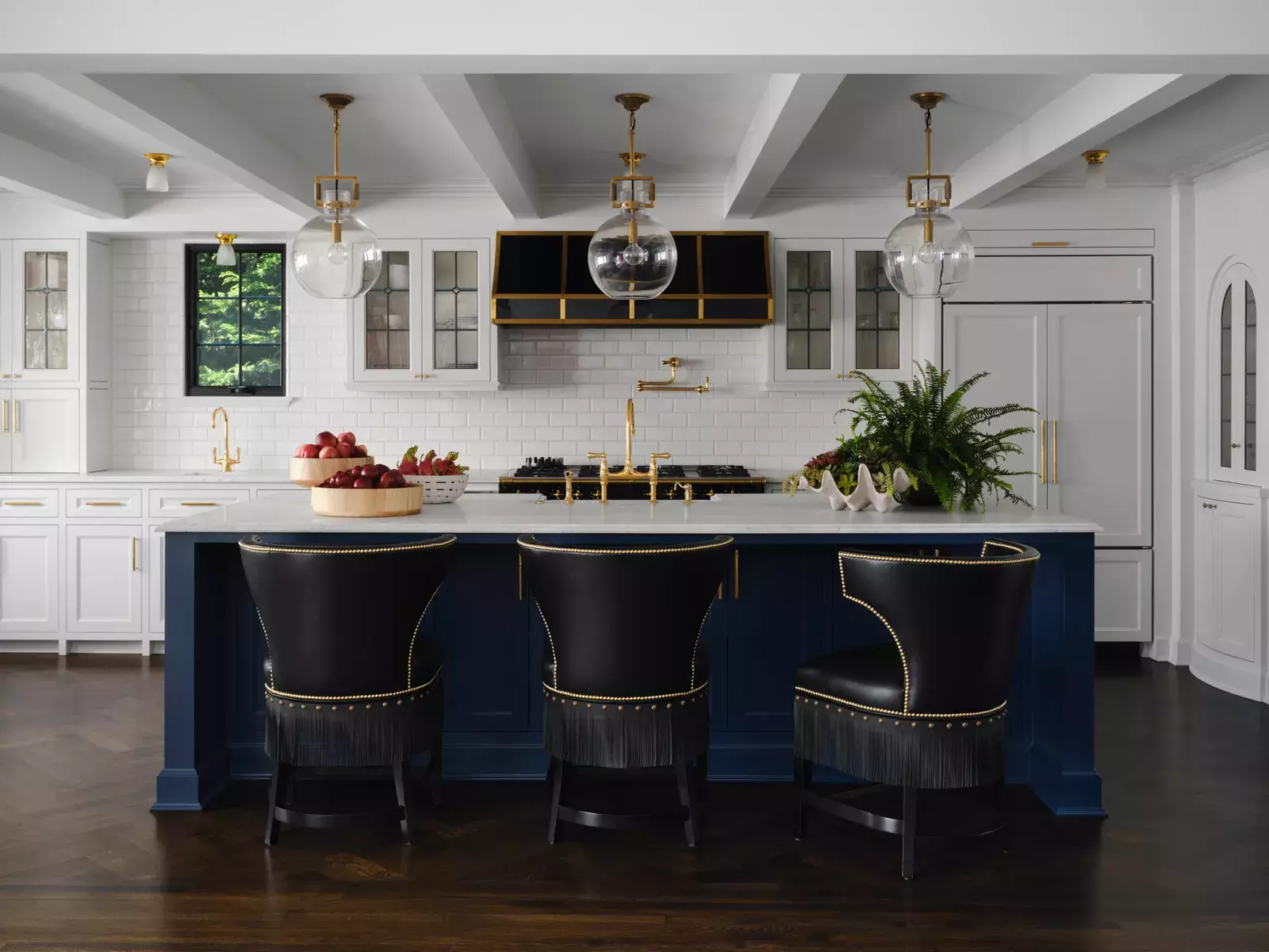 The McKagens’ kitchen is a contrast to the colour-saturated interiors in the rest of the house. Classic white tiled walls, painted cabinets and beams lend a cool, calm feel to the space, with the island unit finished in a deep cobalt blue. There’s a witty touch to the barstool chairs arranged around the island - black leather upholstery is finished with brass stud detailing and a black leather fringe in a nod to the owner’s rock’n’roll roots.