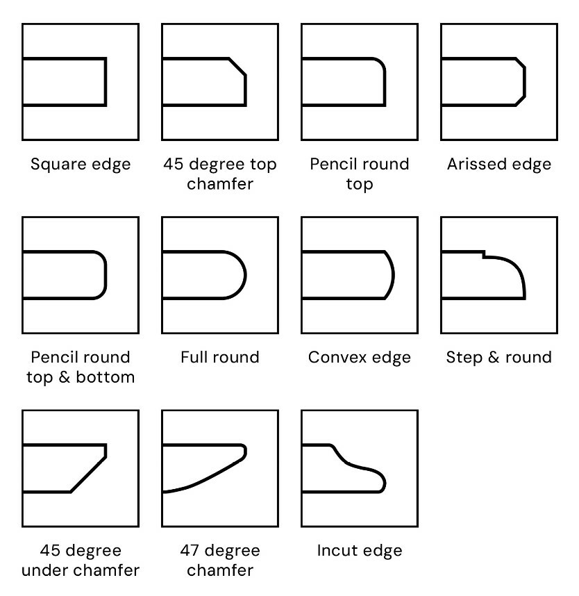 Your table top profile shouldn’t be overlooked - it’s an important feature in defining your table’s personality. Whether simple and sleek or ornately decorative, choose an edge profile that complements your design theme, such as these: