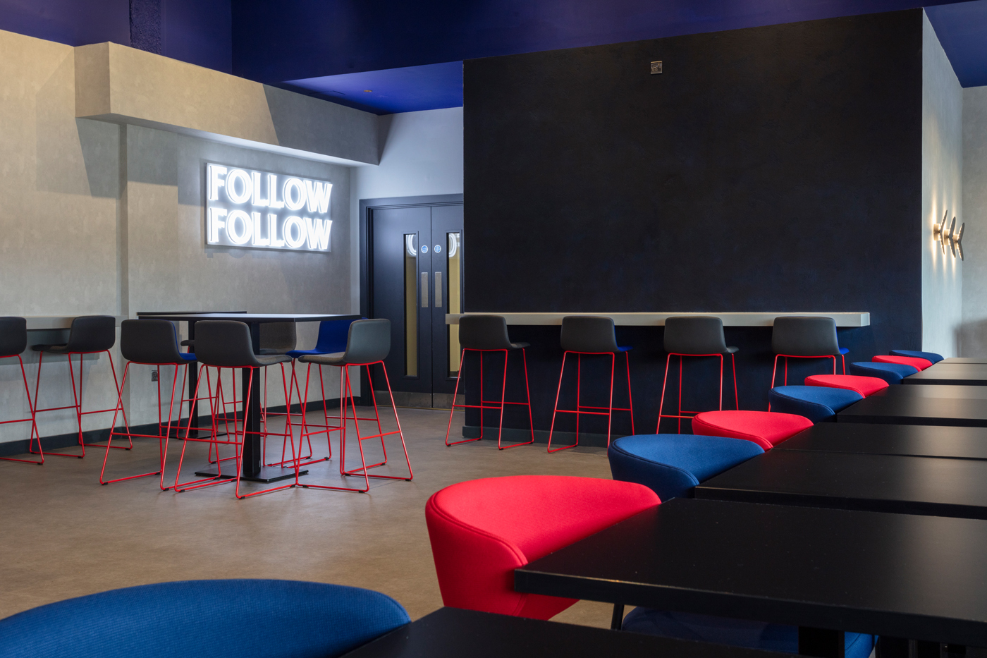 Bar stools are also a great choice for an education setting - not just in the student bar, but in a library, lounge or communal study space. They give a relaxed, informal feel and are a practical, stylish option. Our recent project at Regent’s University London included some contemporary bar stools for a study corner in the newly-refurbished Student Lounge. Our Claire bar stools work perfectly here - upholstered in a soft chalky pink fabric with wooden legs, they’re a really practical choice and look great alongside the graphic wall covering and bold fabrics used on other pieces.