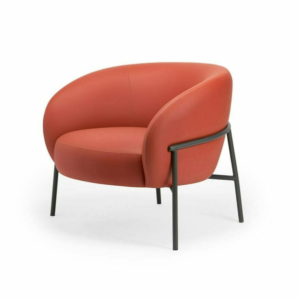 Our Rimo lounge chair shares similar swooping curves and generous upholstery, with a sleek metal frame enveloping the back and sides.