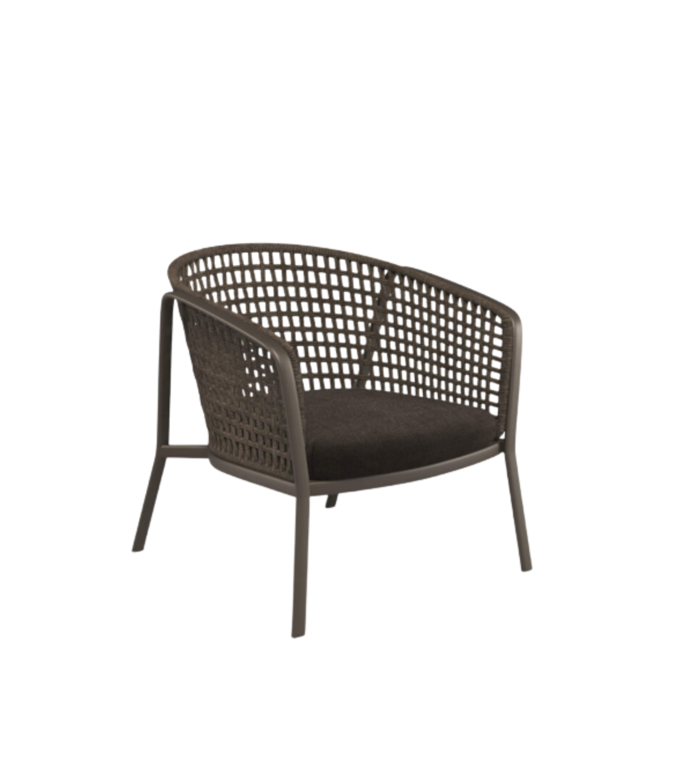 The Carousel family includes lounge chairs, an armchair, two seater sofa and pouf, all suitable for use outdoors. The lounge chairs all share the same cocooning shape and generous dimensions, with a seat made of die-cast aluminium alloy. Choose from three frame colours, with backs made from flat- or tight-weave synthetic rope or opt for the new square weave style seen here.