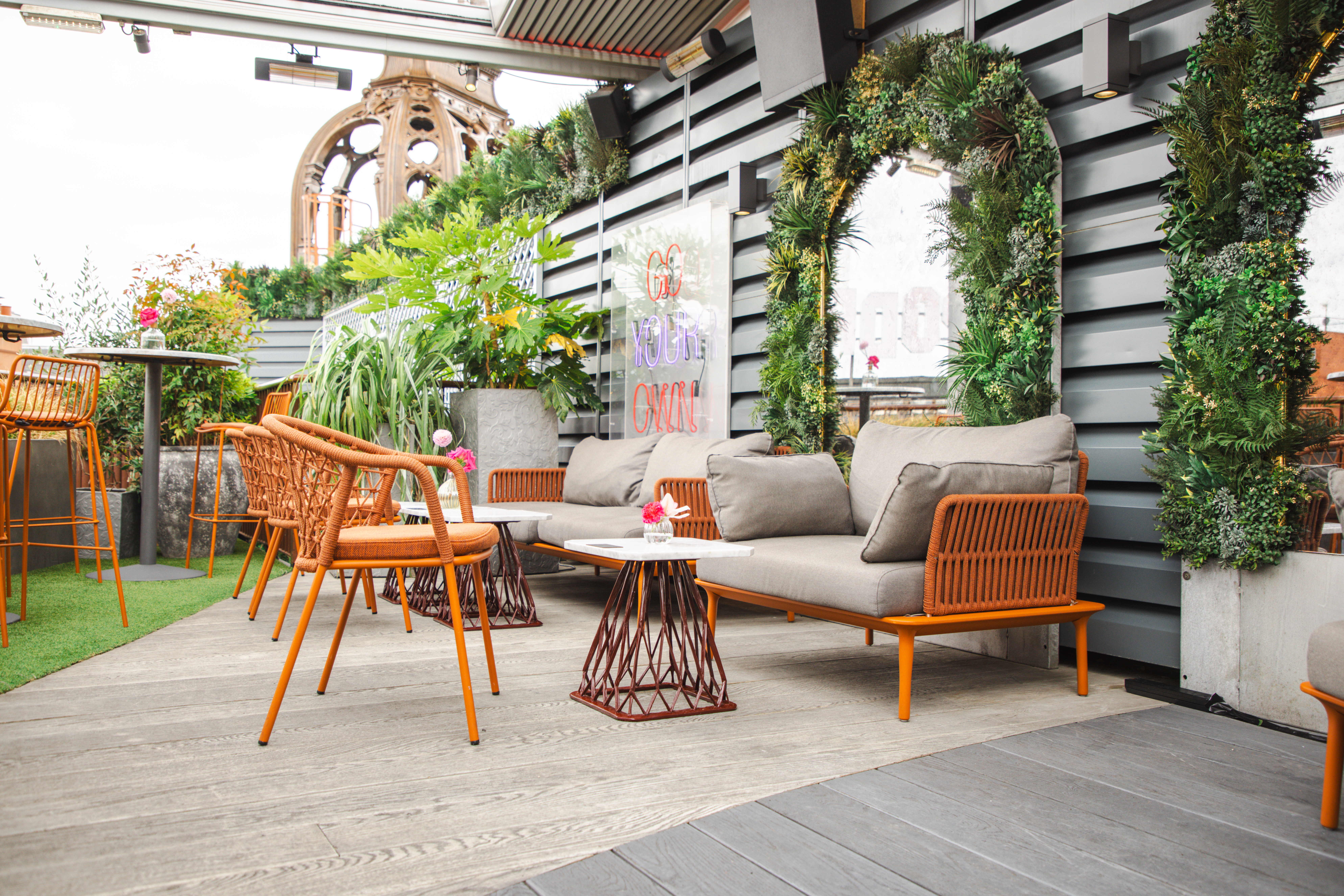 The expansive roof terrace overlooks the busy, buzzy Leicester Square, and it was important that the new look outside space gave casino guests somewhere special to relax and spend time when visiting this renowned venue. We love the Panarea armchair in vivid orange to contrast with the lush greenery - the same shade was used for our Reva Twist Sofa and Nolita Bar Stool.