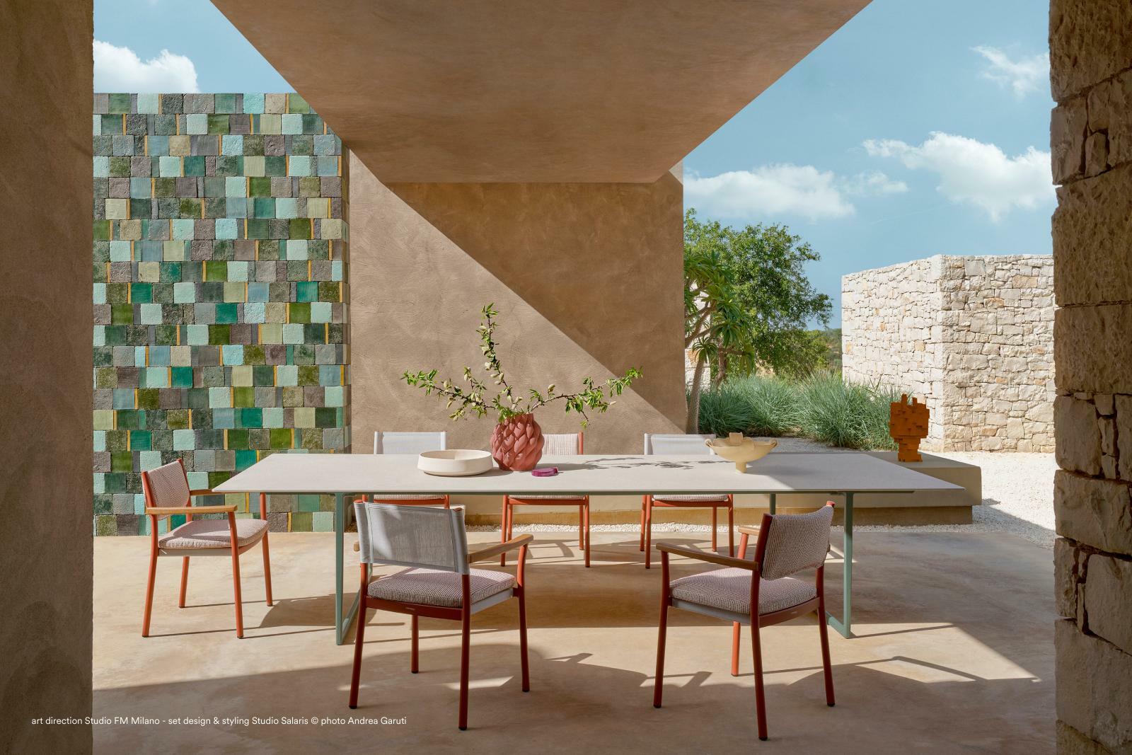 The Guinea outdoor armchair comes with lots of options for customisation to create a cohesive look for any outside space. There’s a choice of three backrests - waterproof textile mesh, aluminium slats or upholstered with outdoor fabric. The version with an upholstered backrest and seat makes it easy to tailor to suit your aesthetic and gives a super-comfortable seat for long lunches and drinks with friends this summer