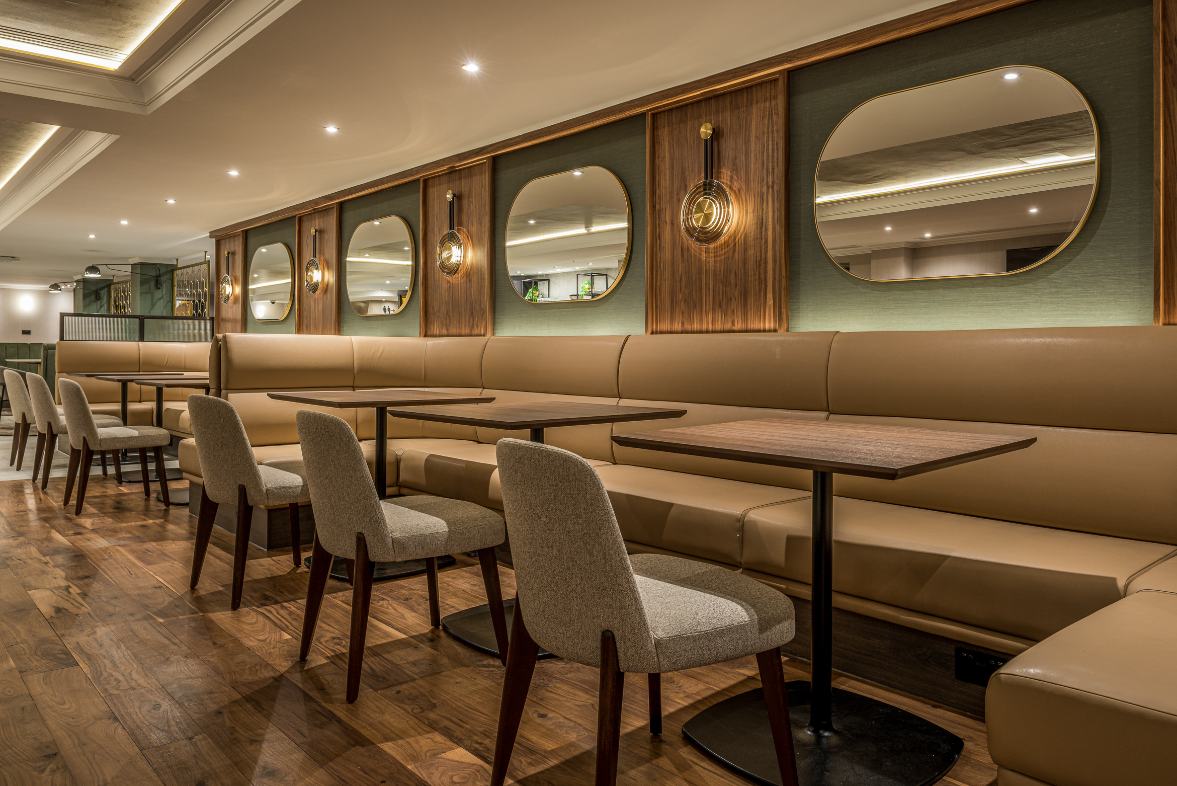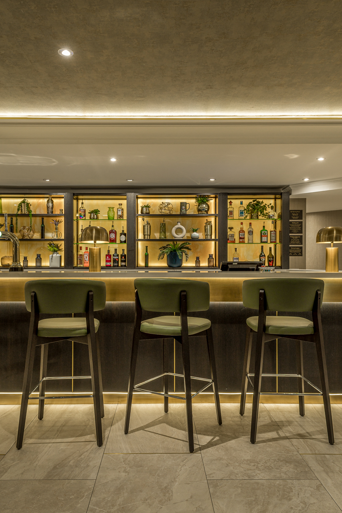 Our Rimo Armchair is upholstered in a warm olive green fabric which sits perfectly alongside our bespoke table featuring a Bianco Marmi Quartz top. We supplied two styles of bar stool - the Alissa sits alongside our high tables and is upholstered in a classic taupe leather, and the Taira was chosen for the main bar area. With a dark wenge wood stain and classic olive green upholstery, it looks fantastic next to the brushed brass detailing of the bar.