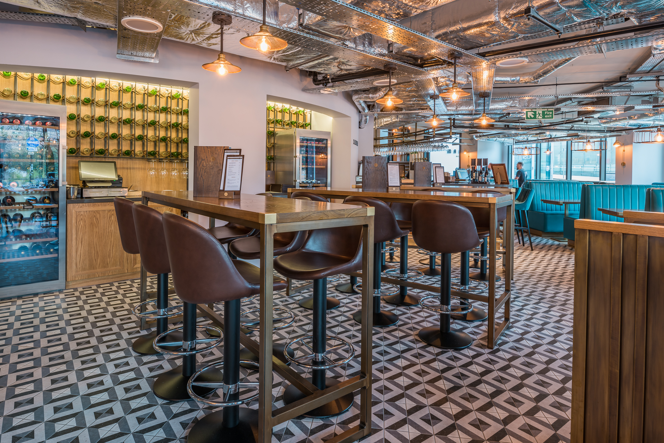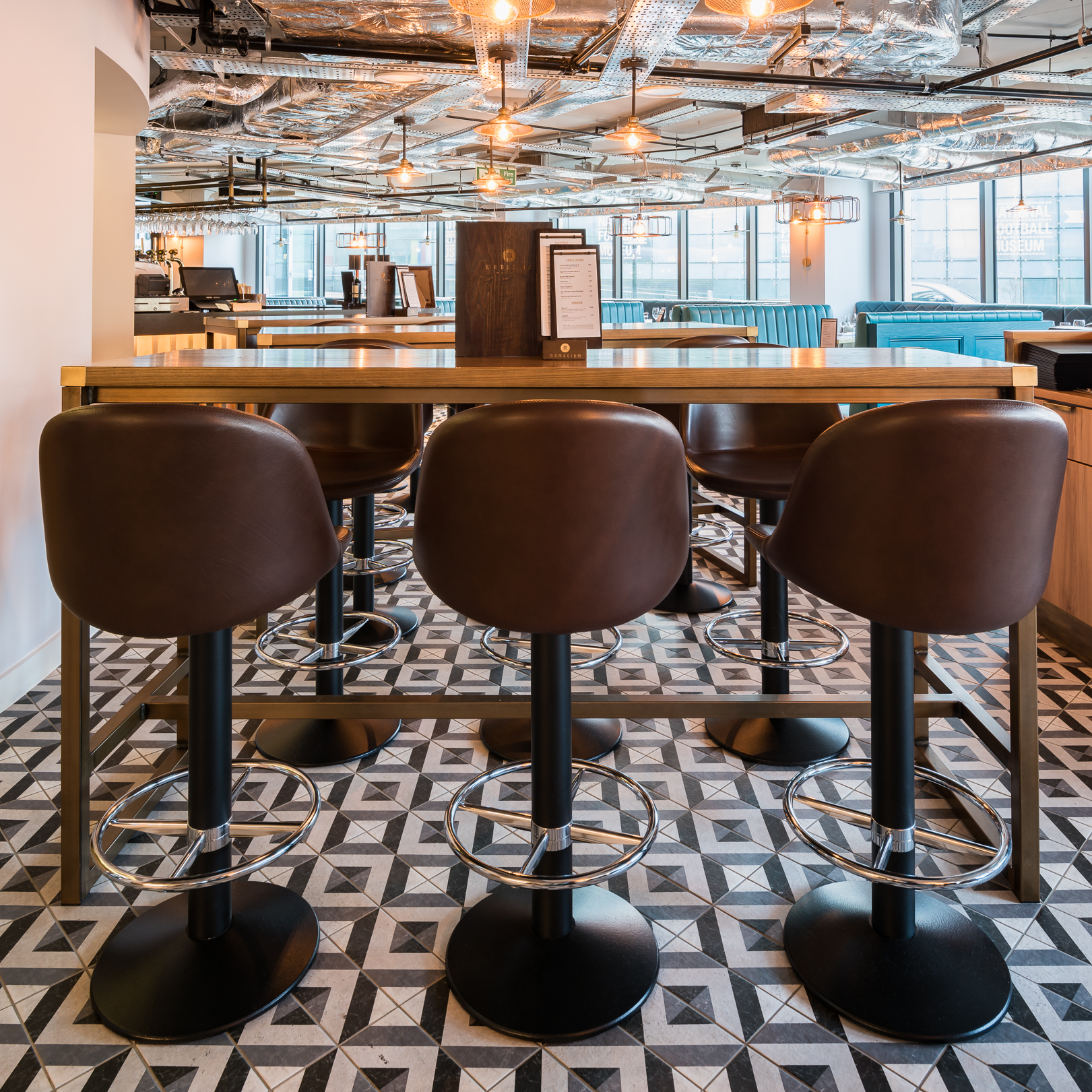 Mixing different heights works well to add interest to an interior, so our high table with Silestone top combined with the Joe bar stools to give the space another dimension. The teal upholstery picks up the colour palette used throughout Hotel Indigo, creating a seamless, unified feel.