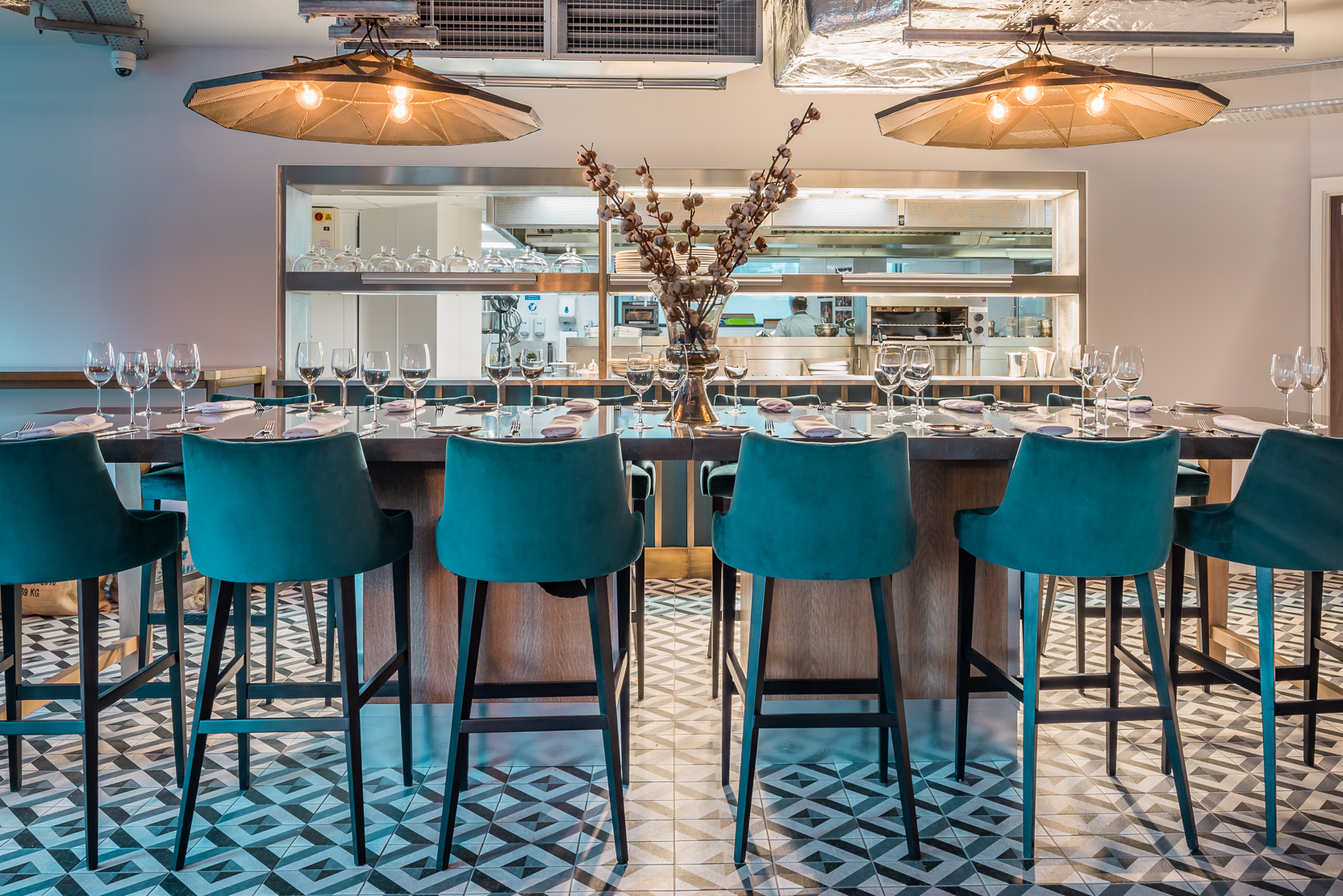 Our Elle bar stools sit beautifully against the main bar area, and the mix of deep blue green leather, dark wood and brass buttons and footrest give the stool a luxurious feel. On the other side of the room, our Louvre stools stand against a high chef’s table. Upholstered in teal velvet with a beautiful fluting on the back, they bring a real elegance to the interior.