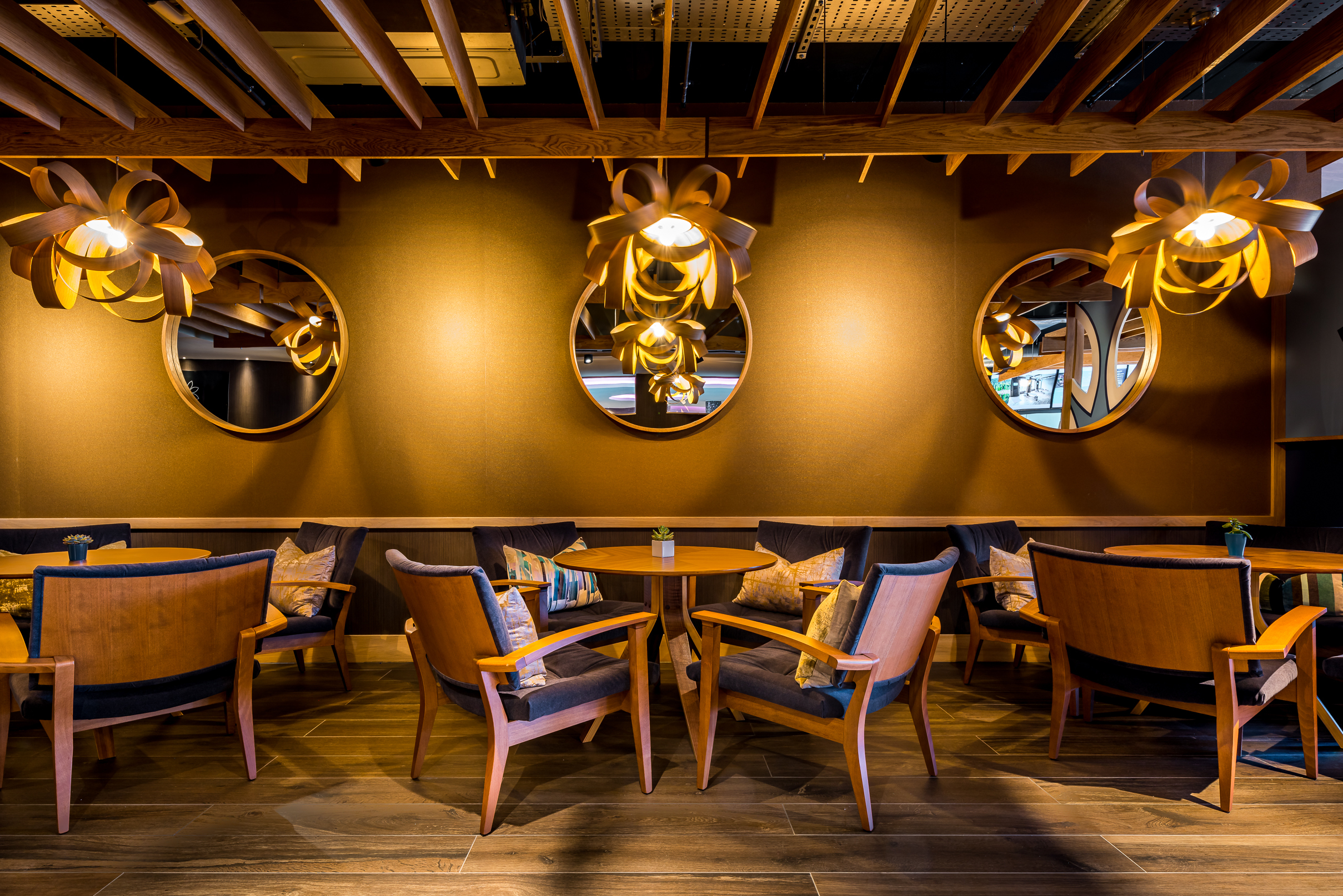 Different zones within the venue are delineated with distinct design details, while ensuring a unifying theme, and it was important that the pieces supplied reflected this. We worked hard to source wood veneer and laminate finishes for our Eileen Side Chairs and Tonda Table Bases to complement the striking elements in each space, from wooden beams and curved plywood lights to a playful bamboo skylight detail.