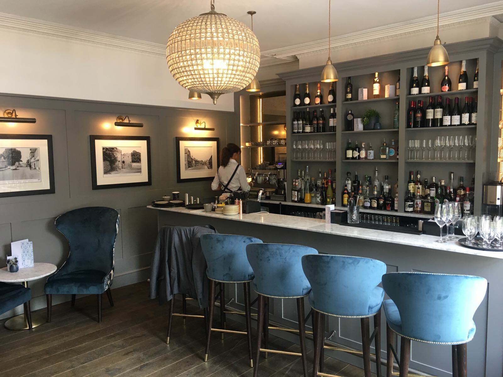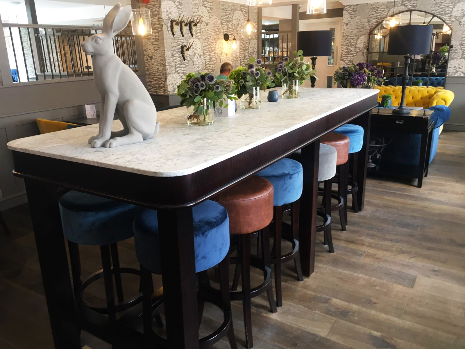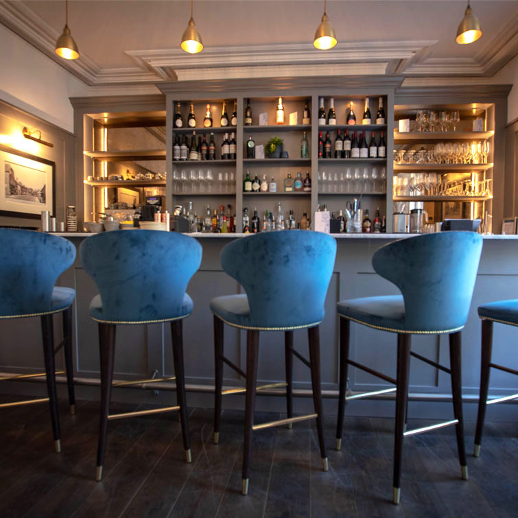 The small bar area has a beautiful mirrored back, with white marble counter to match our tables. Camelia Bar Stools give the bar a touch of elegance, with the blue velvet upholstery and brass socks, footrests and studs.
