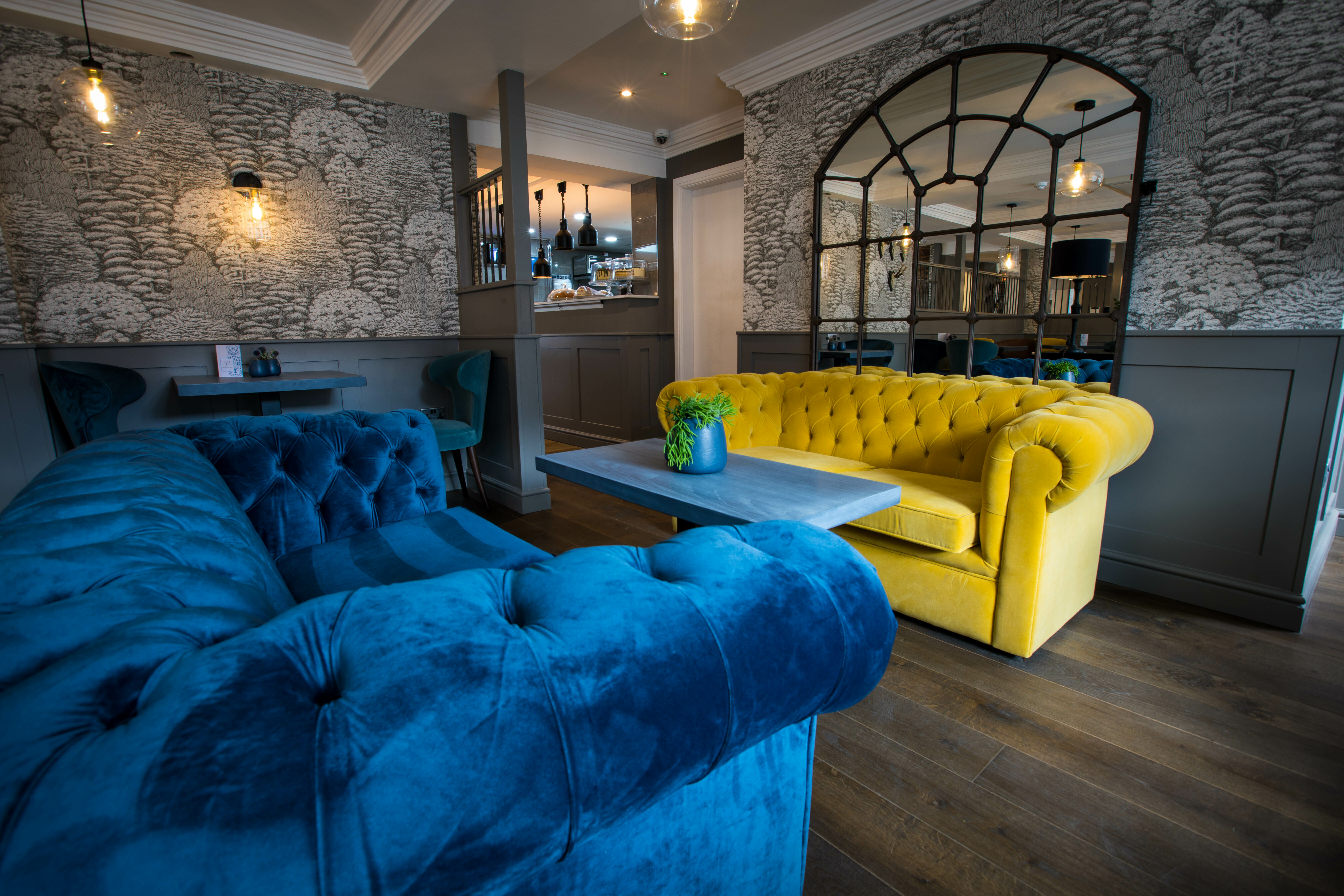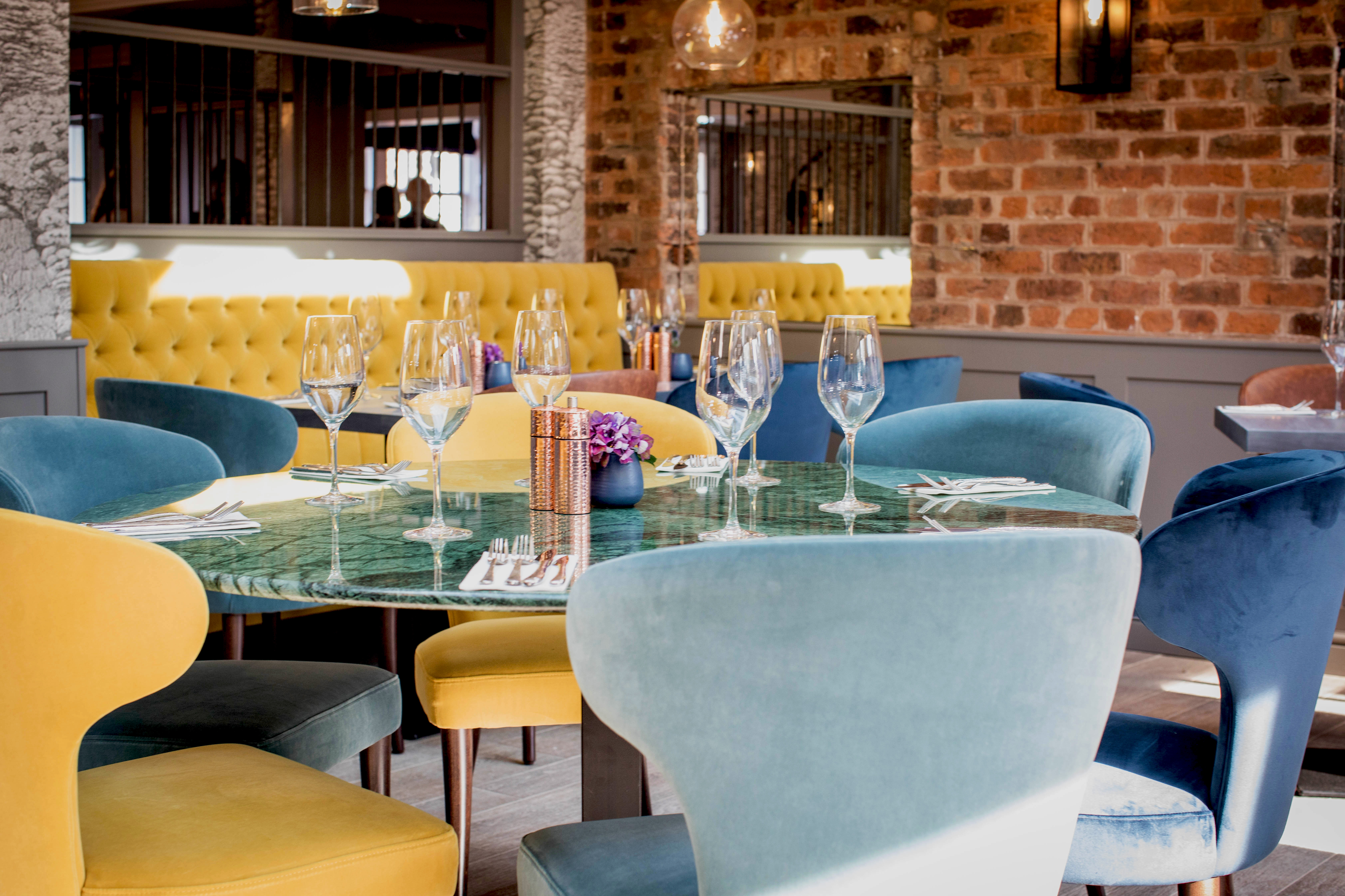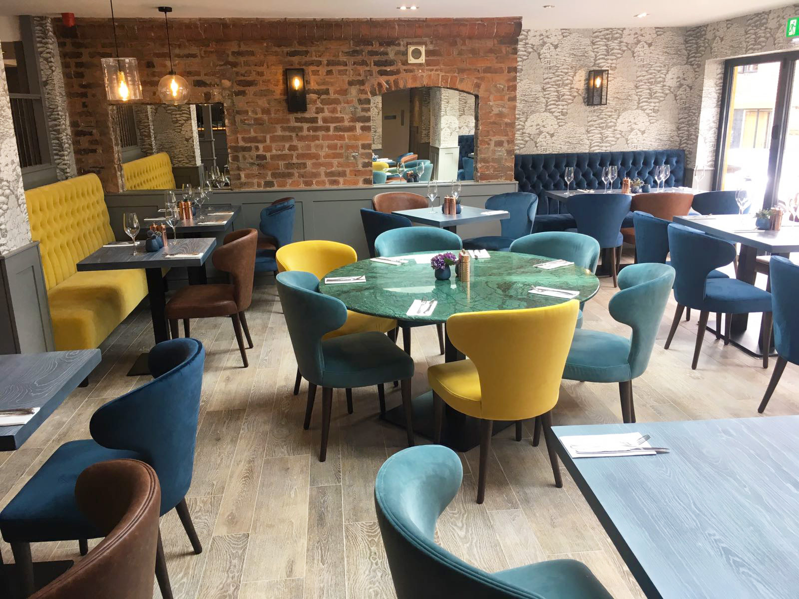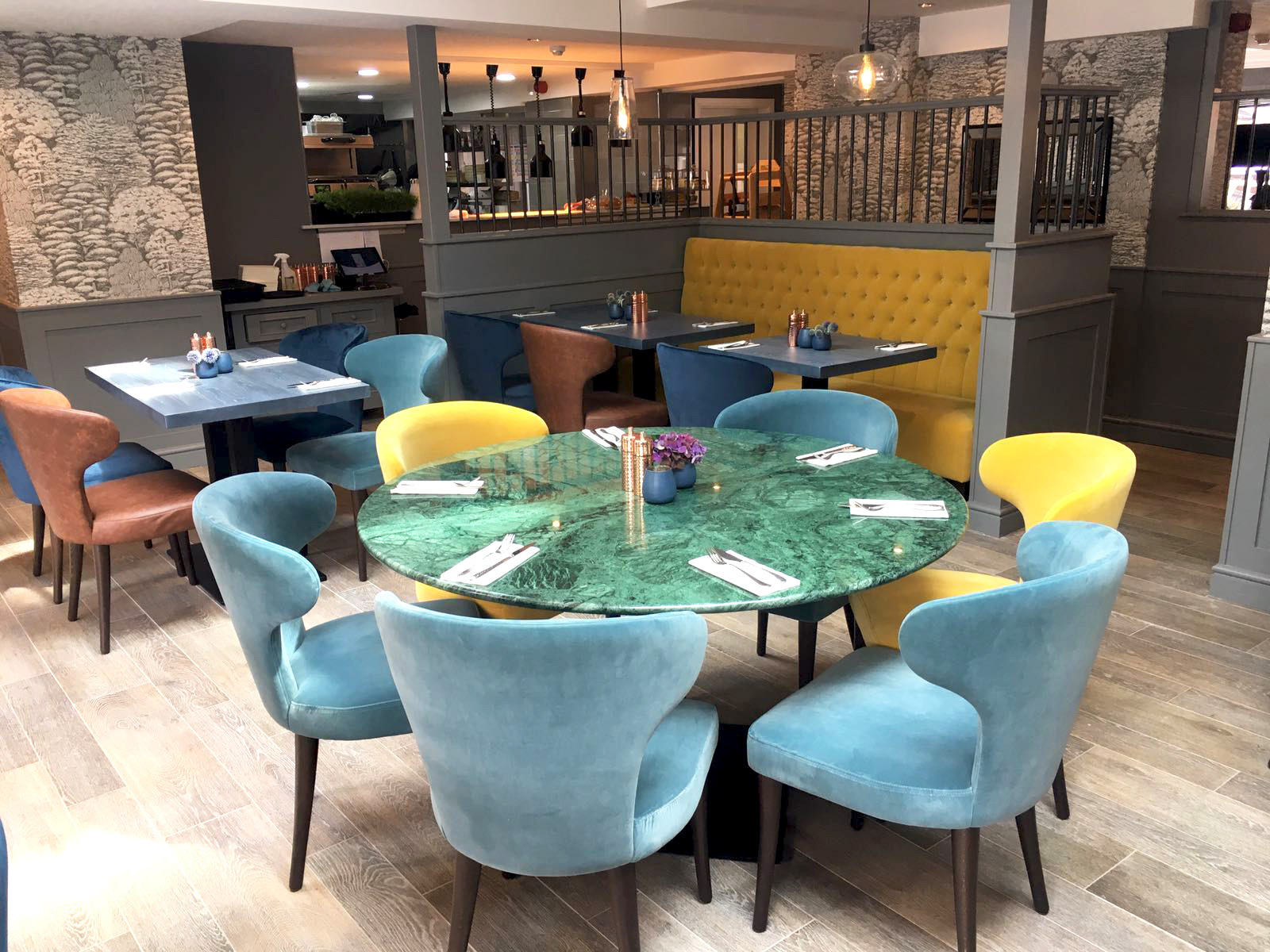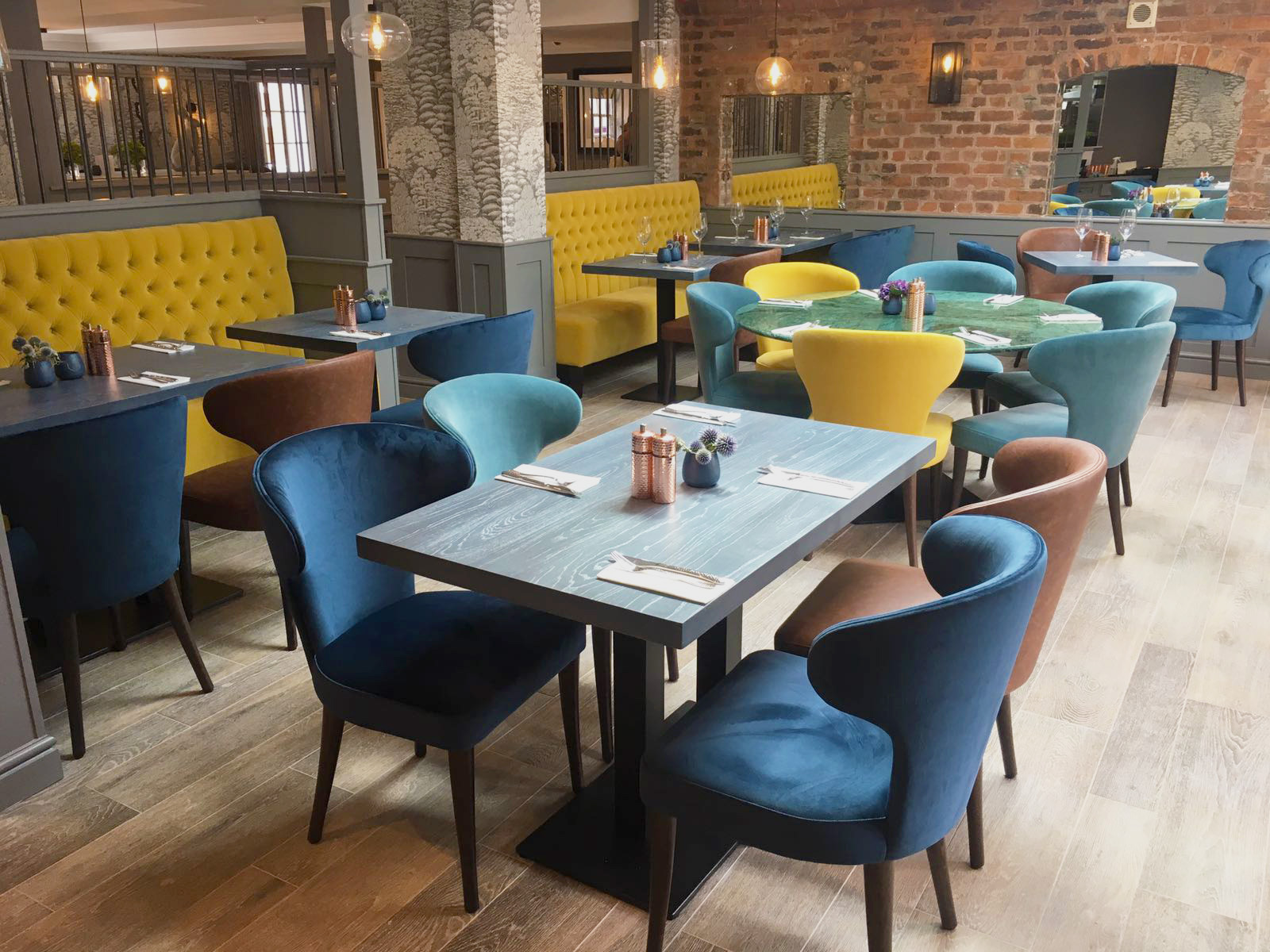 Yellow and blue velvet are the two main contrasting colours used on the furniture and we delivered a pair of vintage looking Chesterfield sofas, one in each colour. Alongside the walls, we installed four bench seats, with a deep button detail in a mix of the colours mentioned.