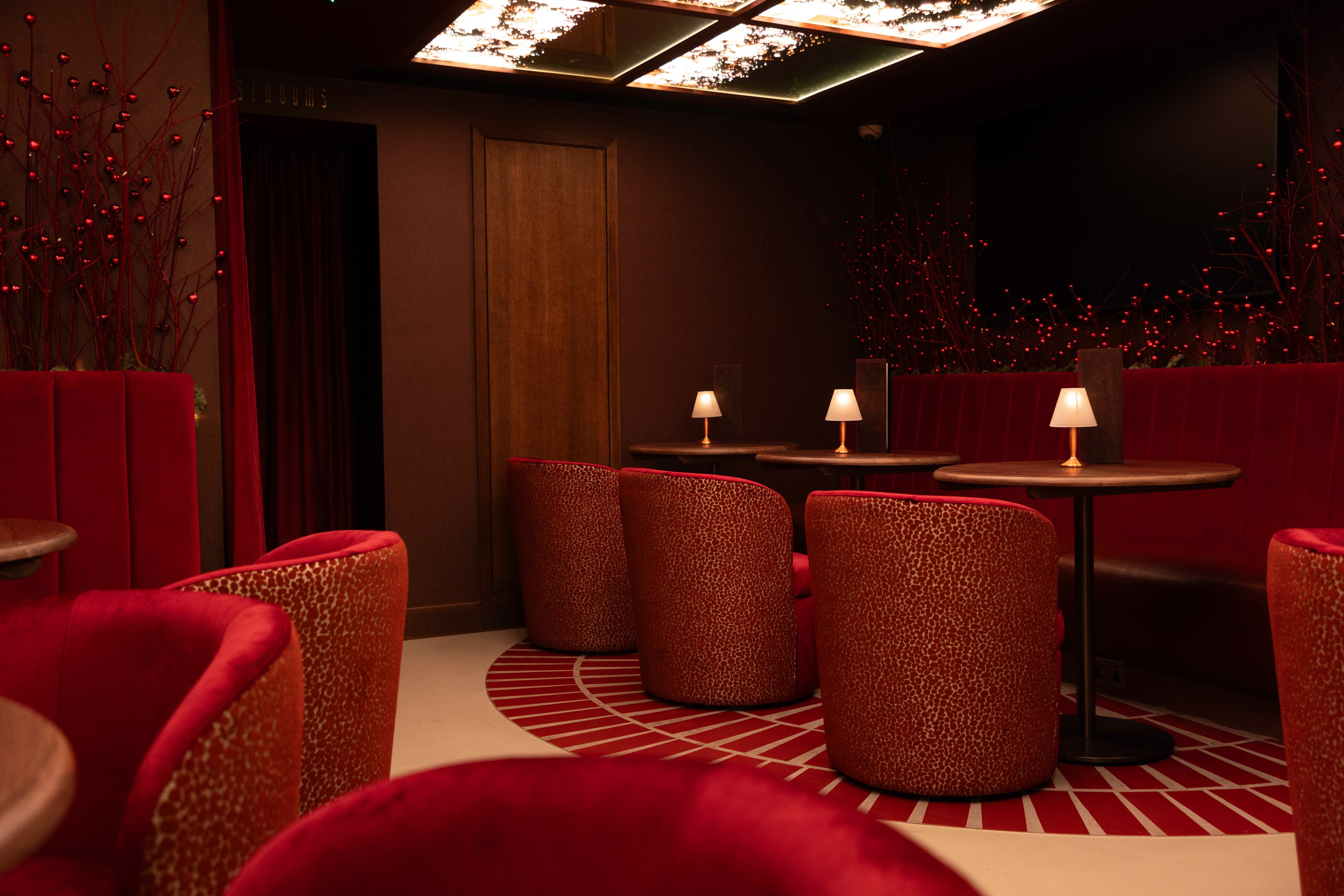 Our Roll lounge chairs are a perfect choice for a hotel, restaurant or bar interior - a great spot for a pre- or post-dinner drink at Babbo. Upholstered in a deep cherry red textured velvet fabric, they sit perfectly alongside our fixed seating