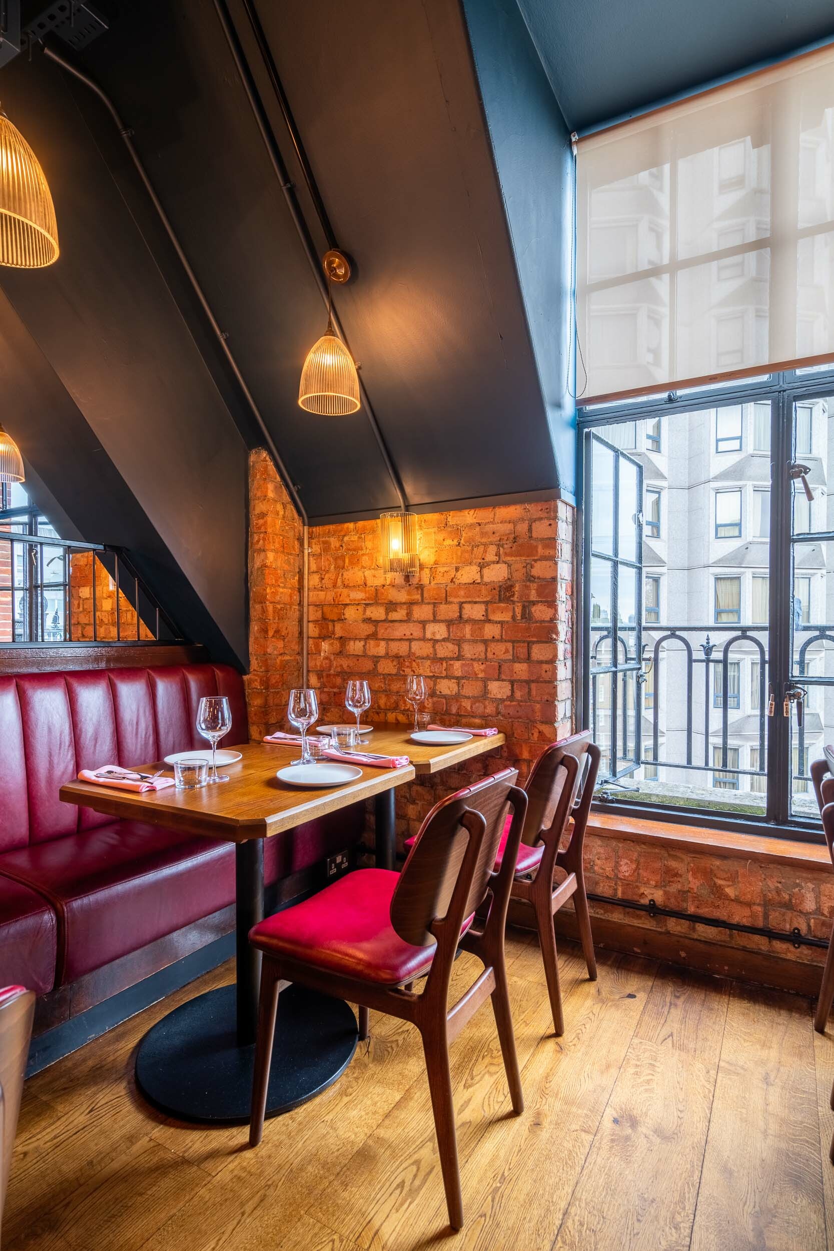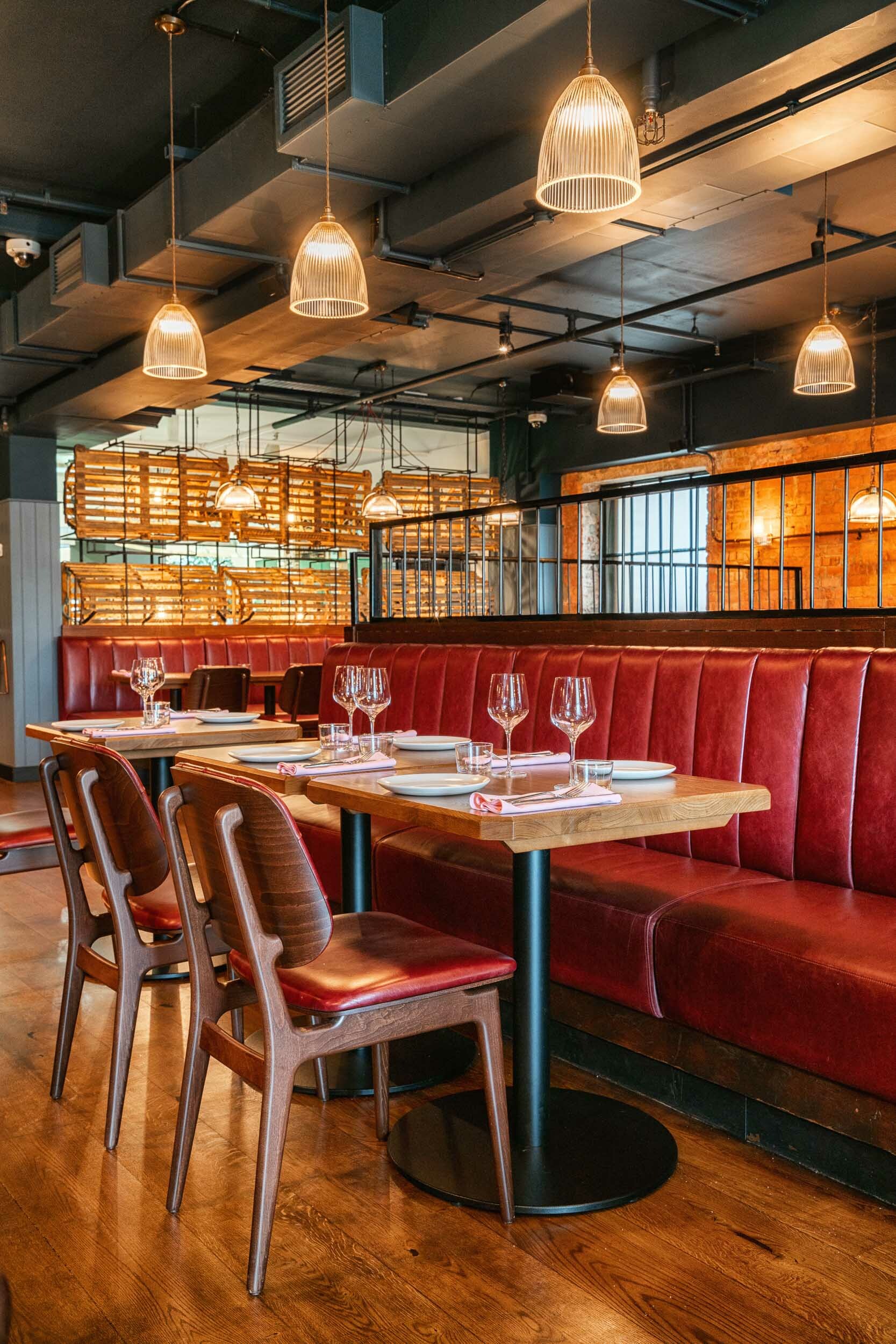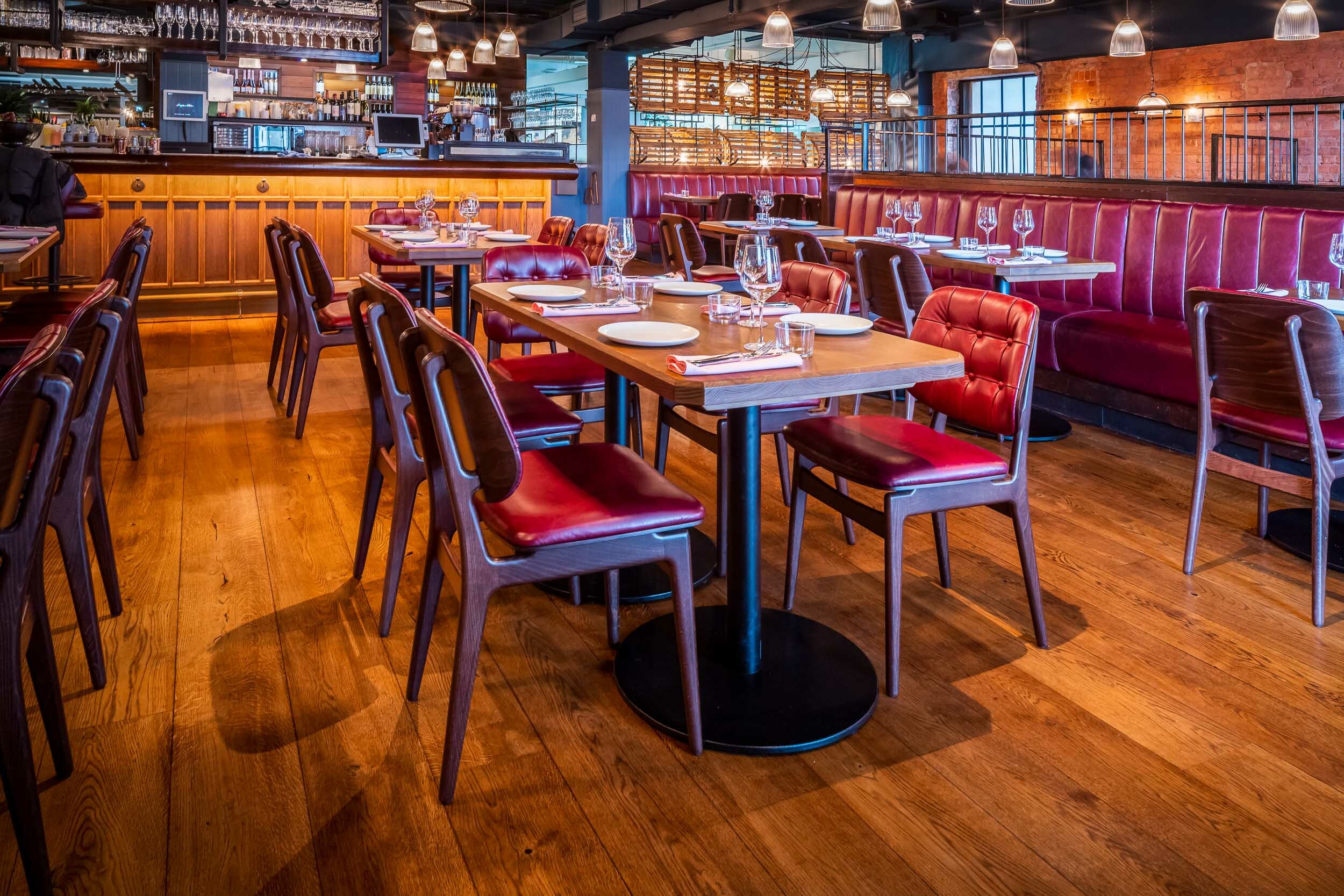 We supplied seating and tables as part of the new look interior, including our Chloe Side Chair and bespoke tables. The Chloe chair will be used at all locations - with a fully upholstered seat and back to keep customers comfortable throughout their visit, it’s a great choice for a hospitality venue. We added a bespoke touch, finishing the back with a buttoned detail which works brilliantly with the burgundy and smoke leather to give a contemporary, clubby feel.