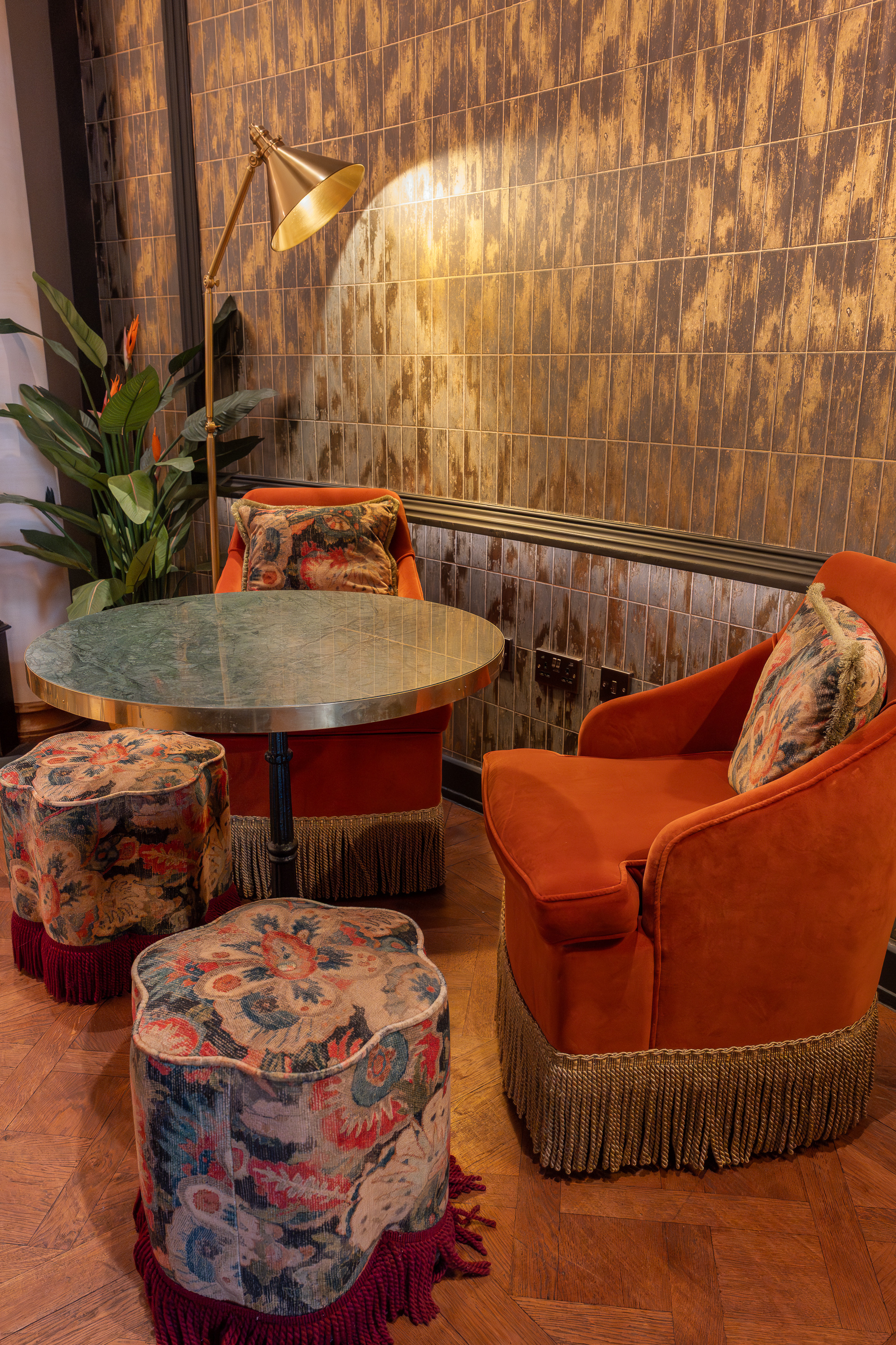 For the bar, Amy and Yvonne stools were specified with satin gold frames and a mix of Sunbury and Linwood fabrics, adding both texture and character to the space.
