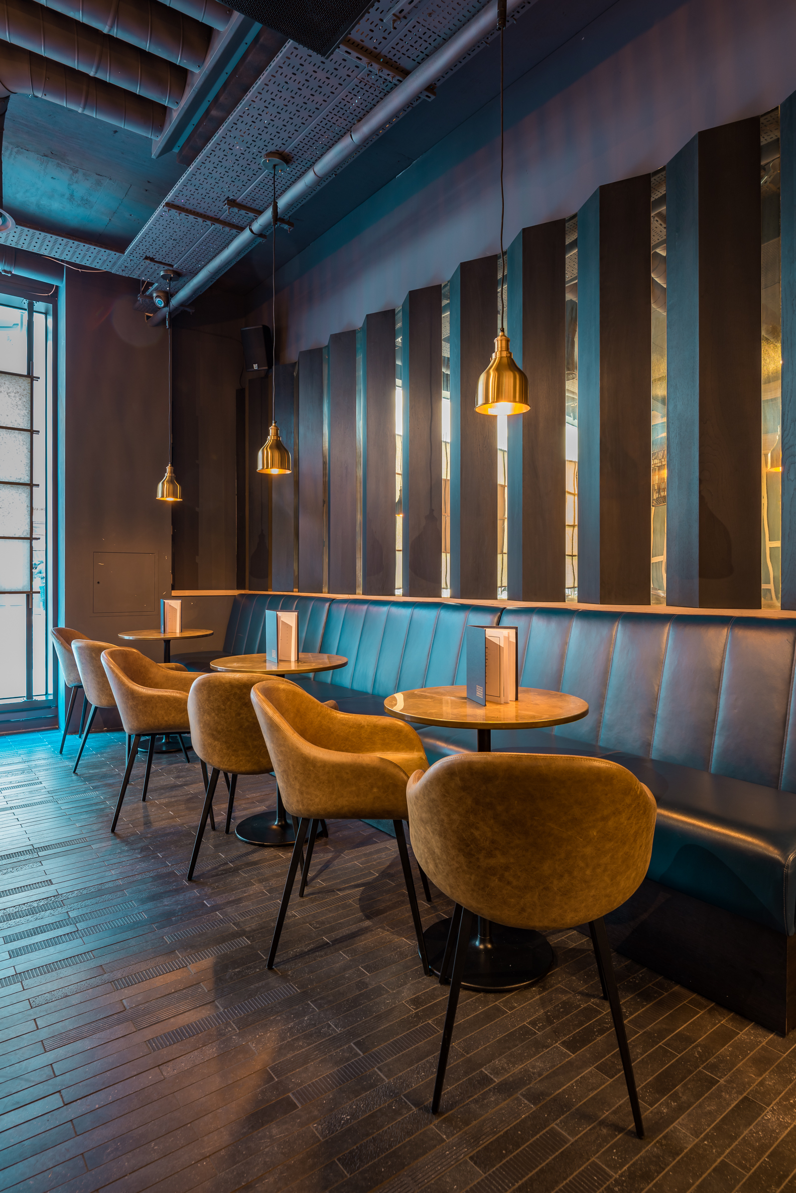 Our Sonny Bar Stools are upholstered in blue and tan leather, and together with the Sonny Armchair create a welcoming, laidback look that works perfectly with the aged brass table tops. Province bar stools at the high table add dimension to the dining space and cow horn chairs in the main dining area combine a fun, edgy look with real comfort and long-lasting craftsmanship.
