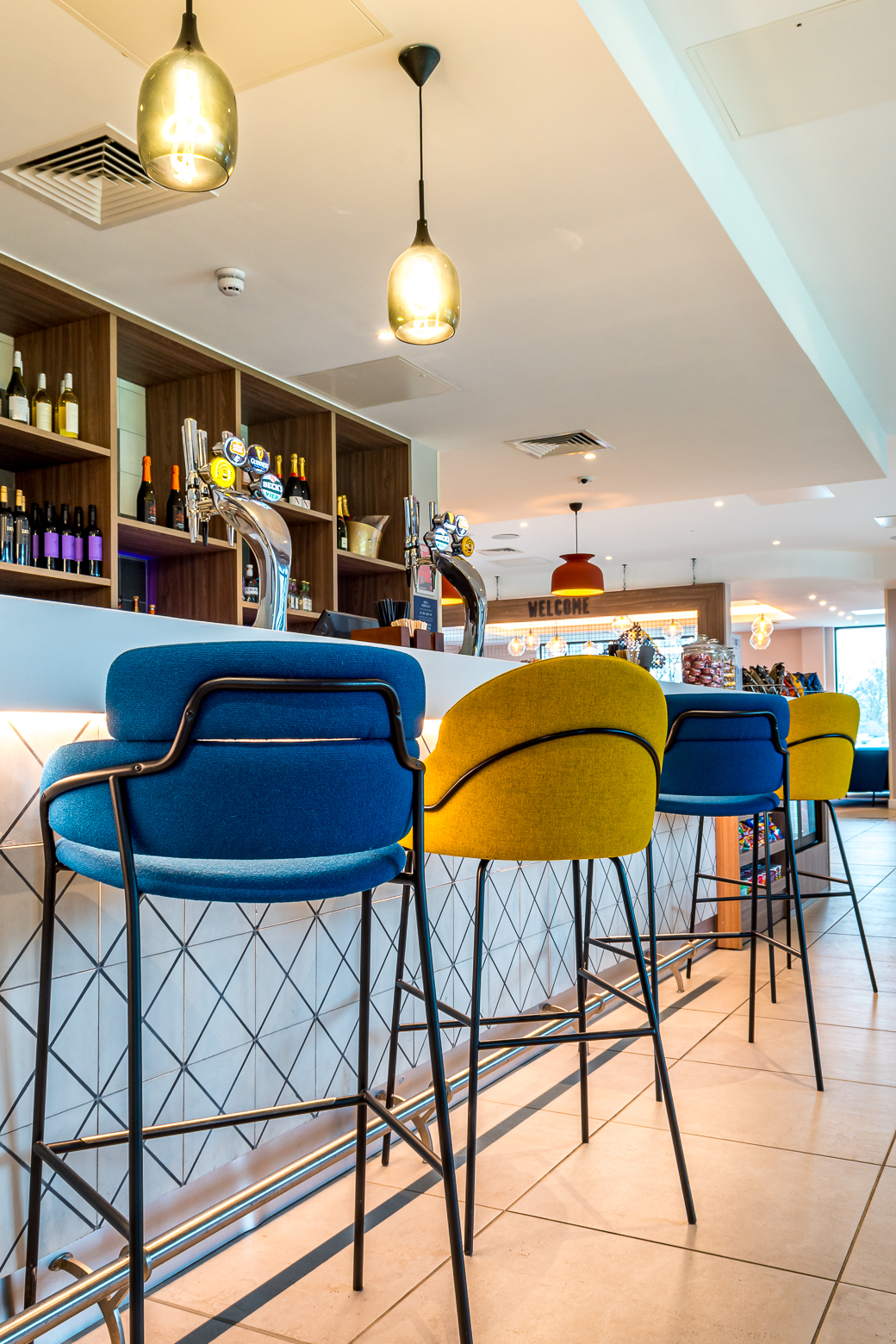 Our Strike Bar Stool sits perfectly in the hotel’s popular bar area. The soft, comfortable seat and back of the stool are upholstered in electric blue and bright sunshine yellow fabric, which contrasts with the sleek lines of the visible tubular steel frame - available in chrome, copper, brass titanium or painted steel.