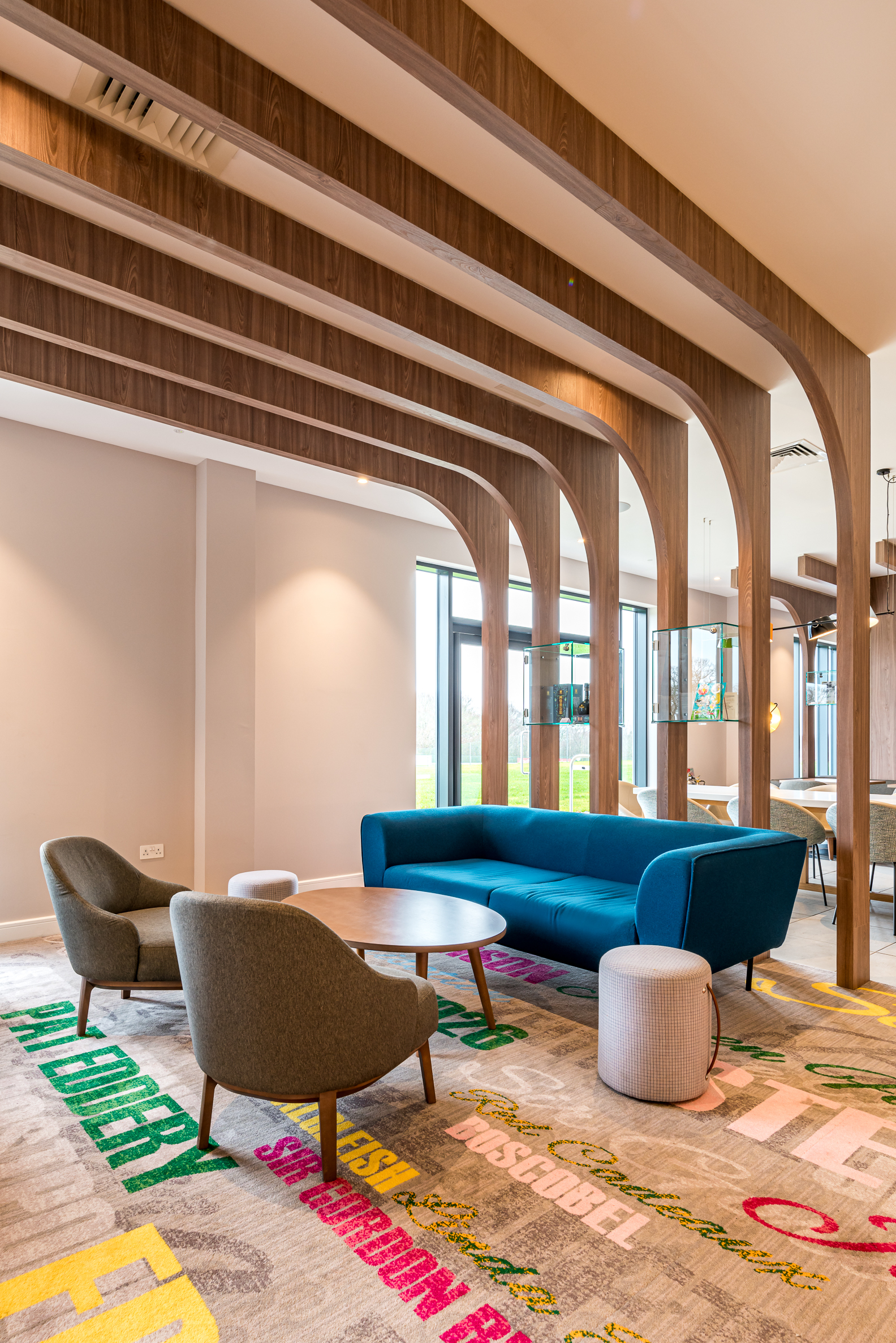 We loved working with ICA on this project to supply furniture throughout the public areas of the hotel - including our Tondina Side Chairs and Giulia Armchairs in the bar and restaurant and a beautiful bespoke sofa for the hotel lobby. Upholstered in Camira Mainline Plus, it sits perfectly alongside our bespoke pouf and lounge chair. The lounge chair was upholstered in Camira Rivet Twig - a really innovative fabric made from used plastic bottles.