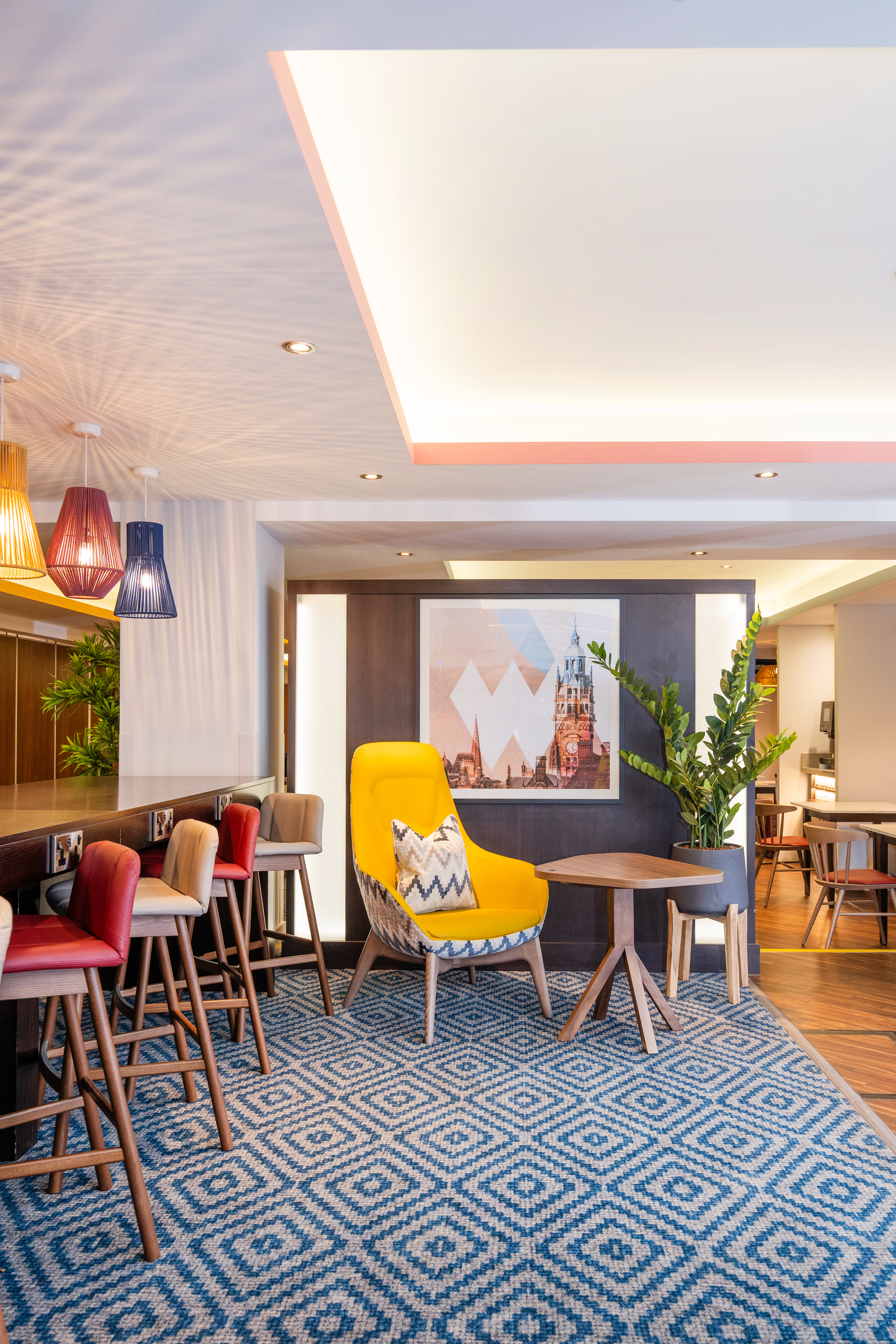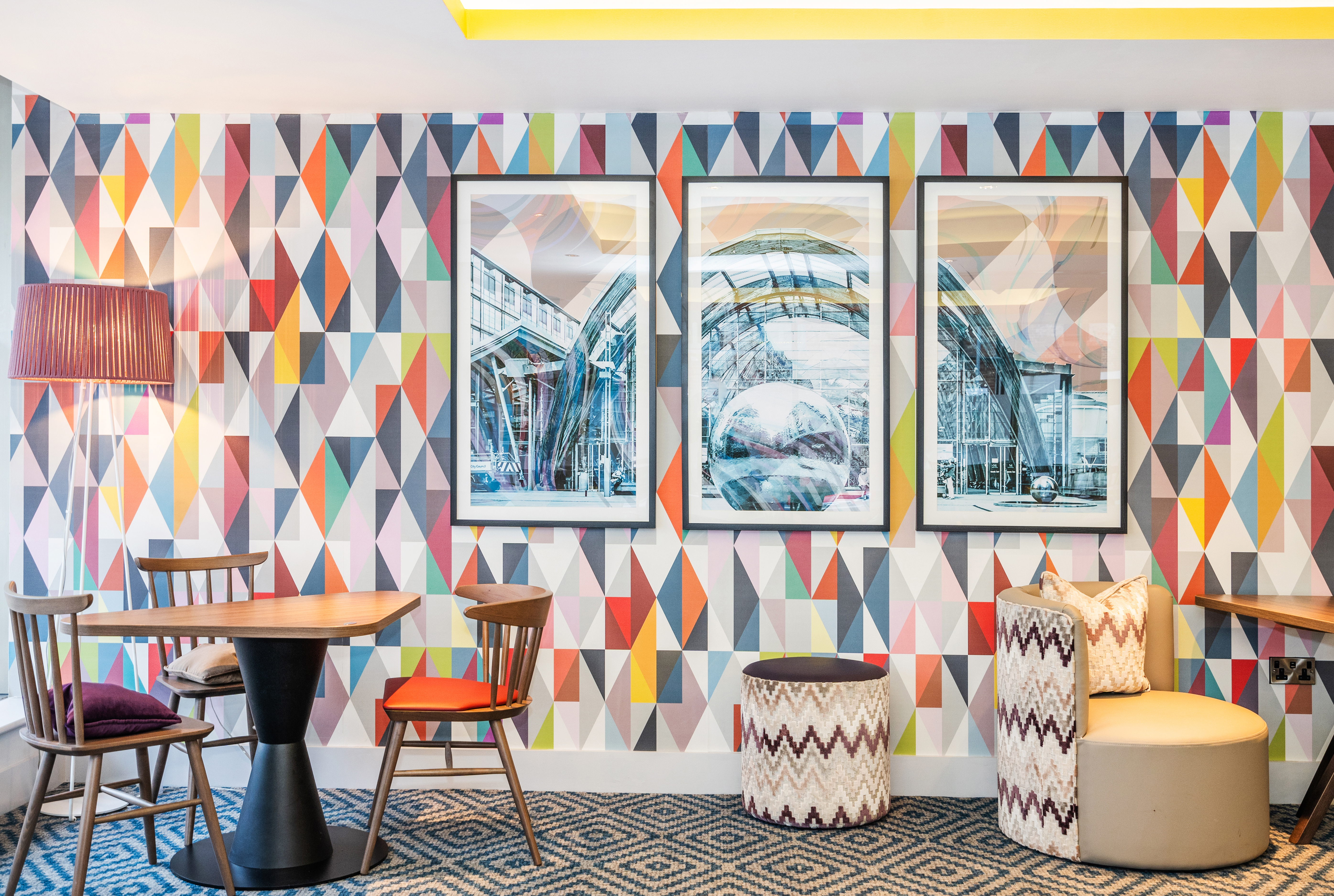 Our Cliff Lounge Chair and bespoke tub chair both feature in the public spaces upholstered in a striking geometric fabric and contrasting leather – clashing perfectly with the fun wallpaper.