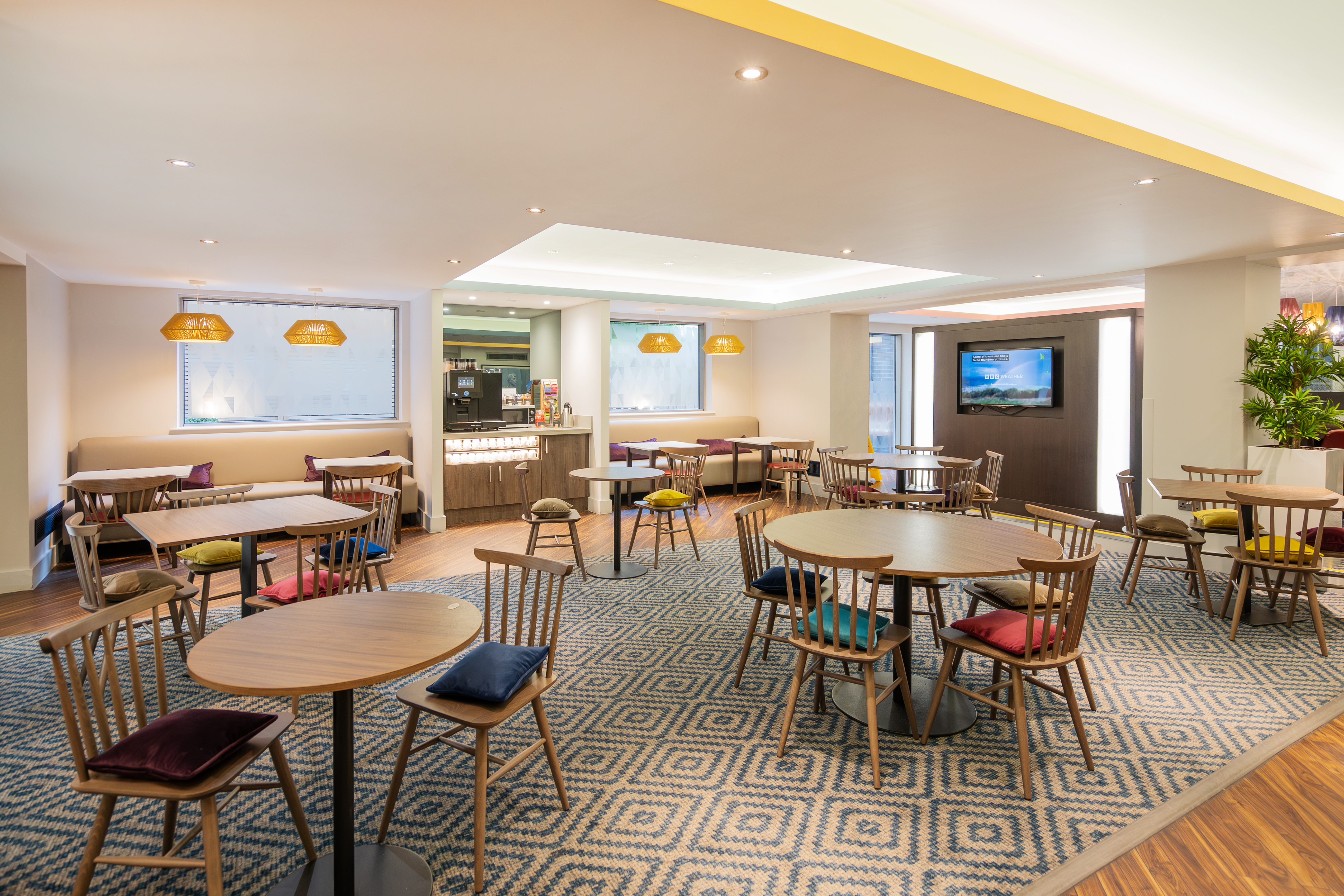 The bespoke bench seating takes pride of place in the hotel lobby. Upholstered in a rich, luxurious blue from Panaz, the curves emulate an ocean feel. Surrounding the eye-catching sofa are both dining tables and bespoke stools. The contrasting colours of the blue, grey, and yellow fabrics brighten the space making it light and inviting for guests.