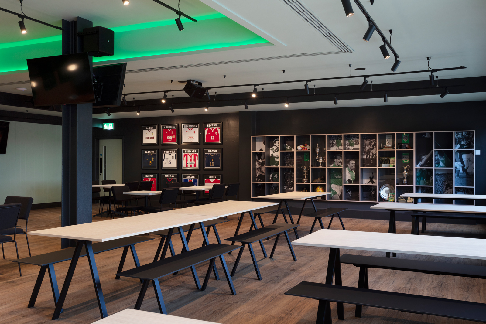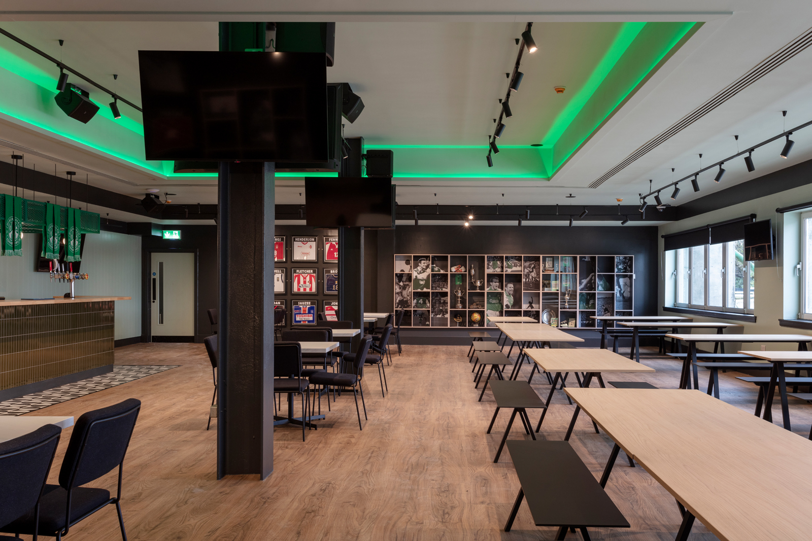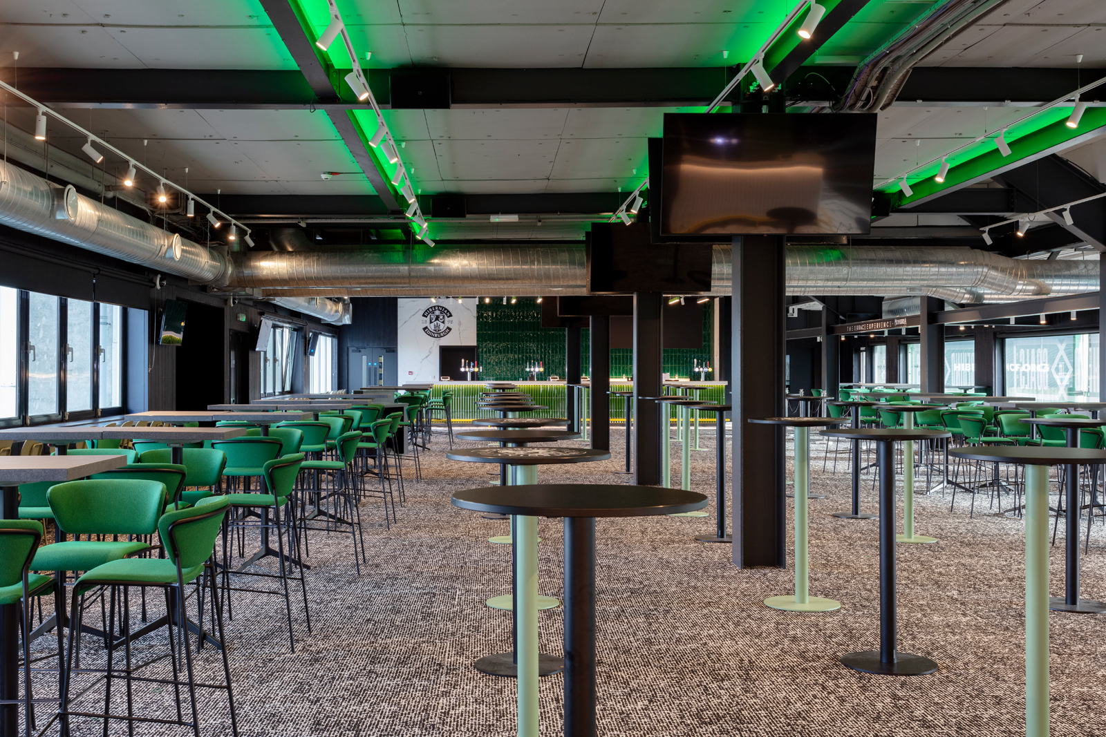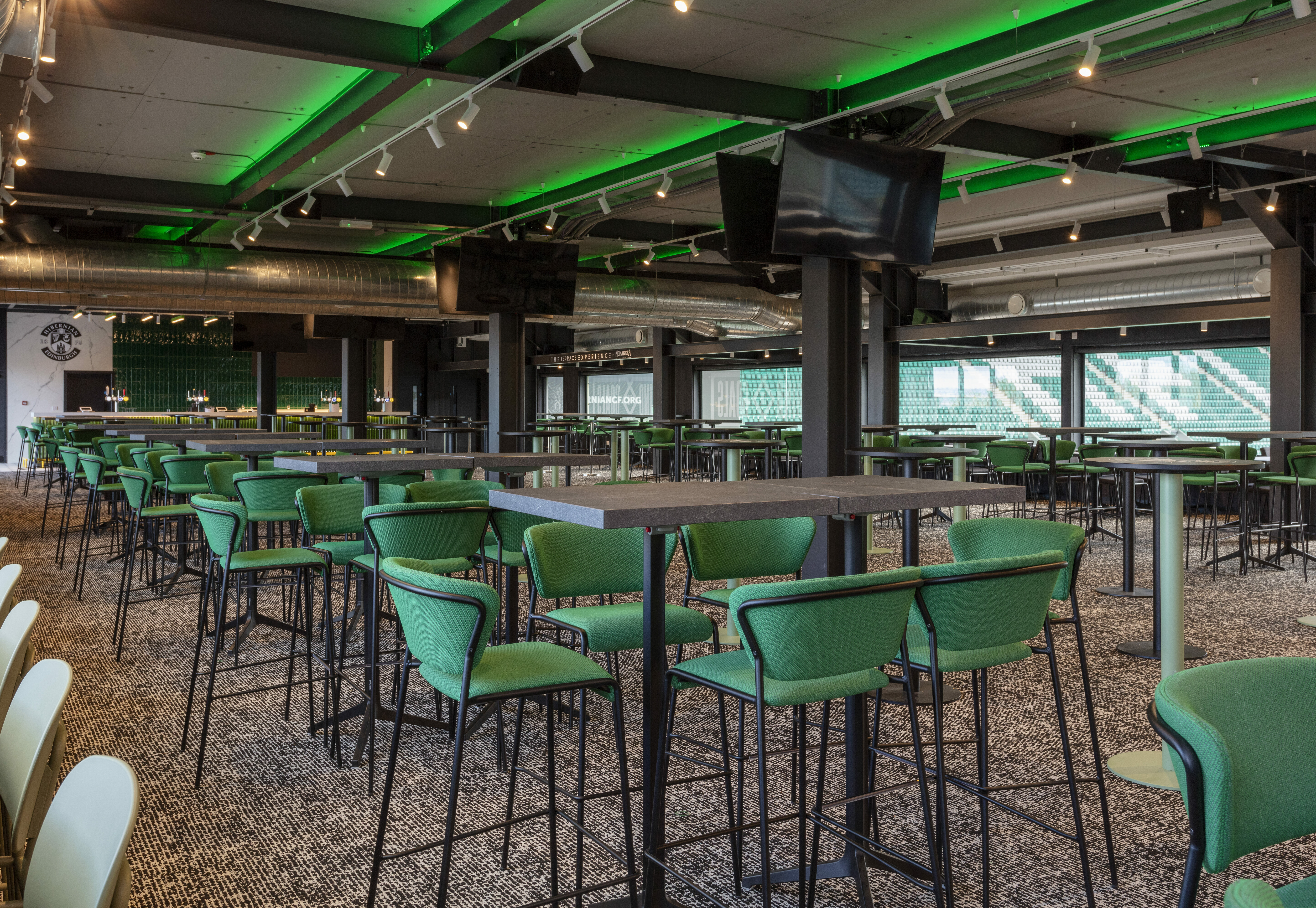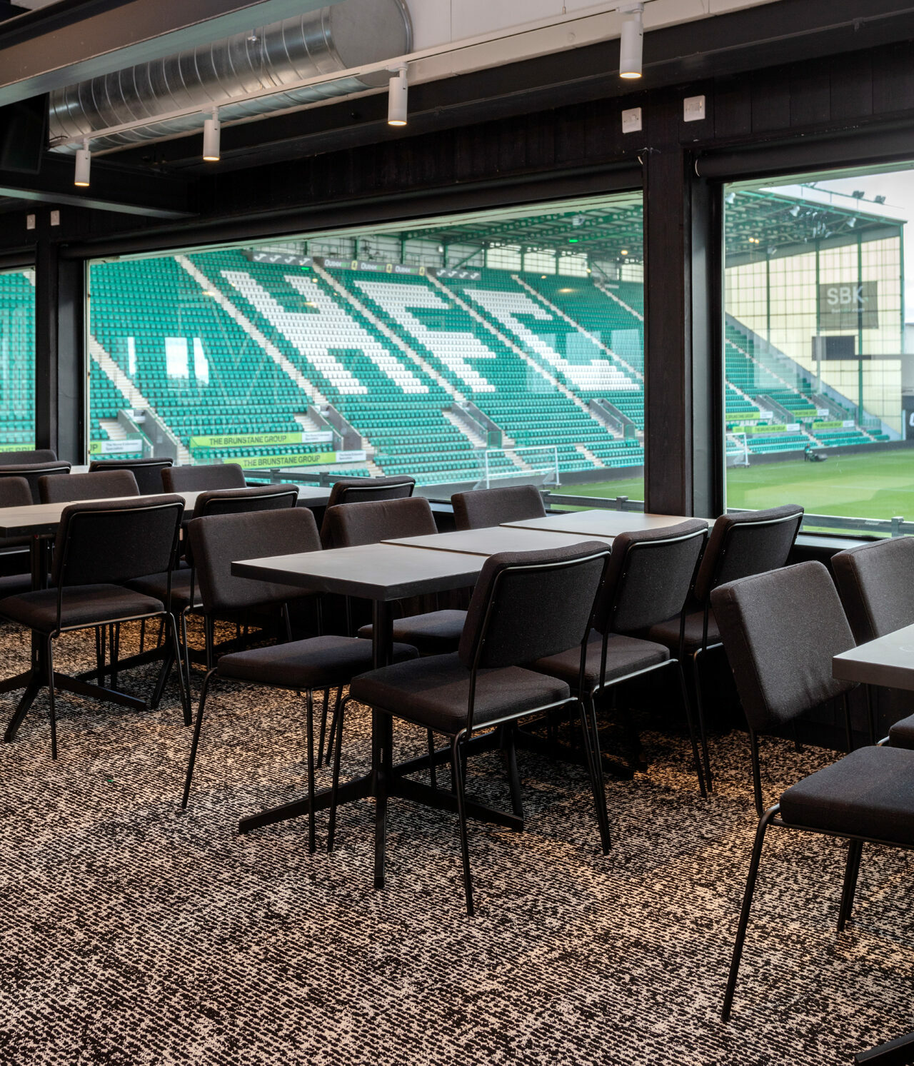 Located on the second floor of the club's Famous Five Stand - named after Hibs' most celebrated forward line - the hospitality lounge Behind The Goals offers a premium sports-bar setting for supporters to enjoy matches in style and comfort. It's also used for conferences and events throughout the year, so it was important that the furniture we supplied for this refurb could be easily reconfigured to suit different layouts.