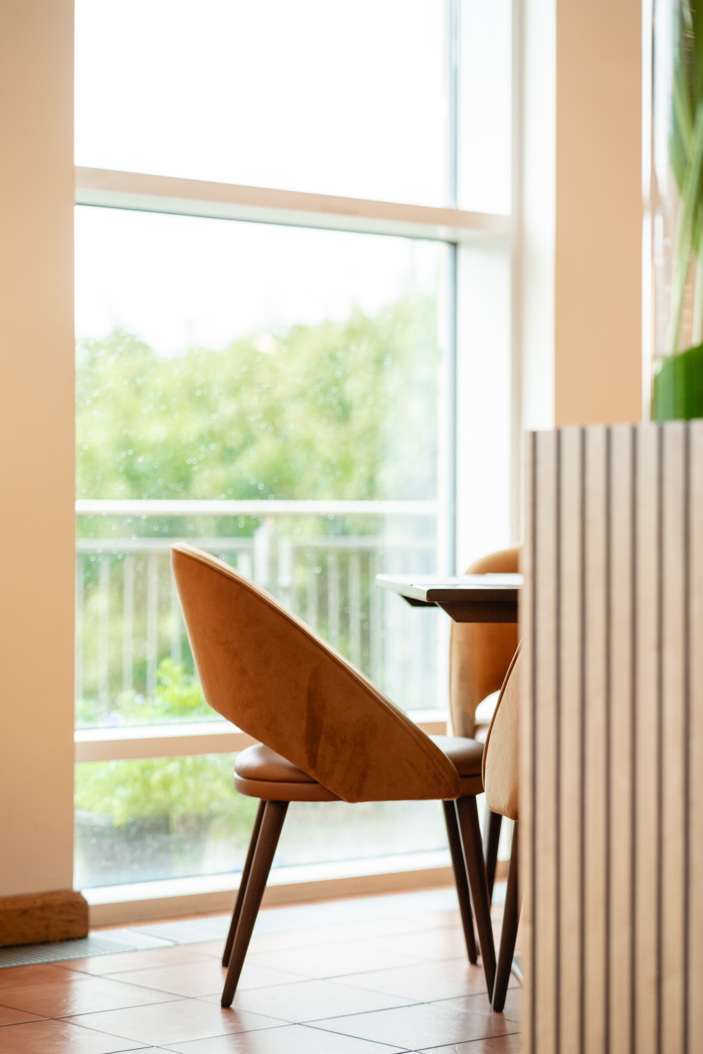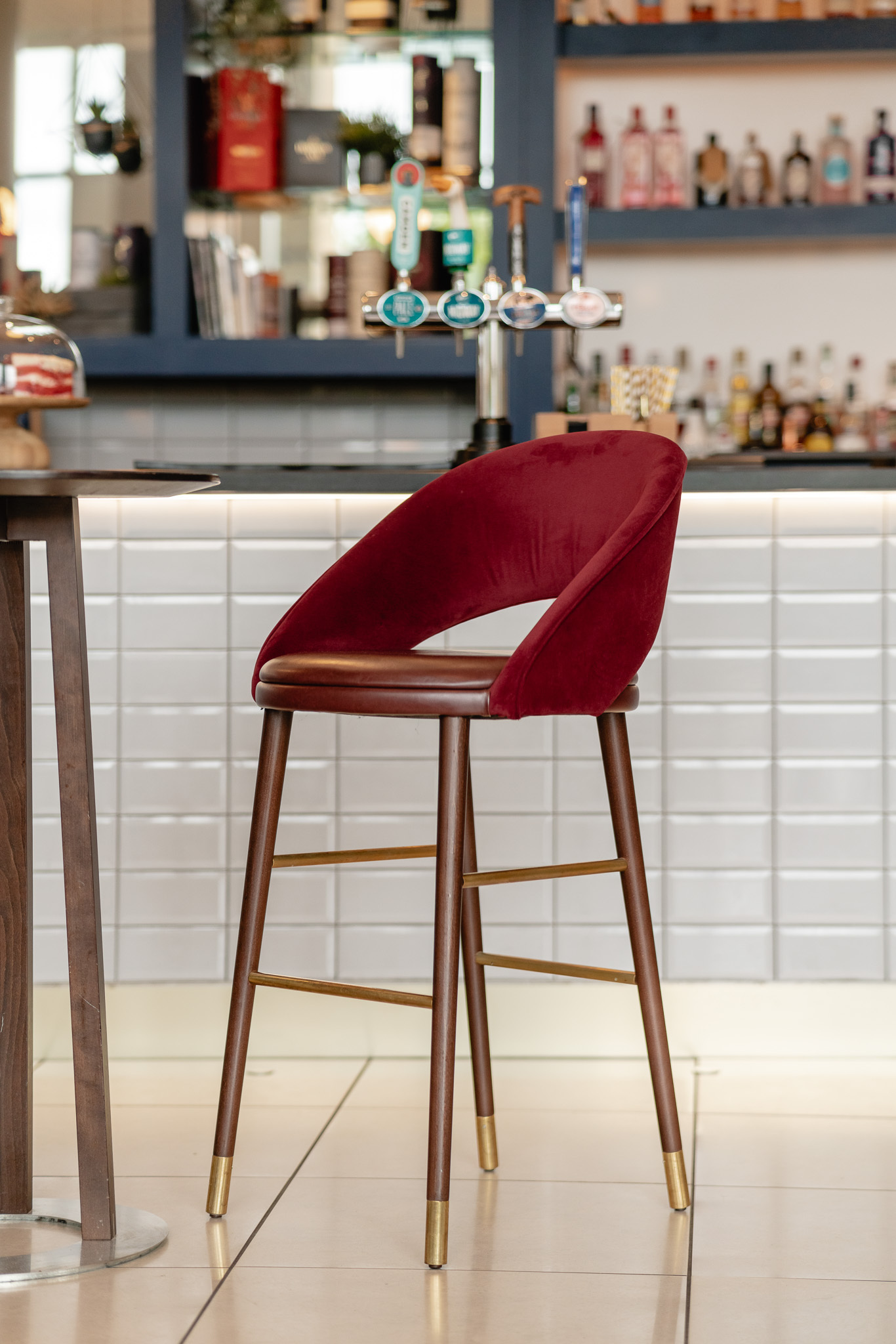 Our Sinatra Side Chair also appears in a warm ochre yellow which works well with our solid ash table tops. Bar Stools from the Sinatra collection are upholstered in a deep ruby-coloured leather and velvet fabric, adding warmth to the light and airy bar area and working well with our high bar tables.