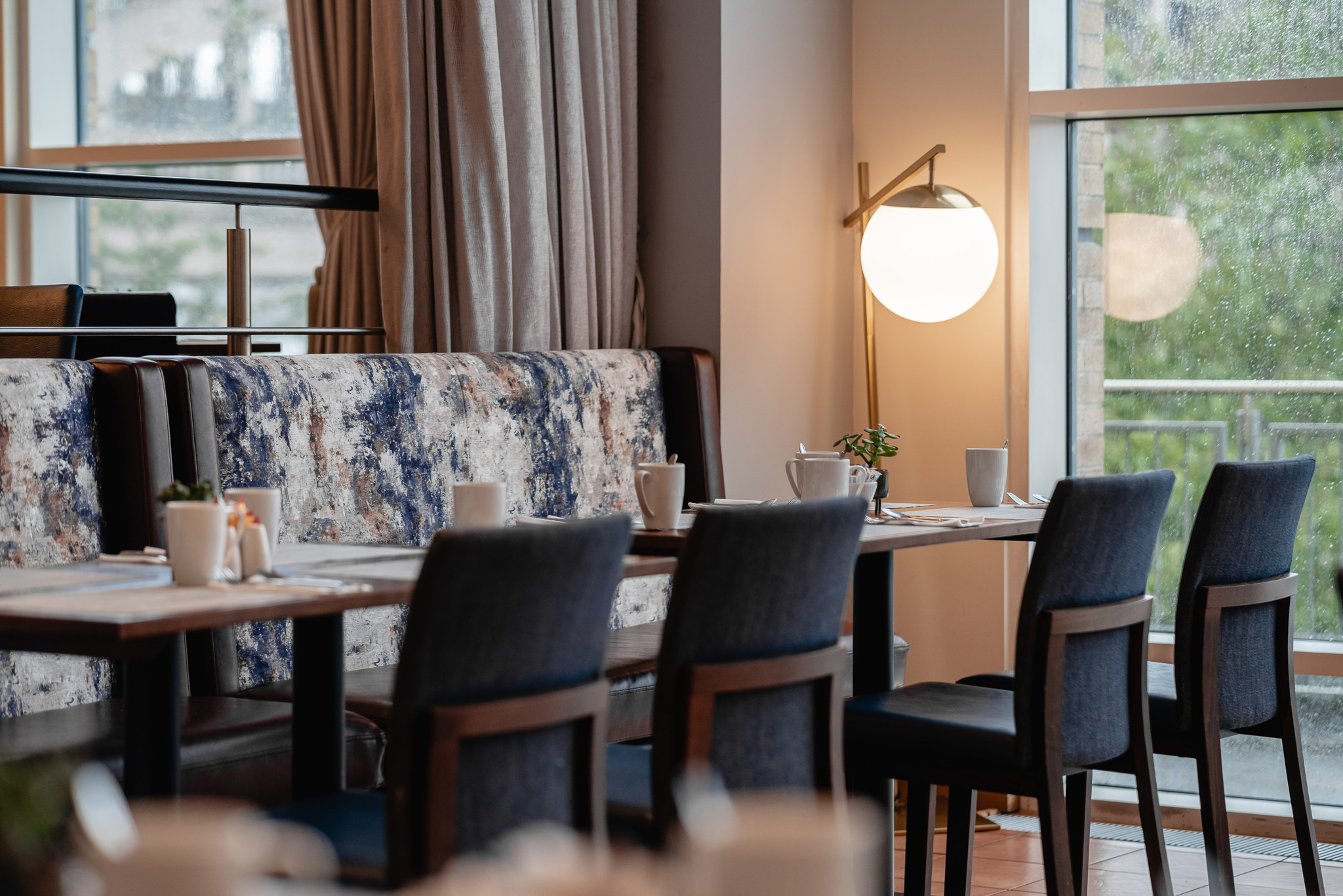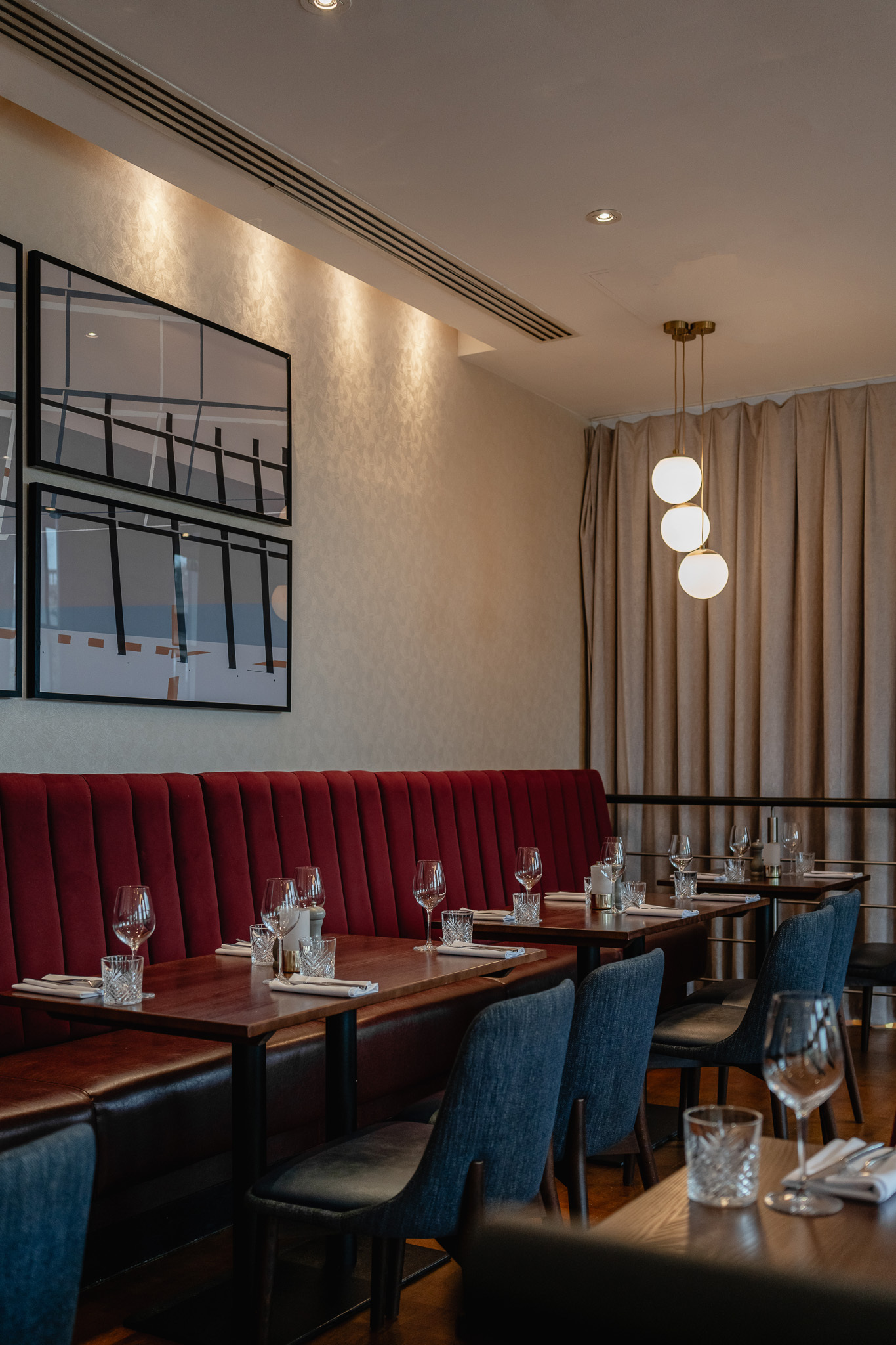 We always enjoy an opportunity to create bespoke pieces for a project, delivering something unique that's designed to the client's specifications. The hotel's riverside restaurant is a popular choice for guests and other diners, and needs to be able to cater for everyone from solo diners, families and friends through to large groups. Our bespoke banquette is upholstered in warm burgundy leather and an abstract patterned fabric which looks great alongside our Sinatra chairs in navy fabric and leather. The banquettes give the contemporary look of fixed seating but are moveable, allowing the restaurant operational flexibility in terms of changing layouts to respond to demand.