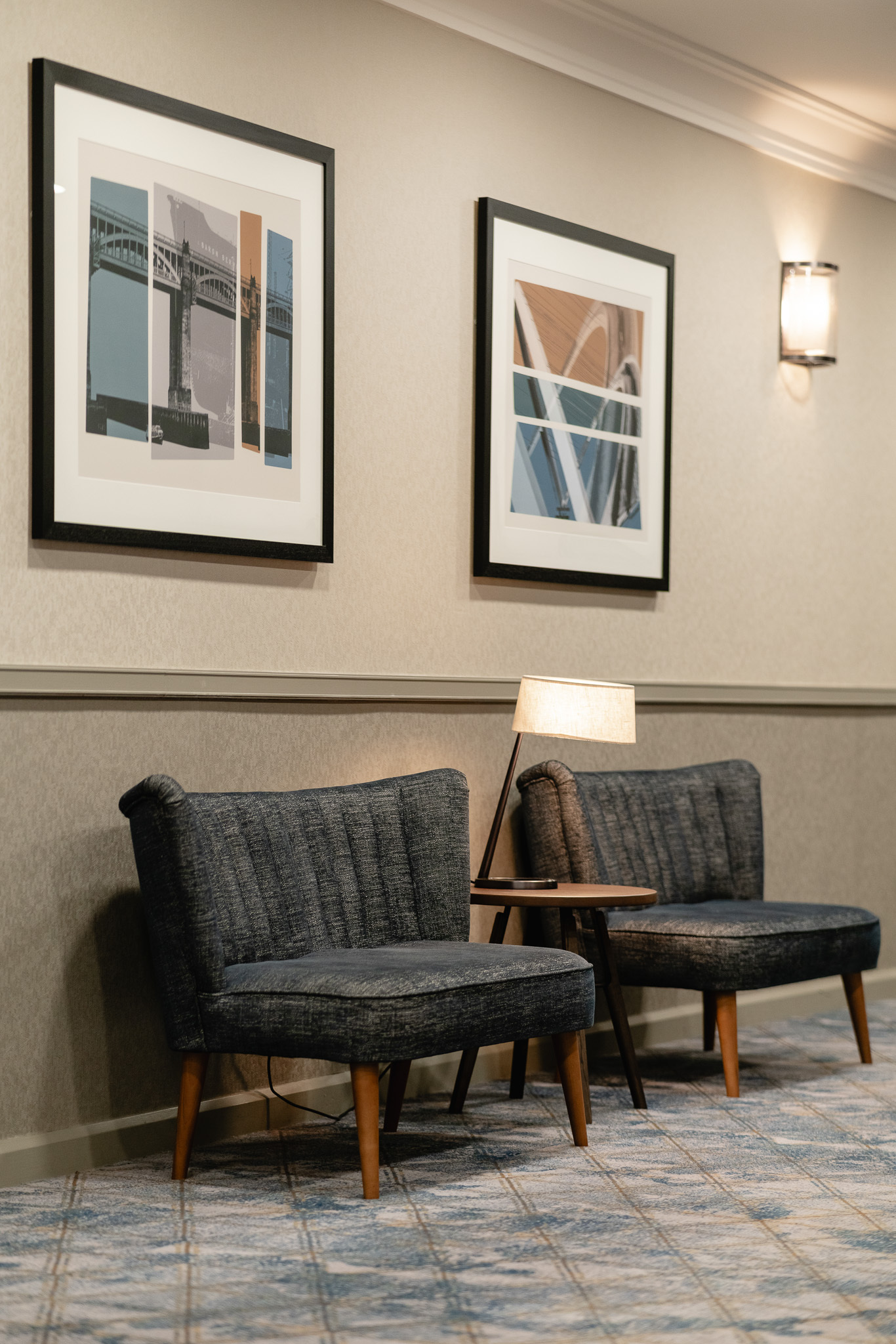 Meetings and events are a key part of the Hilton Newcastle Gateshead operation, hosting corporate events, conferences and meetings across a suite of rooms. We created a bespoke solid wood console table which adds an elegant touch to this area of the hotel, and supplied our Luna Sofa to provide additional seating for delegates and event guests. This is a compact, stylish piece with mid-century influences. Upholstered in a smart slate blue with stitched details on the back, it's another practical addition to the interior that adds interest and warmth to a busy space.