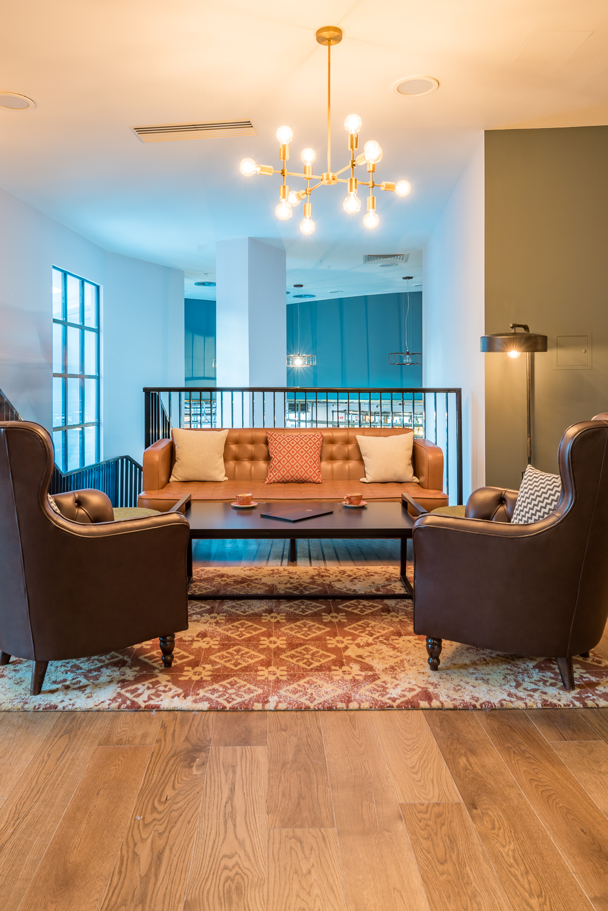 Several bespoke pieces were created for Hotel Indigo, including plush velvet wing lounge chairs and sleek lobby leather sofas to set a stylish note on arrival.