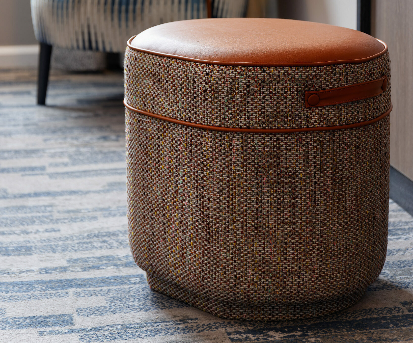 We’re always delighted to have an opportunity to create bespoke pieces for projects - bespoke furniture gives you something made-to-measure, with added design details to suit your space and style. In this case, we created a beautiful bespoke stool, fully upholstered in a beautiful textured weave fabric from Clarke & Clarke and finished with the Panaz piping used elsewhere.