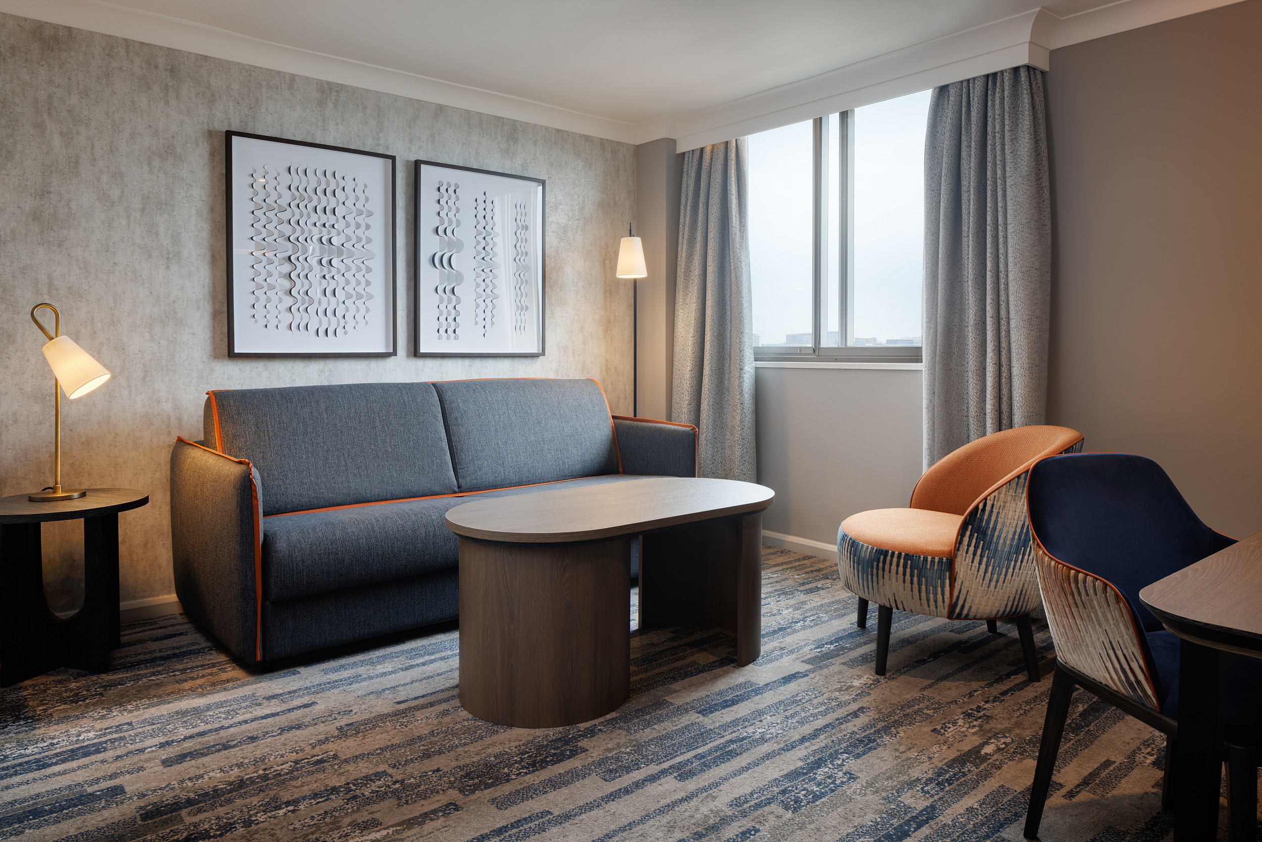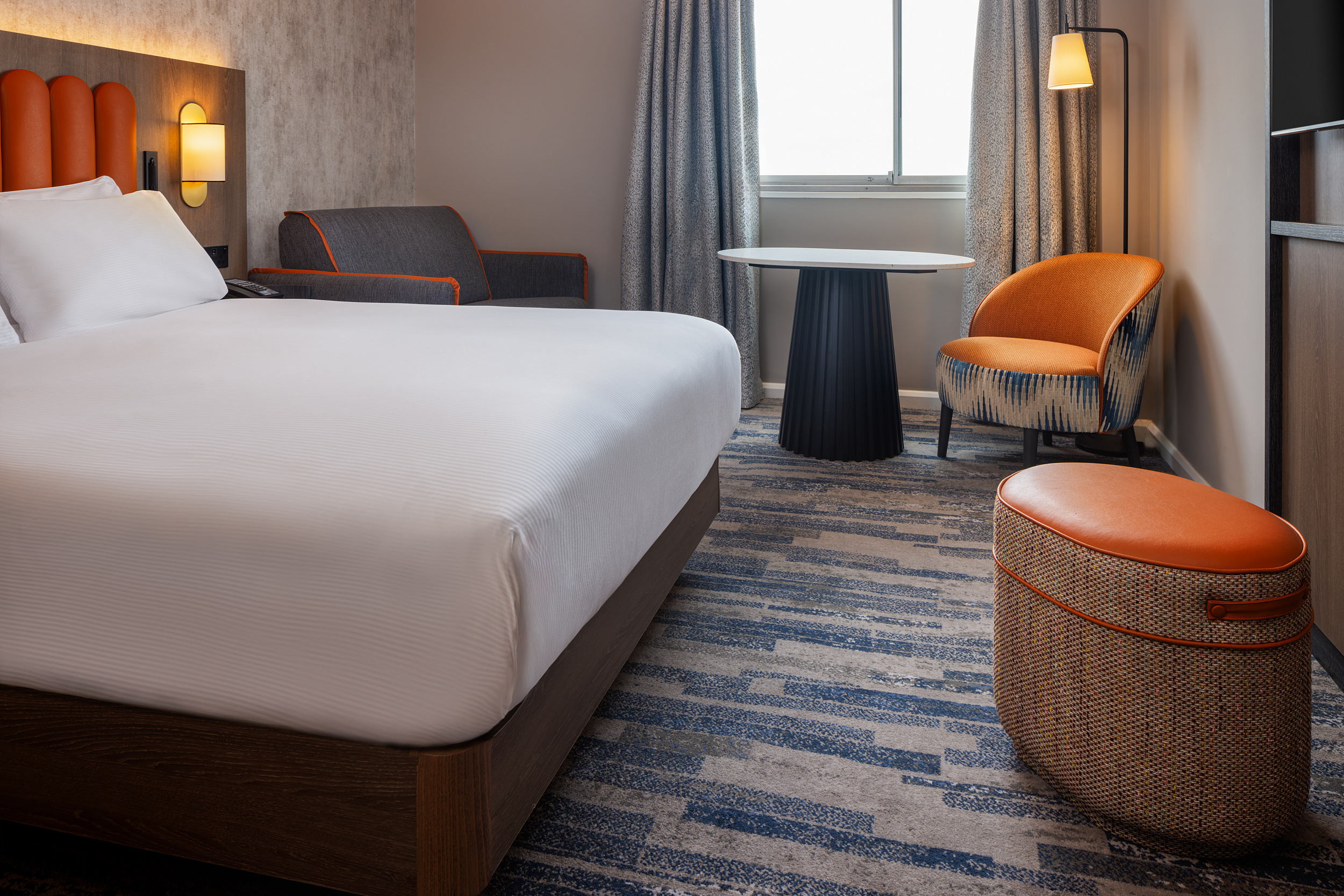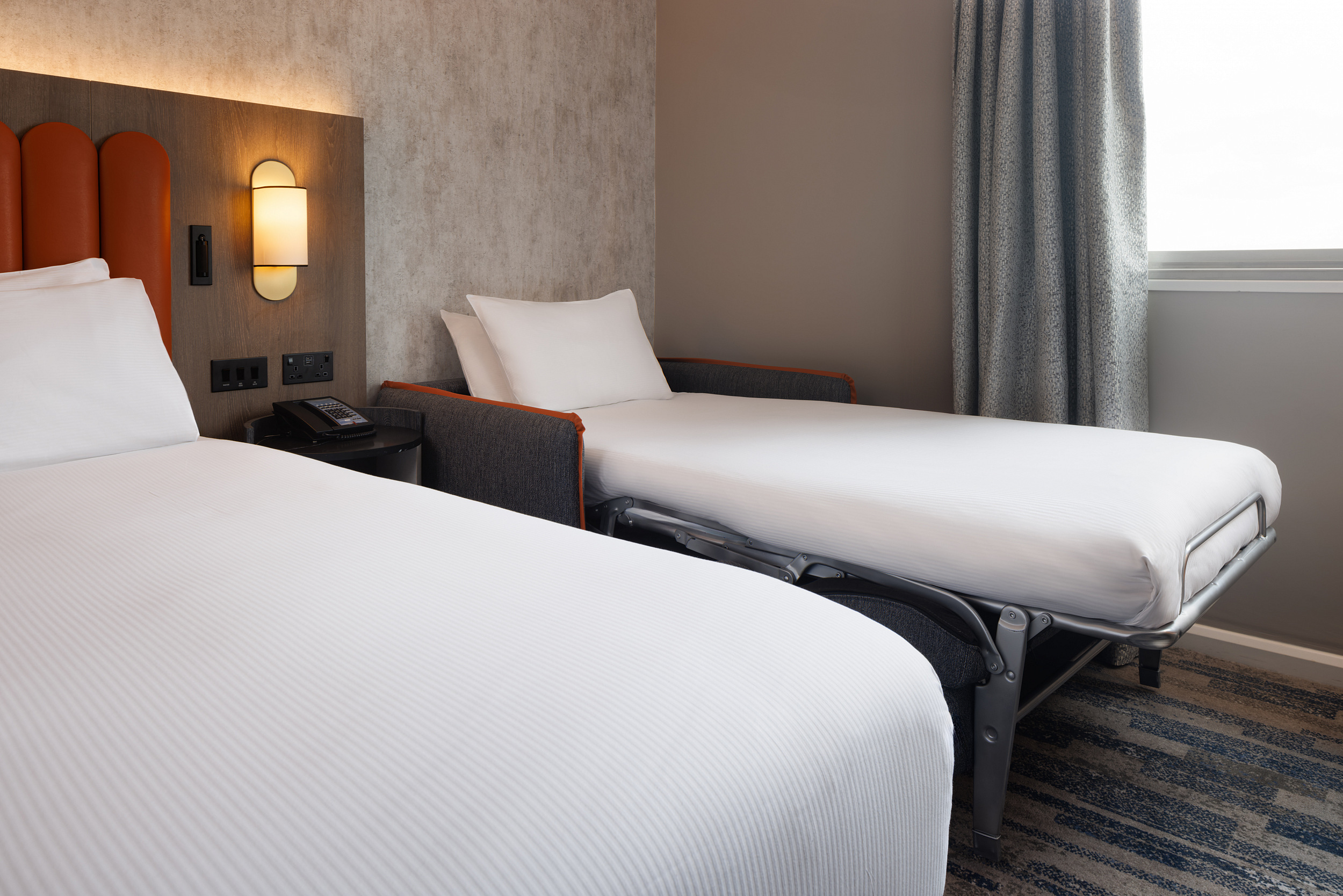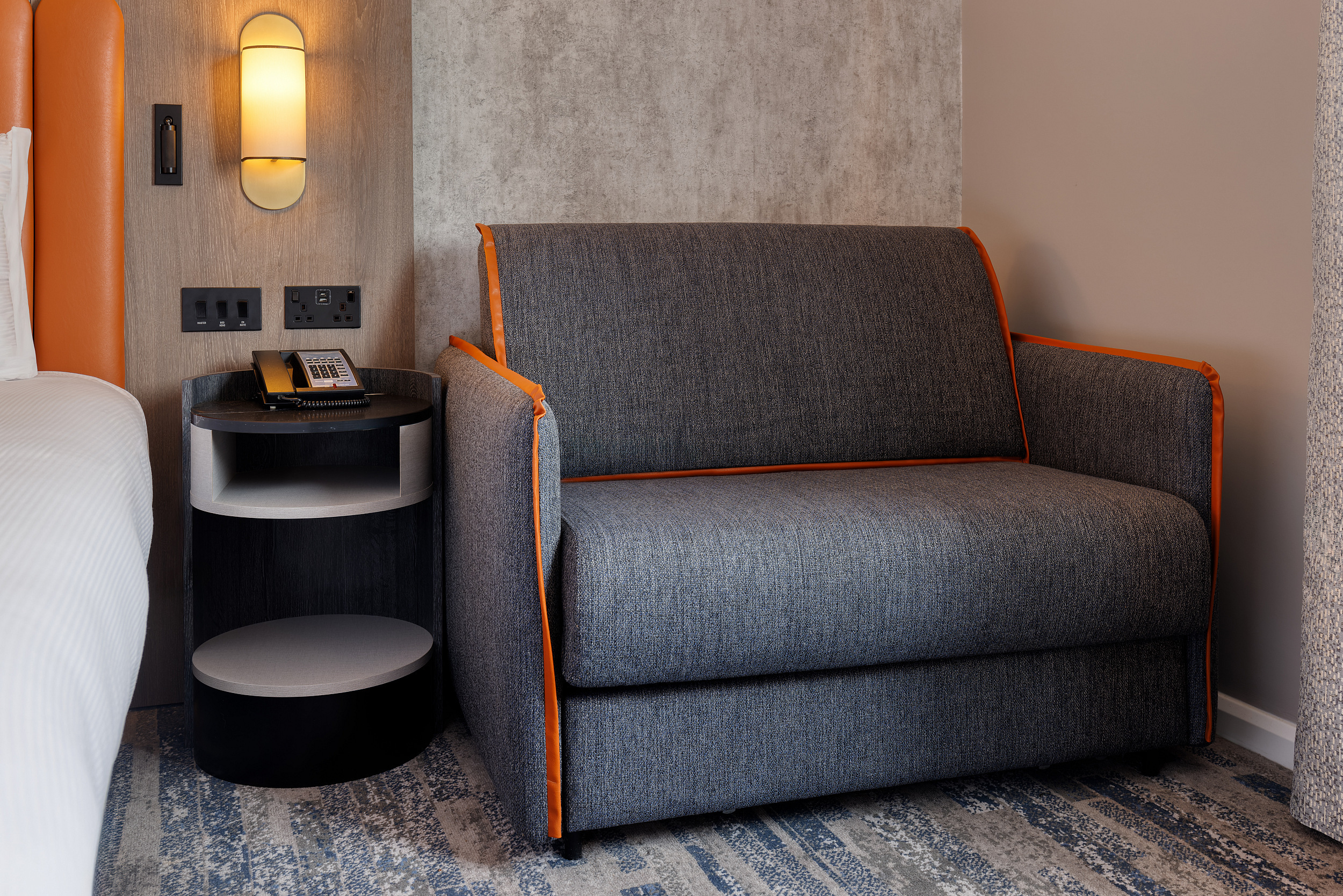 The piping is a key feature of our Mamba Sofa Bed, which we supplied in two sizes - a practical addition to the Leeds City hotel bedrooms that looks great. Sofa beds are increasingly popular for hotel interiors, allowing operators to accommodate additional guests and make their space work flexibly when required.