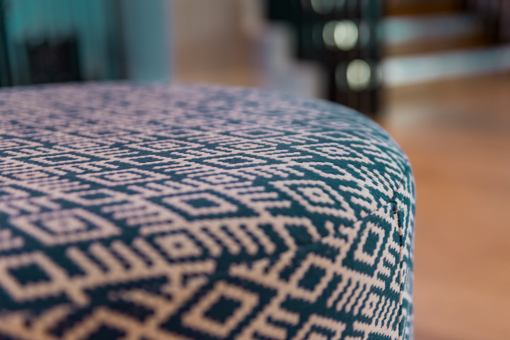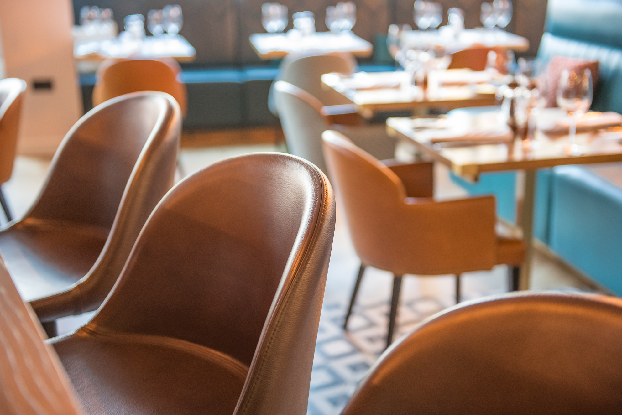 Our Elle bar stools sit beautifully against the main bar area, and the mix of deep blue green leather, dark wood and brass buttons and footrest give the stool a luxurious feel. On the other side of the room, our Louvre stools stand against a high chef’s table. Upholstered in teal velvet with a beautiful fluting on the back, they bring a real elegance to the interior.