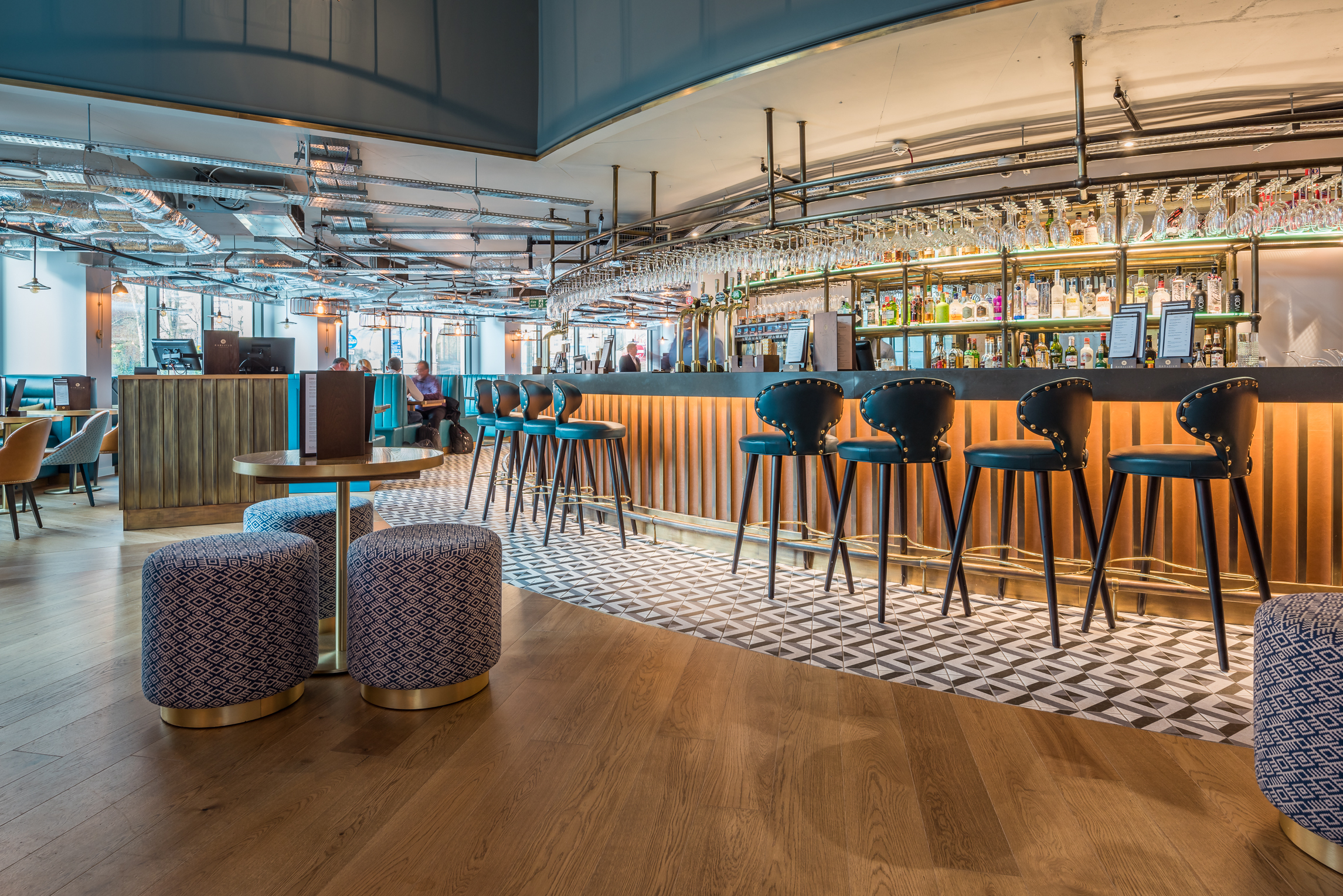 Mixing different heights works well to add interest to an interior, so our high table with Silestone top combined with the Joe bar stools to give the space another dimension. The teal upholstery picks up the colour palette used throughout Hotel Indigo, creating a seamless, unified feel.
