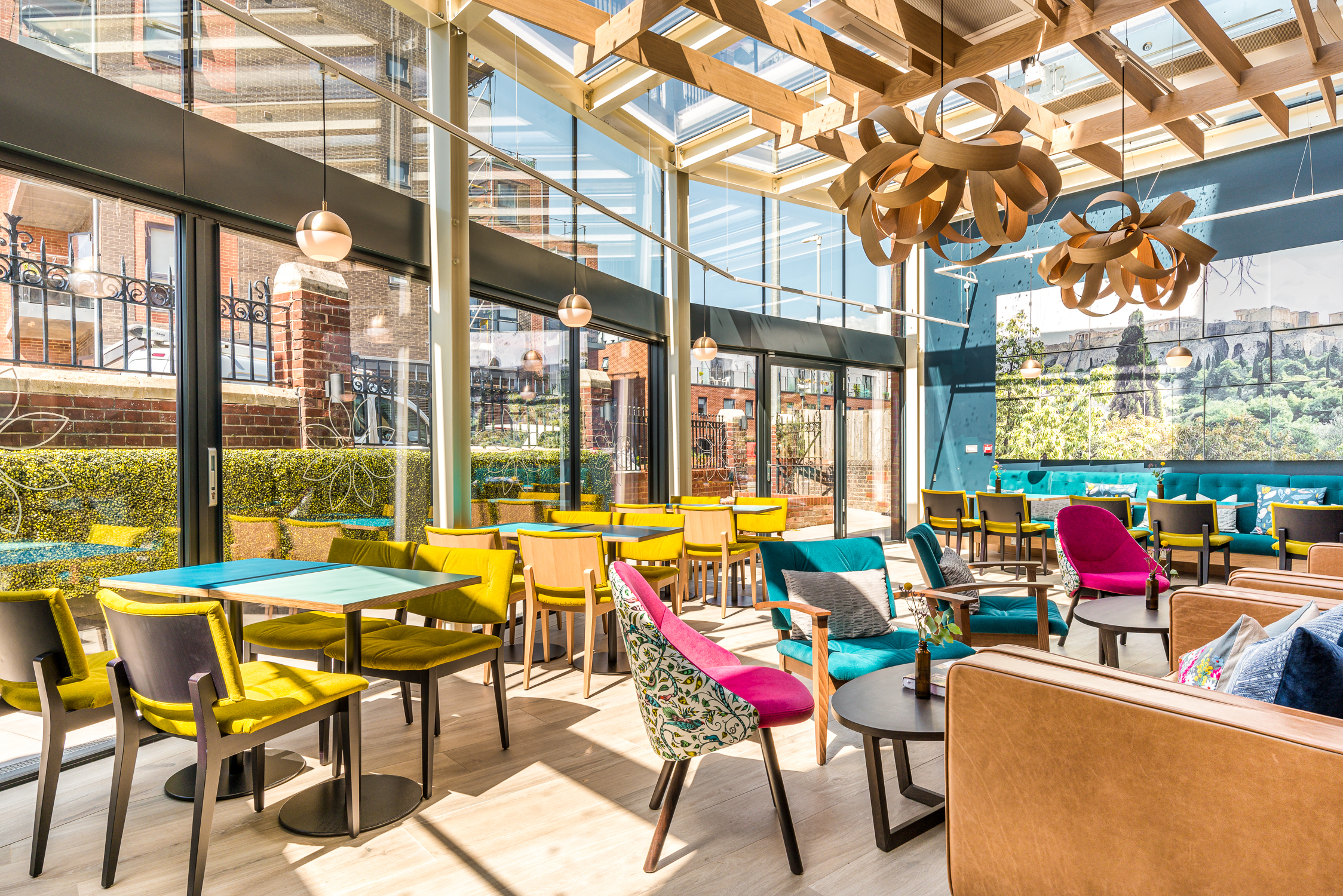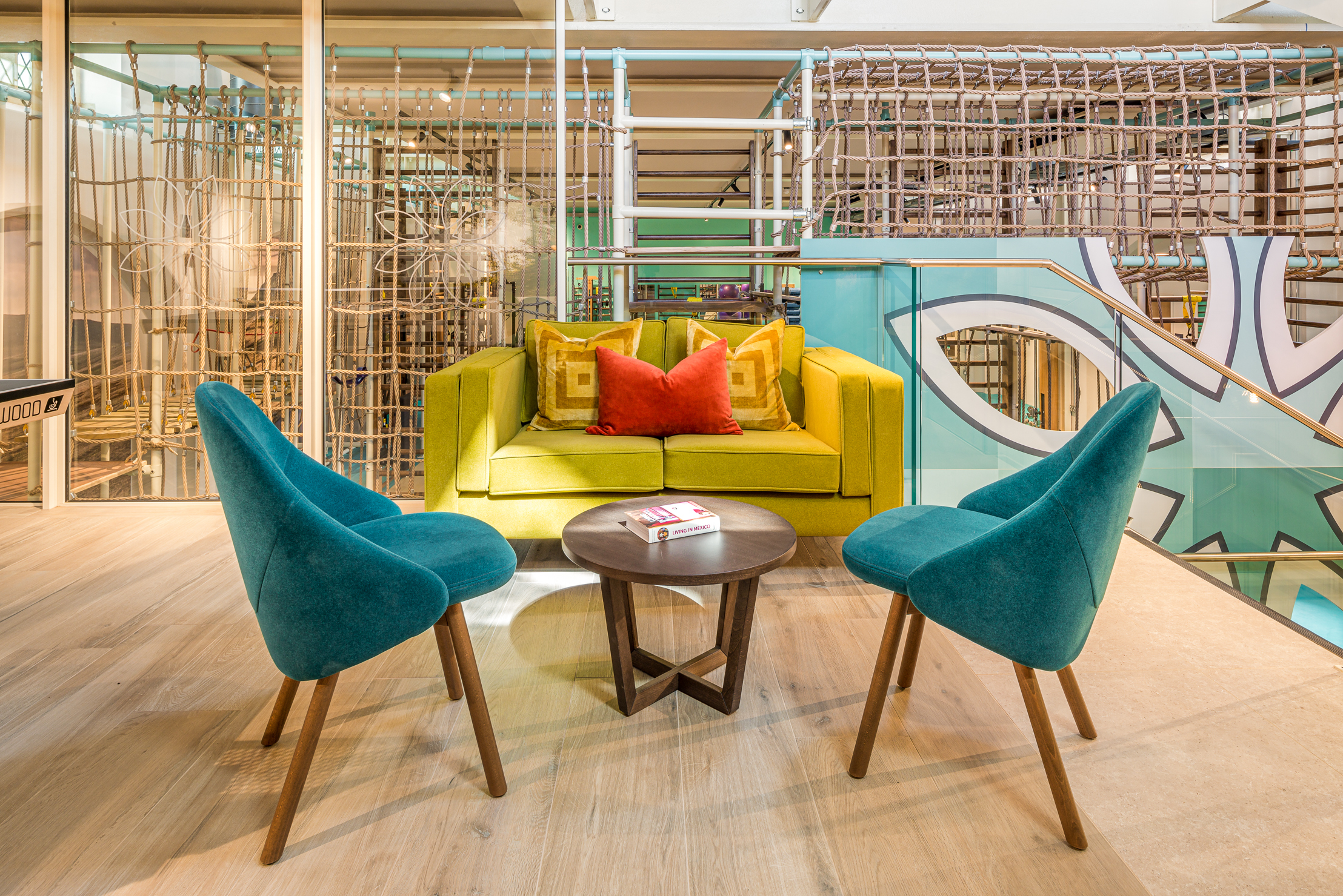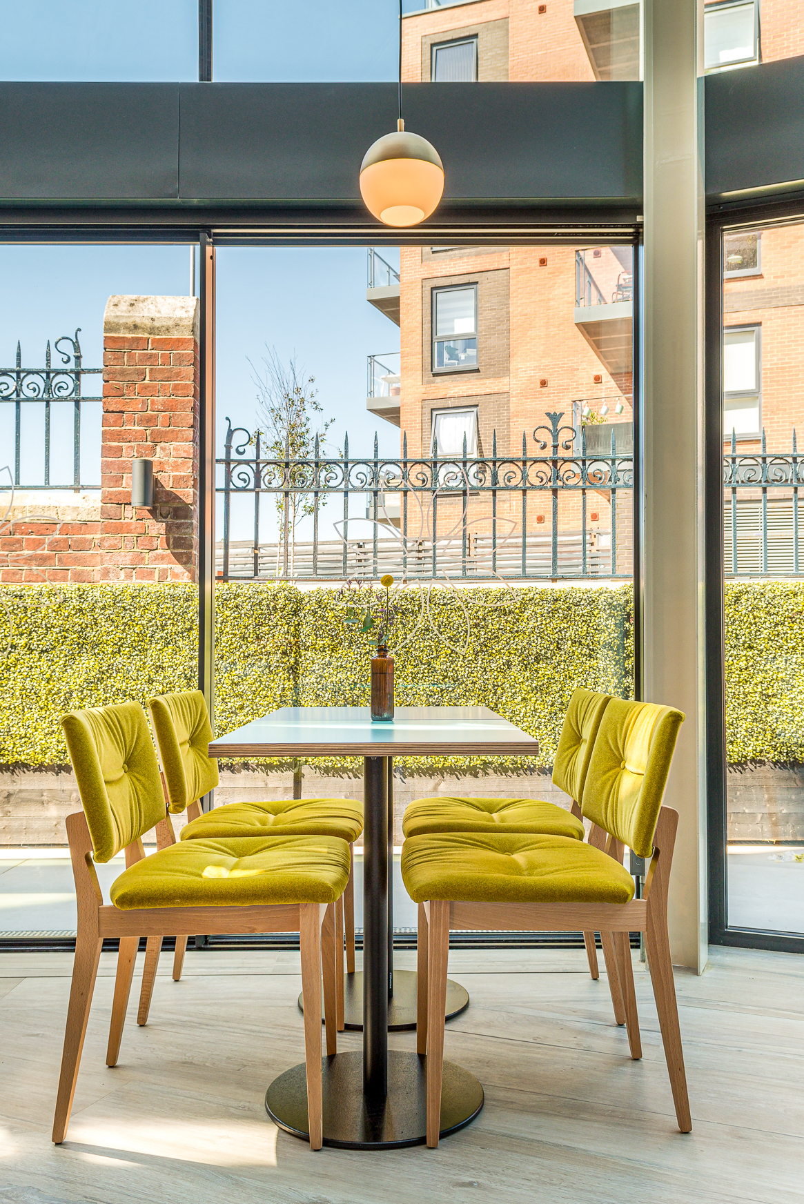 Our Eileen chair appears throughout the venue - in lounge chair and armchair versions, upholstered in a variety of bold colours, from acid yellow in the light-filled café to vivid teal in the members’ lounge. Our Alba Side Chair looks great in the same punchy colours in various locations, plus a sleek chocolate nubuck and a striking split-upholstered version.
