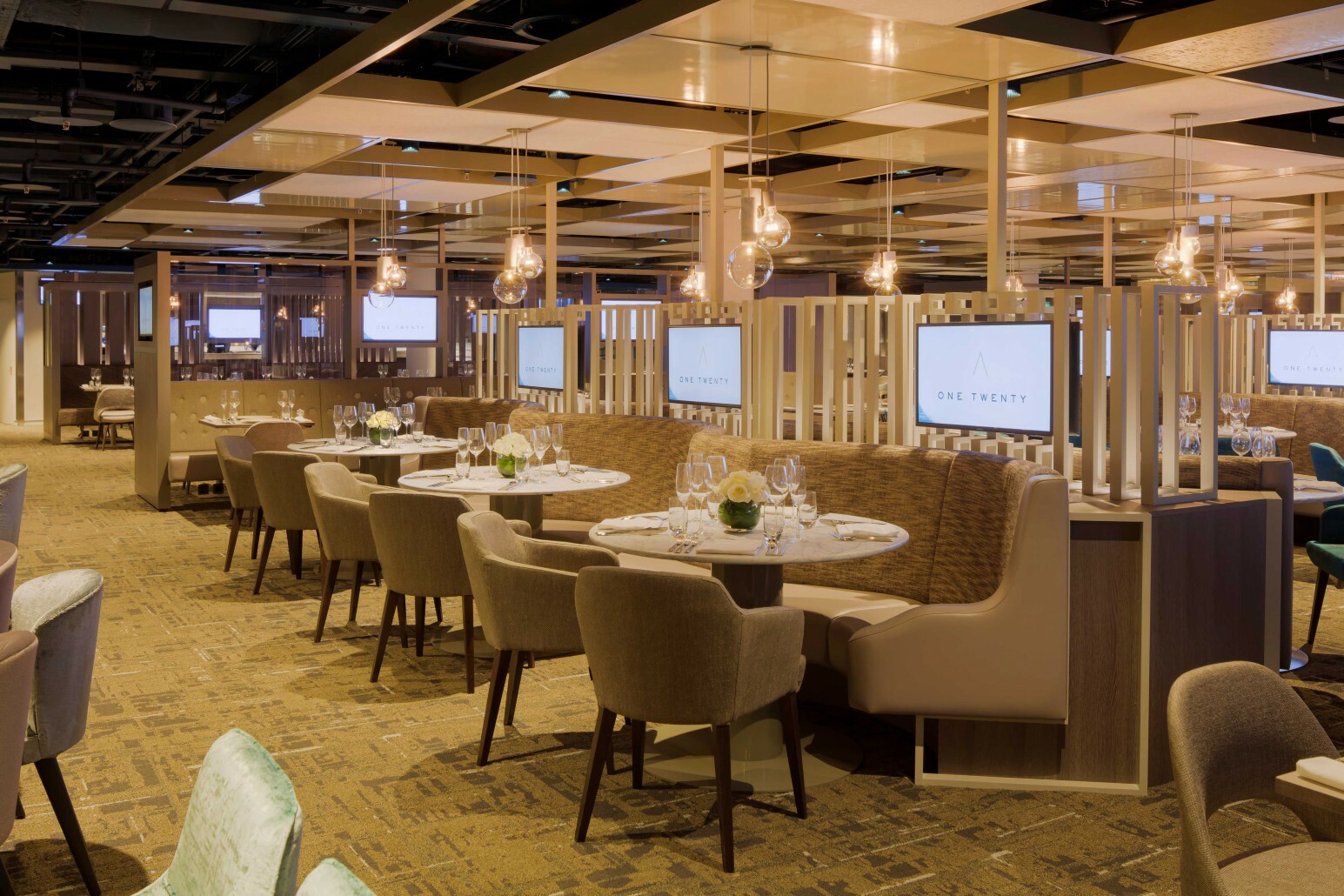 We created a bespoke table base to match beautiful white marble tops. These were produced using the PerfectSense Topmatt Laminate, which has a super matt, warm and velvety texture with anti-fingertip effect, adding to the luxurious feeling of the One Twenty Club.