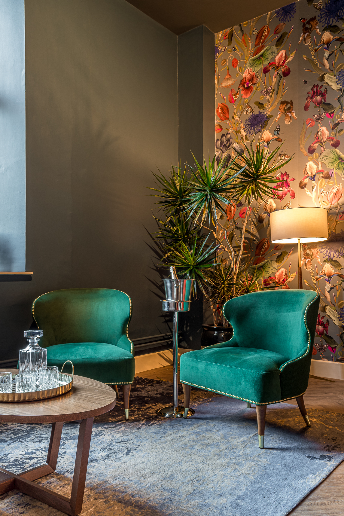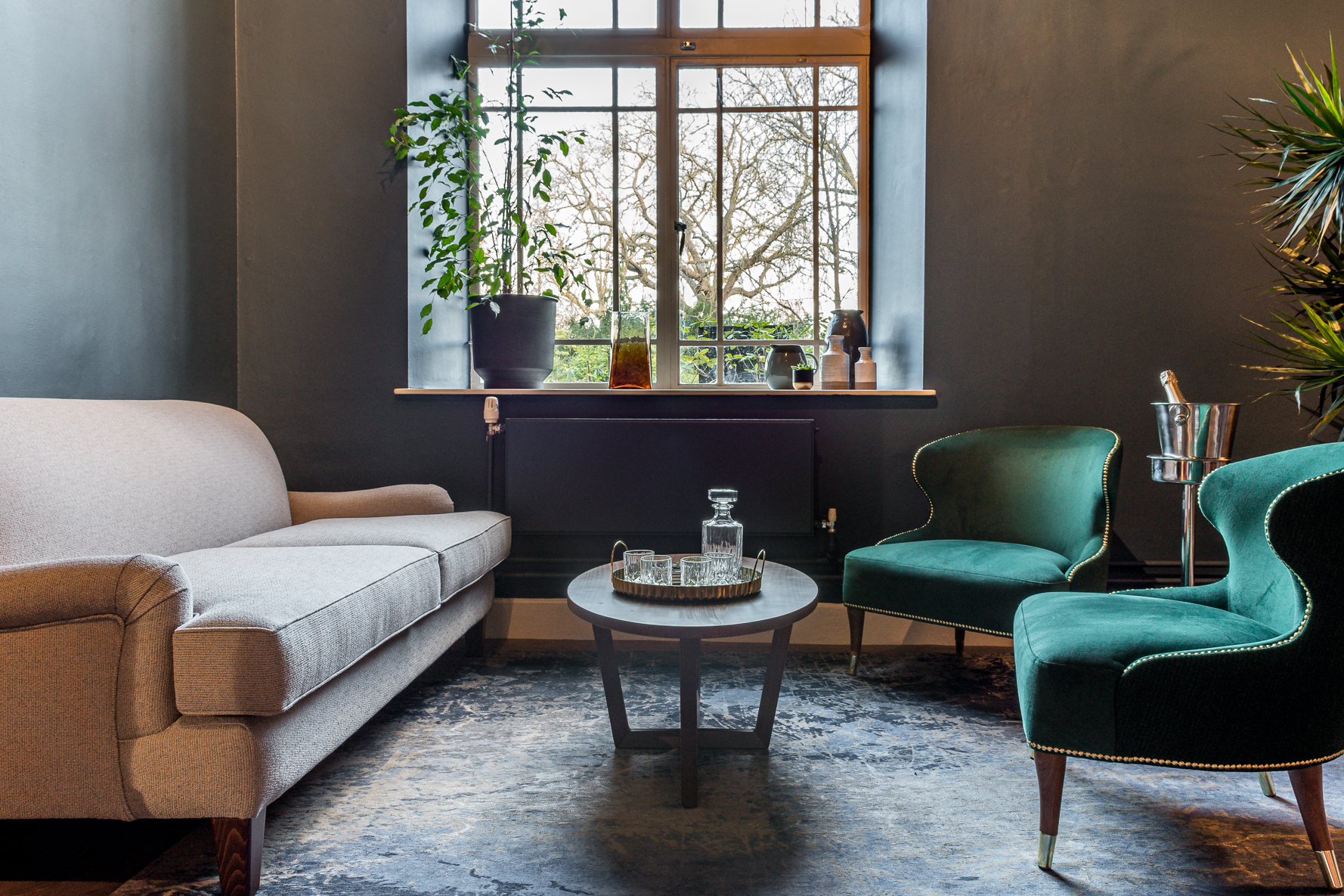 We supplied our elegant Camelia Lounge Chair in several iterations for this project - seen here upholstered in a deep green velvet, with brass stud trim and brass feet to the wooden legs. It sits alongside our bespoke sofa and wooden table, creating an appealing spot to relax or for an informal meeting.