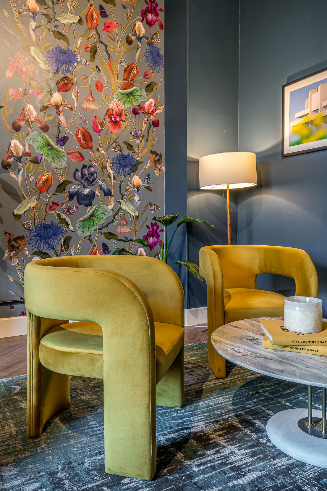 Our bespoke Lara lounge chair looks fantastic in this beautiful ochre yellow velvet from Agua Fabrics - it’s a real statement piece that works brilliantly against the bold botanical wall covering.