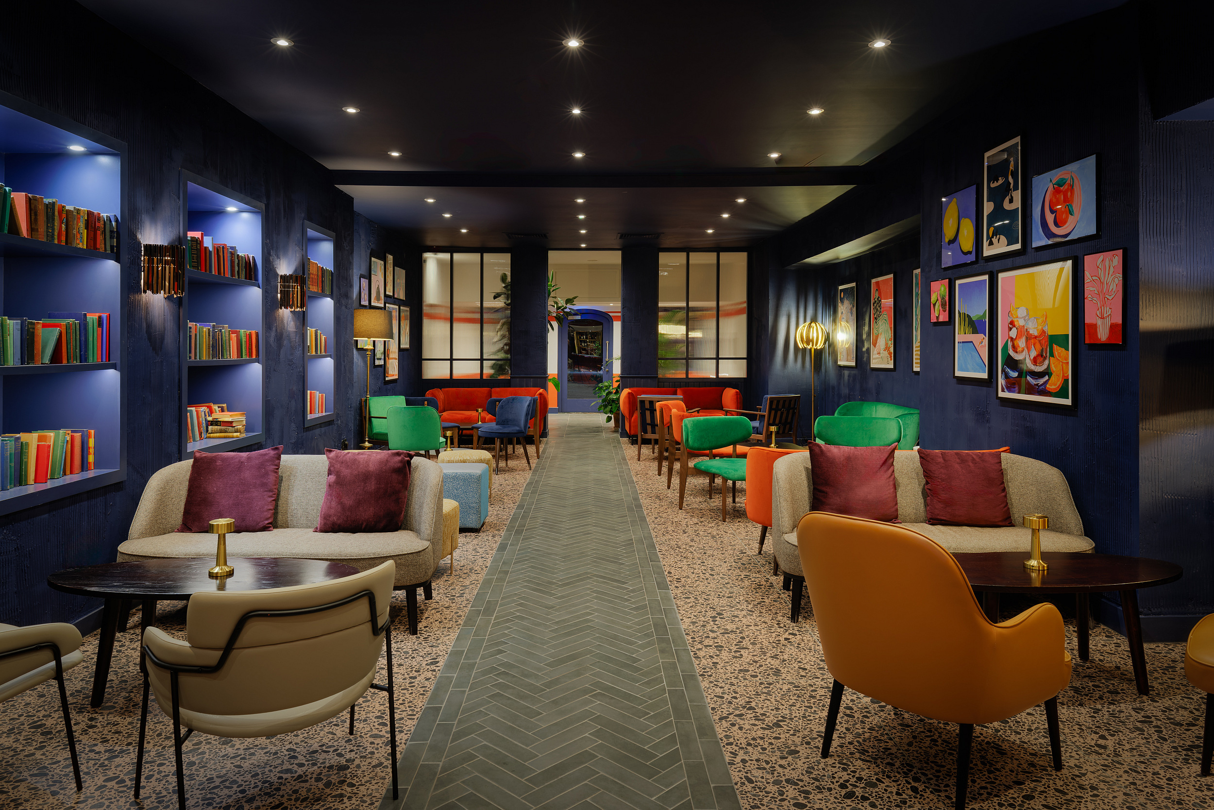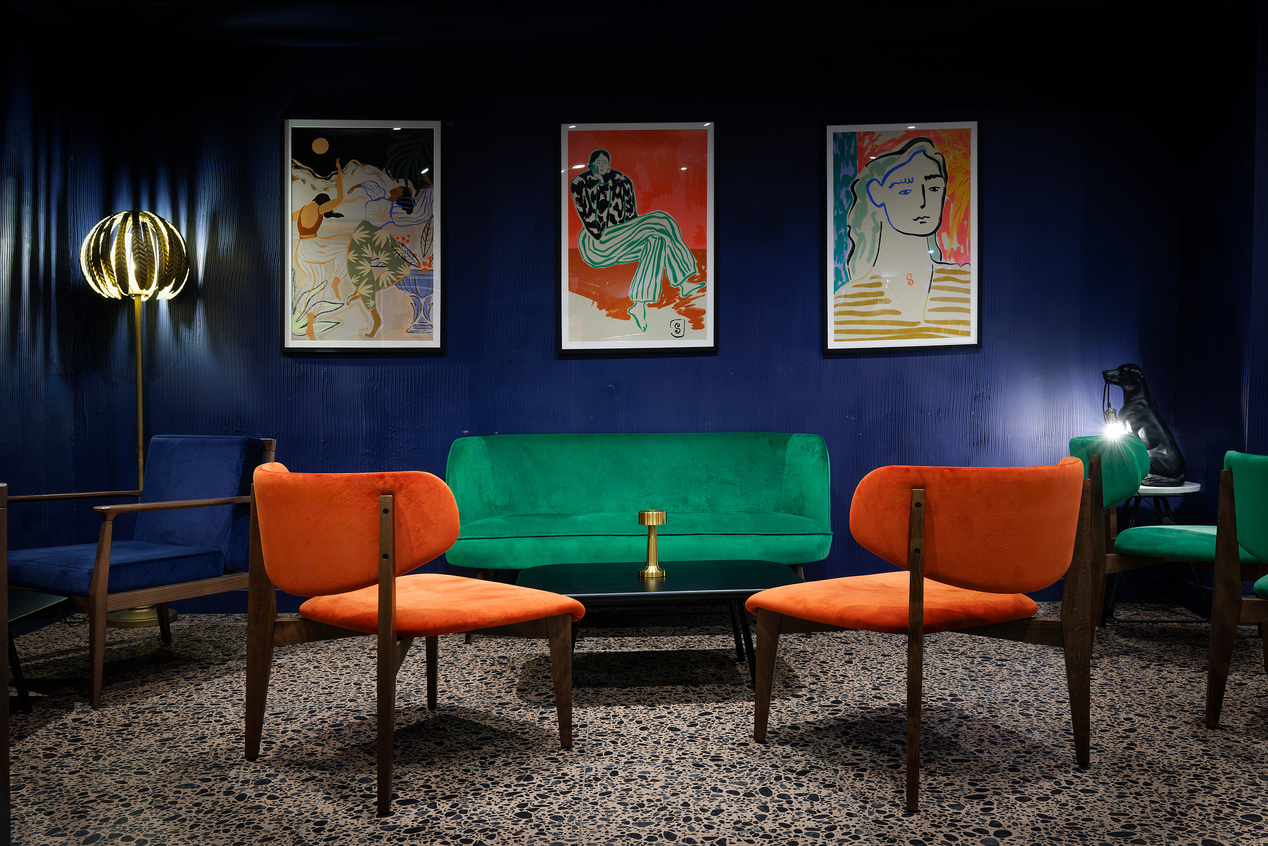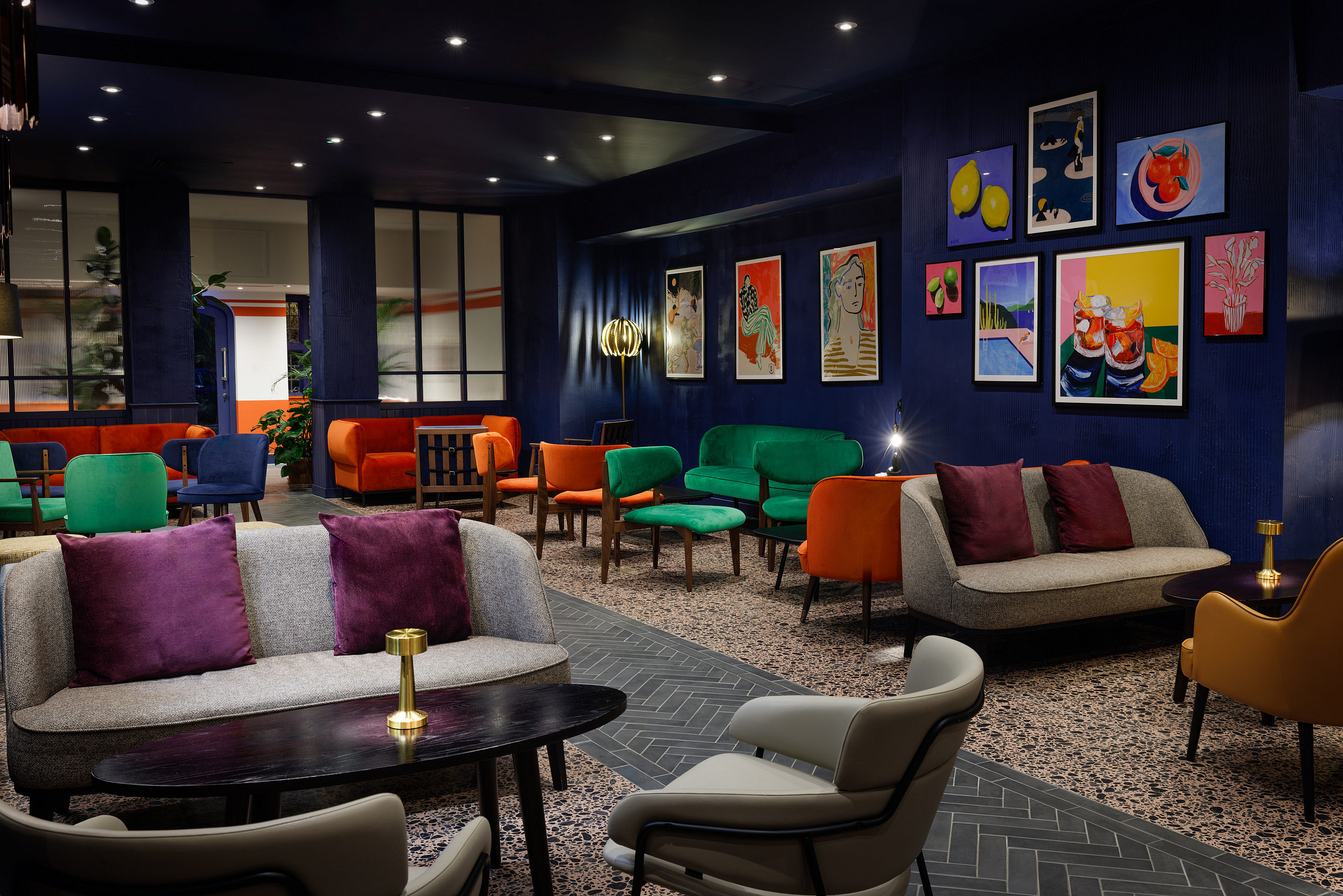 The use of bold block colour and texture in the bar and lounge area creates a really appealing space, with indigo walls and ceiling providing a slick backdrop to the punchy colours used for upholstery and accessories throughout.