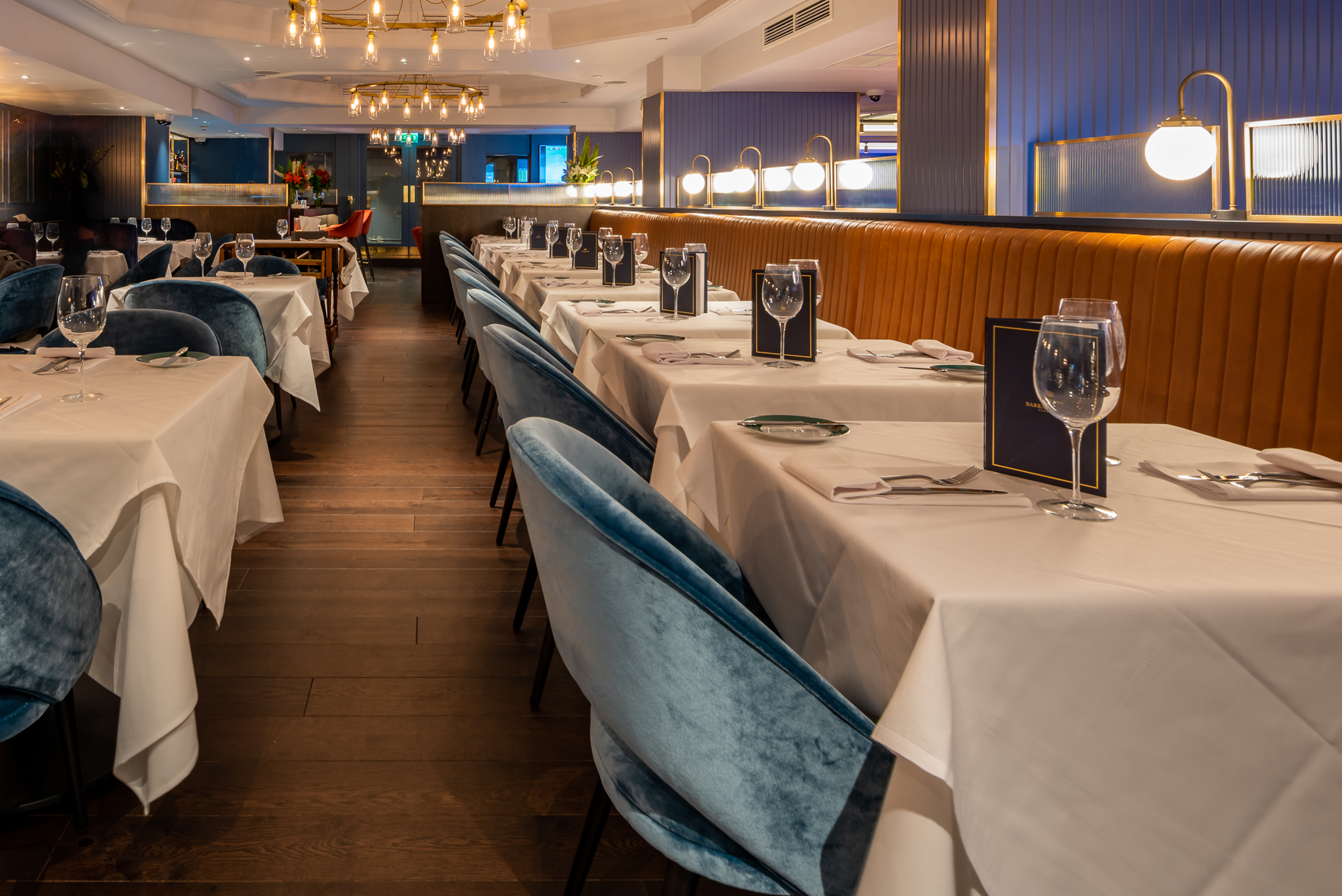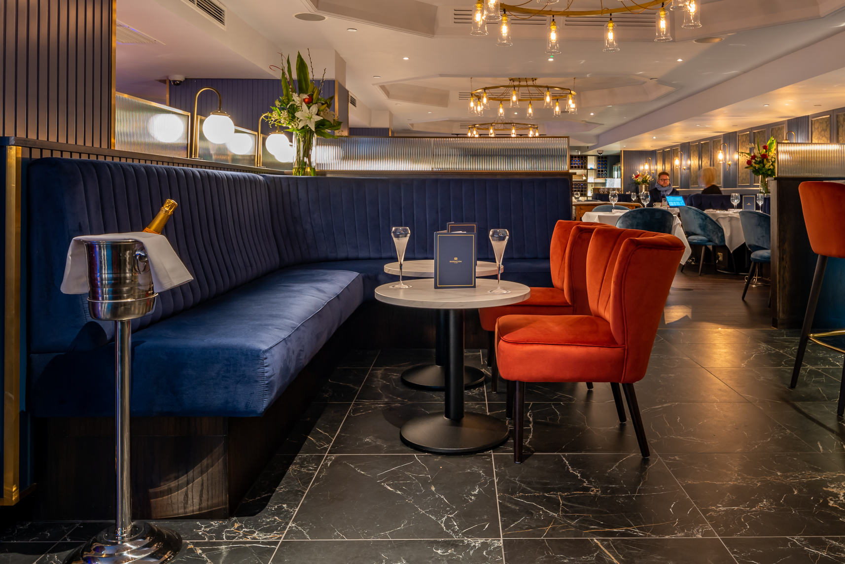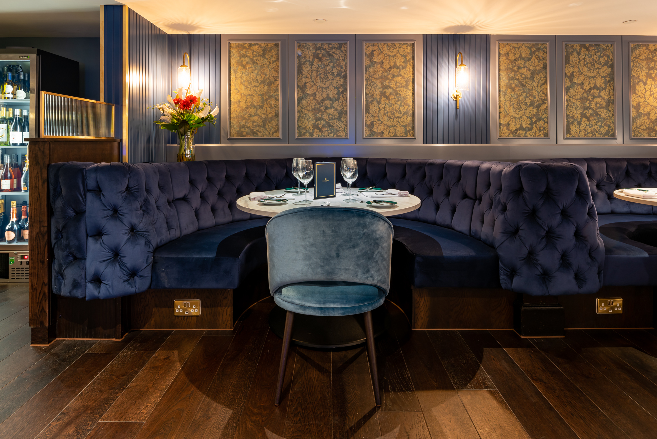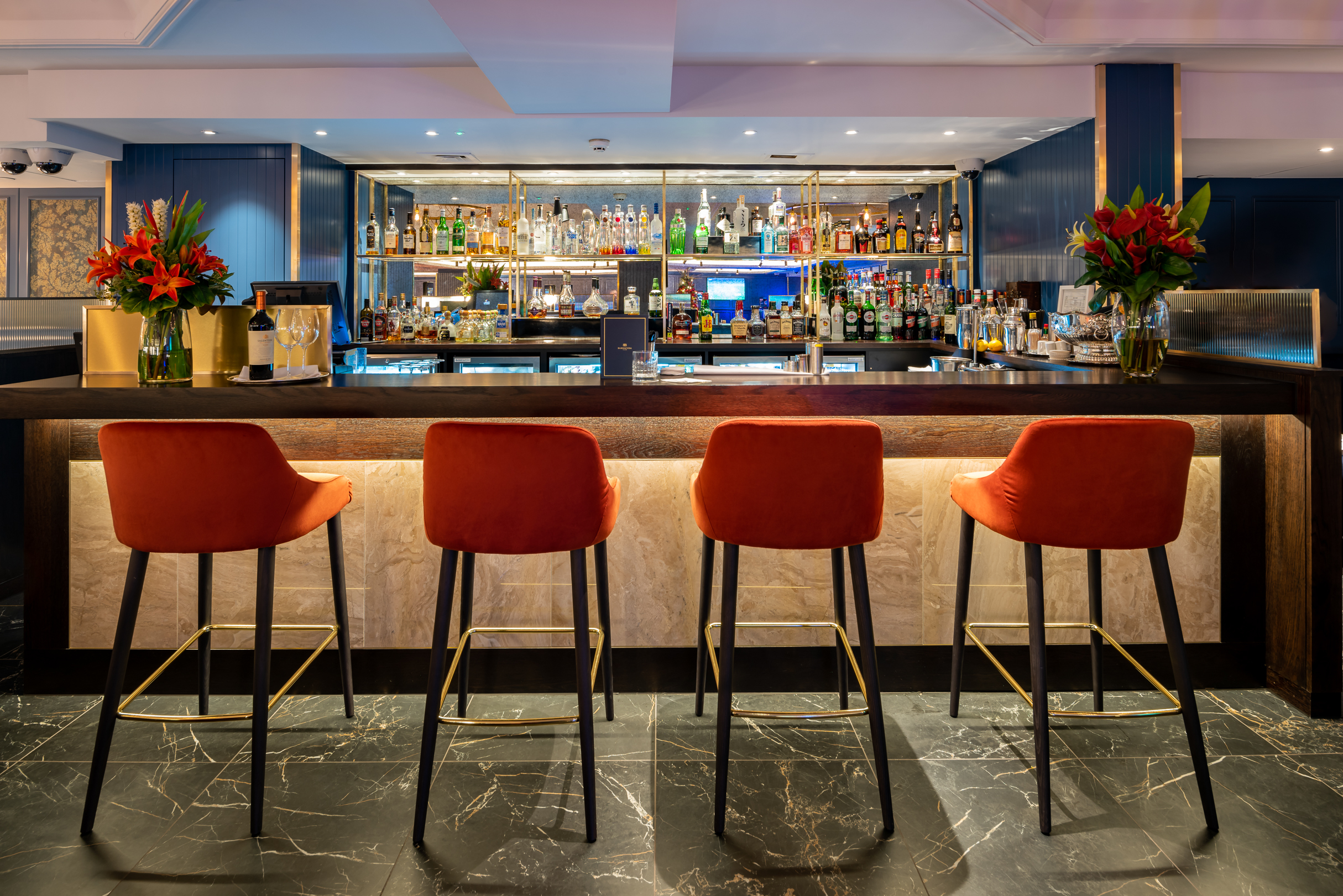 Four Adima Bar Stools are a focal point in the bar area, upholstered in elegant velvet fabric with a brass finish footrest perfectly fitting the look. The Luna lounge chairs were produced in the UK and are a super-stylish and super-comfortable addition to any hospitality interior.