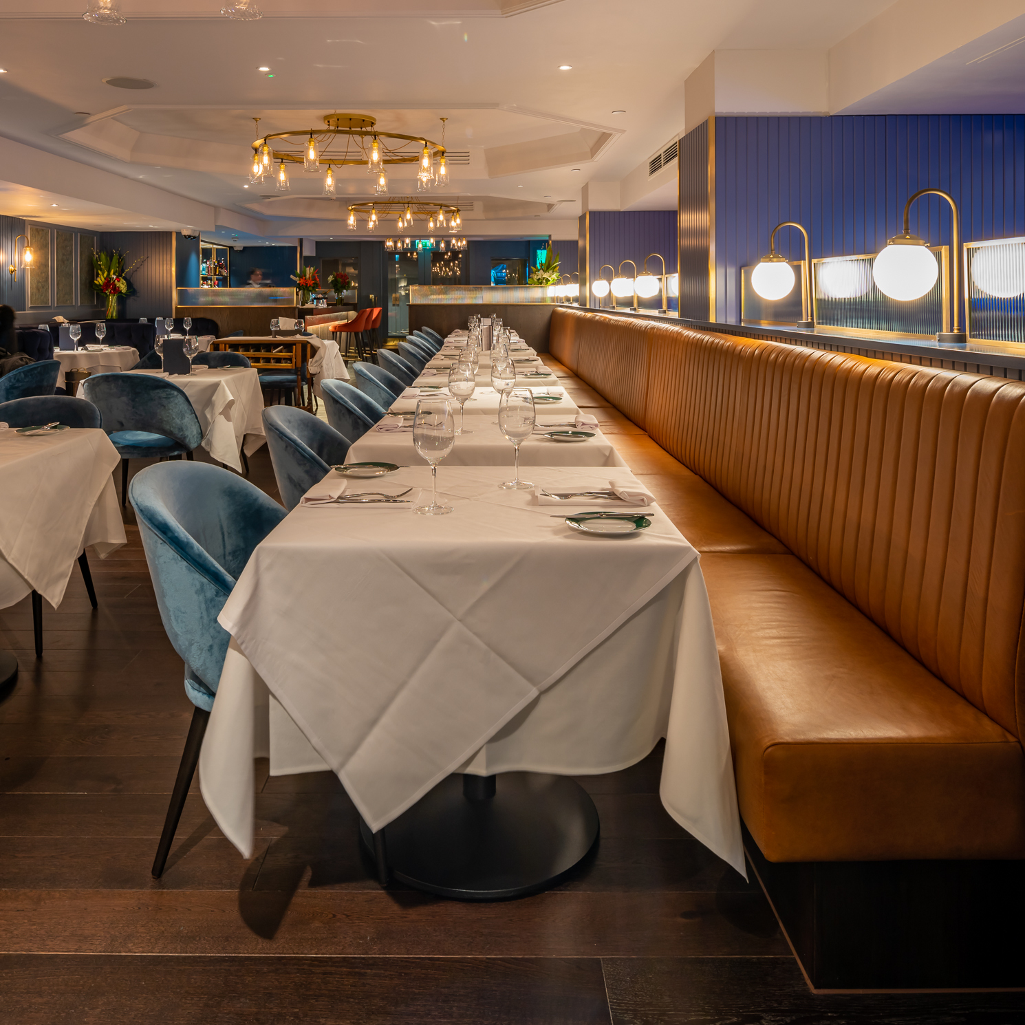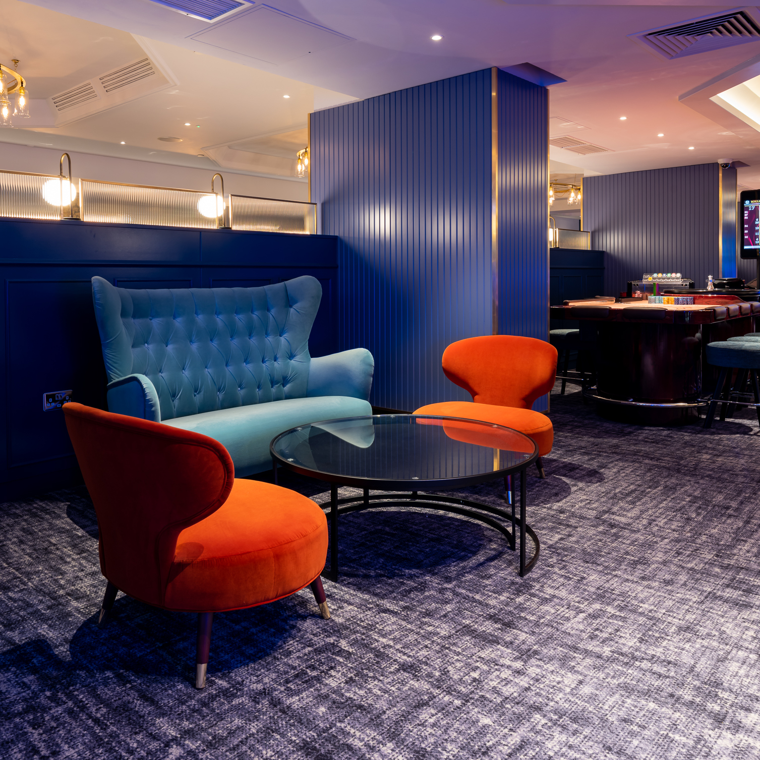 Our Sinatra Chairs feature in the restaurant, with a streamlined shape and soft curves combining with their blue velvet upholstery to add elegance to the dining space. The Duke sofa and lounge chair are both designed with a high back to give a sense of privacy and comfort. These pieces were chosen by the client specifically for The White Room – a private space where all the high stakes bets happen.