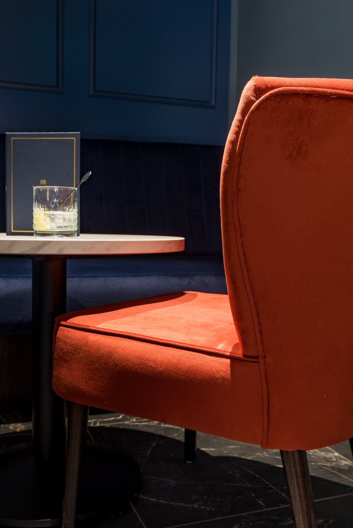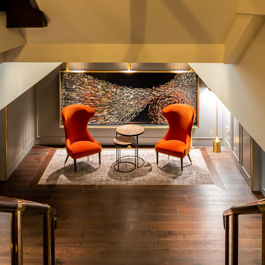 Furniture Fusion worked with the client to create furniture with a high end, luxury feel, using velvets, wood and metal. Our Elle Lounge Chairs and Camelia High Back Lounge Chair, upholstered in an orange velvet, add a pop of colour and sit perfectly with the duo of bespoke side tables.