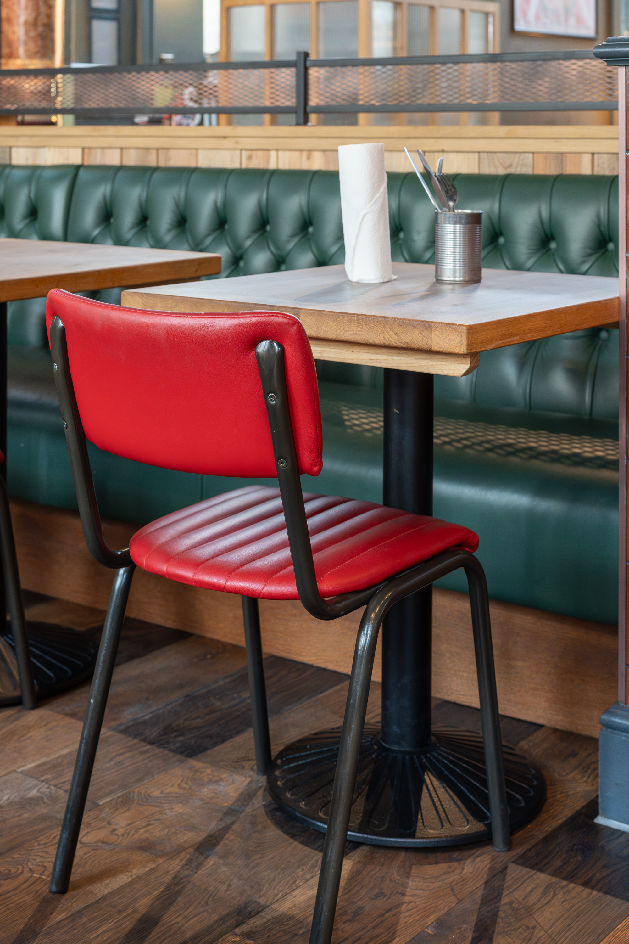 Our Tavo stacking side chair is a great choice for a restaurant, bar or other hospitality setting. The upholstered leather back and seat feature a ribbed effect which combines with the metal frame to give an industrial look with a touch of vintage. It’s stackable, which makes it easy to move and store, allowing operators to respond to changing demand easily.