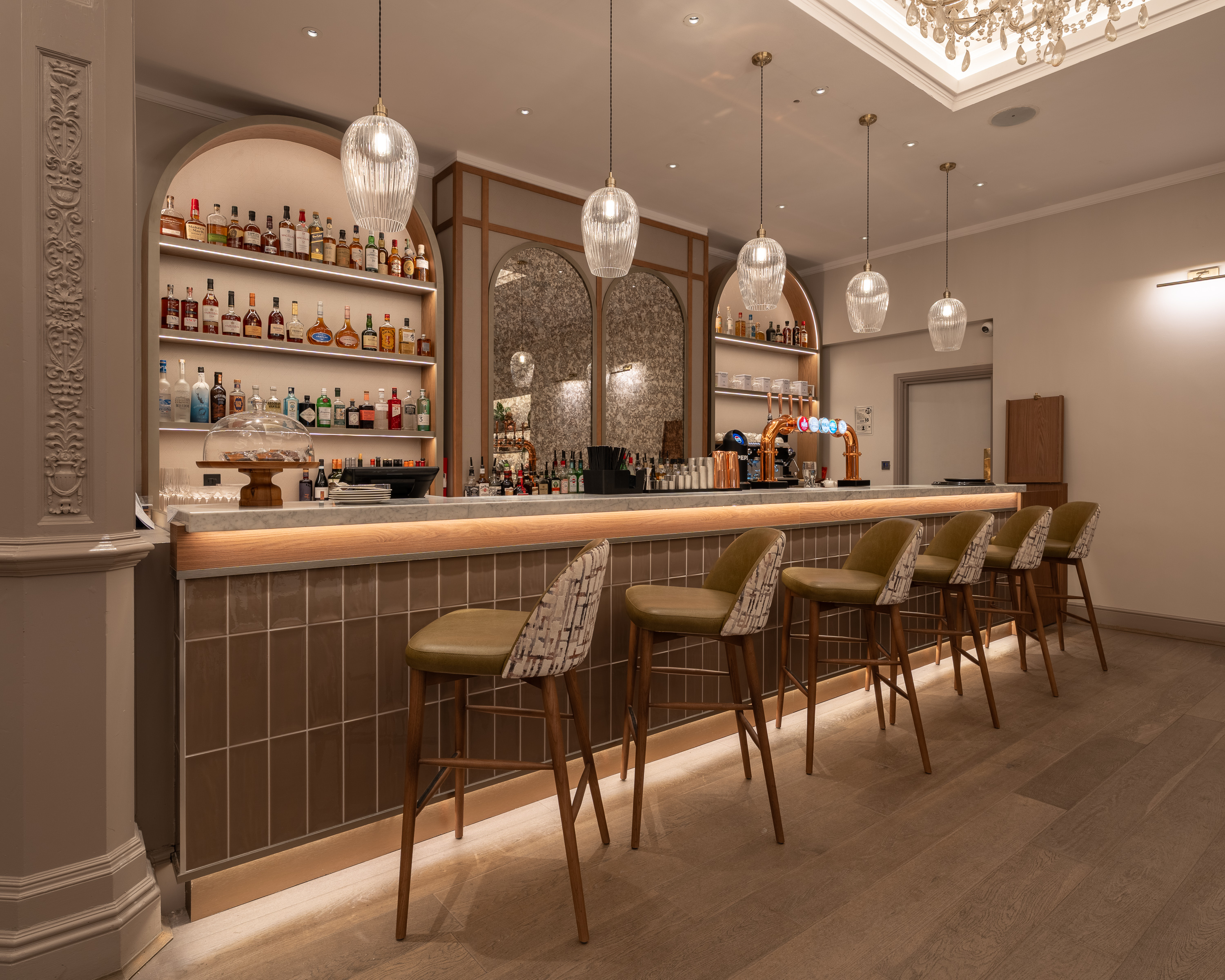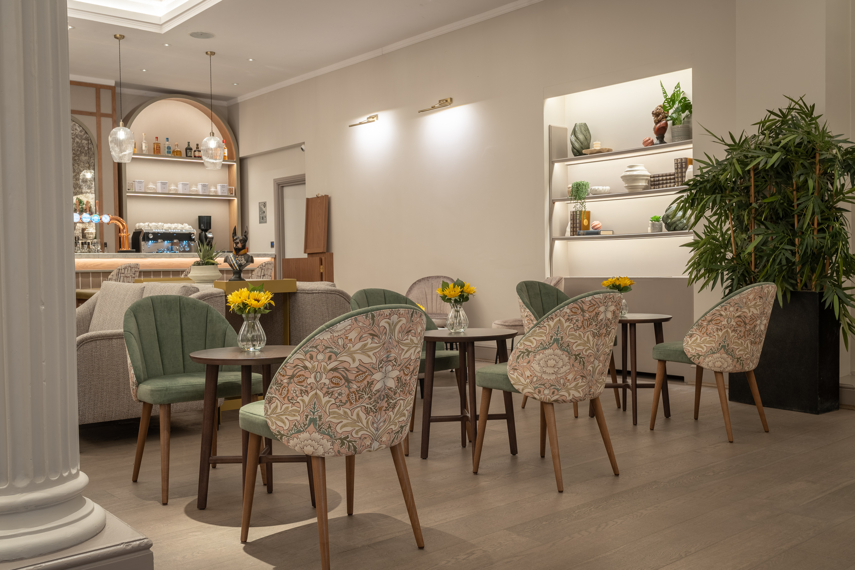 The bar is now home to our Lana chair, supplied with split upholstery in soft green velvet to the inner back and seat, while the outer back is upholstered in a beautiful floral damask fabric - a nod to the hotel’s Victorian heritage. Our Wings dining armchair is upholstered in a deep burgundy velvet fabric and also in olive green faux leather.