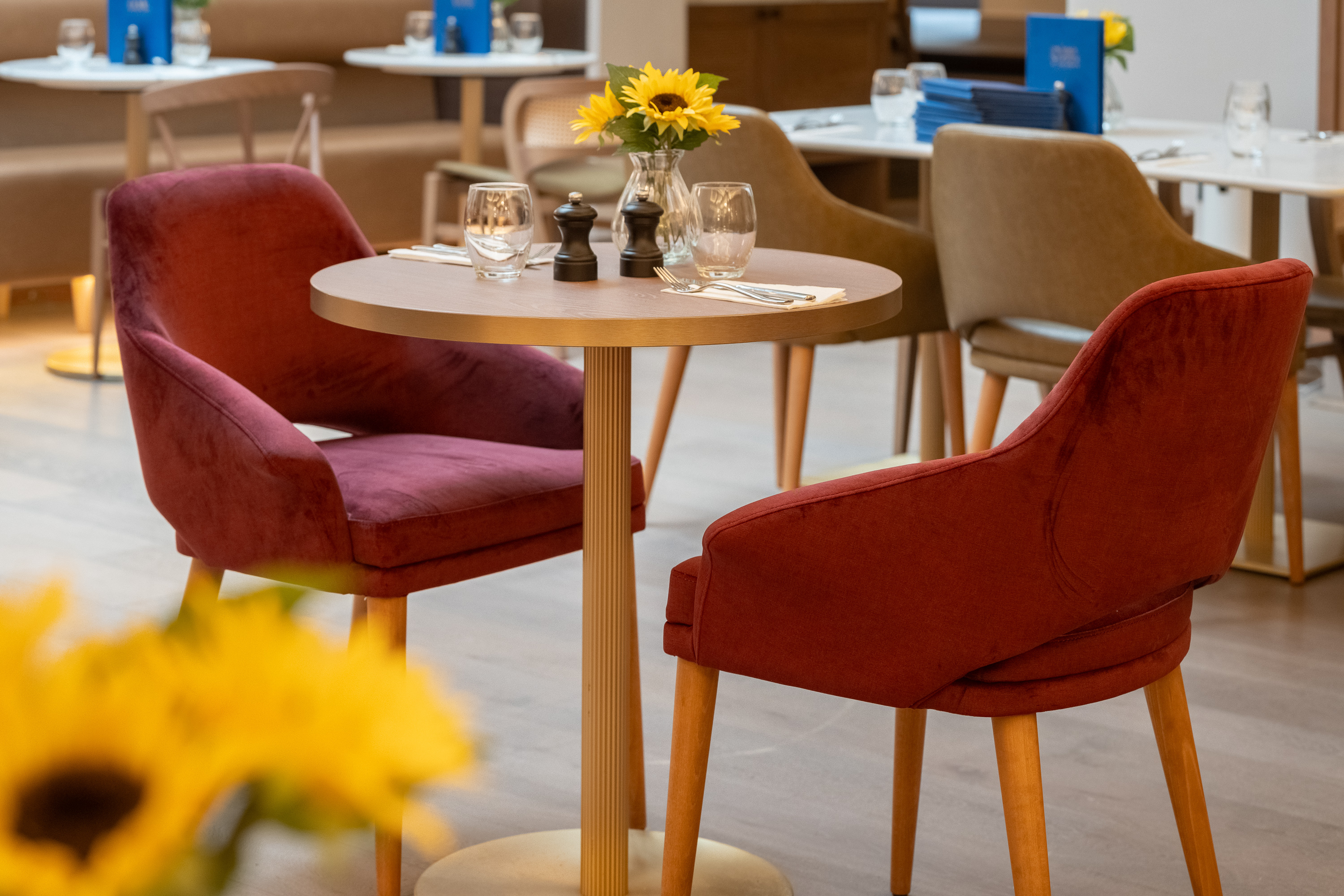 The restaurant also features our Ginger side chair with a solid beech frame stained to dark oak and a seat upholstered in deep mahogany faux leather.
