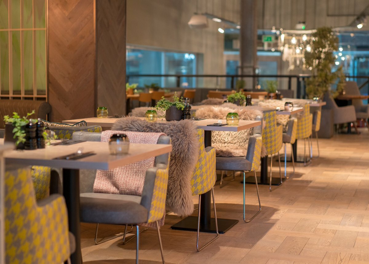 On entering the venue, you find yourself in an open kitchen seating area, where we supplied our Joe Side Chair and Babila Bar Stools, both upholstered in eye-catching fabrics. The main dining area has a mixture of fixed booth seats, dining tables and long high tables, for which we supplied the Randers Stools in a beautiful vintage leather. We re-upholstered the client’s existing armchairs in a vibrant yellow and grey fabric, to match with Babila stools - a smart and sustainable choice as part of a refurbishment project.