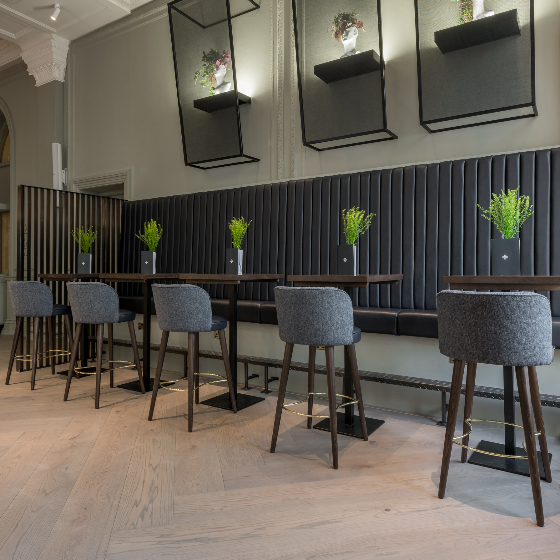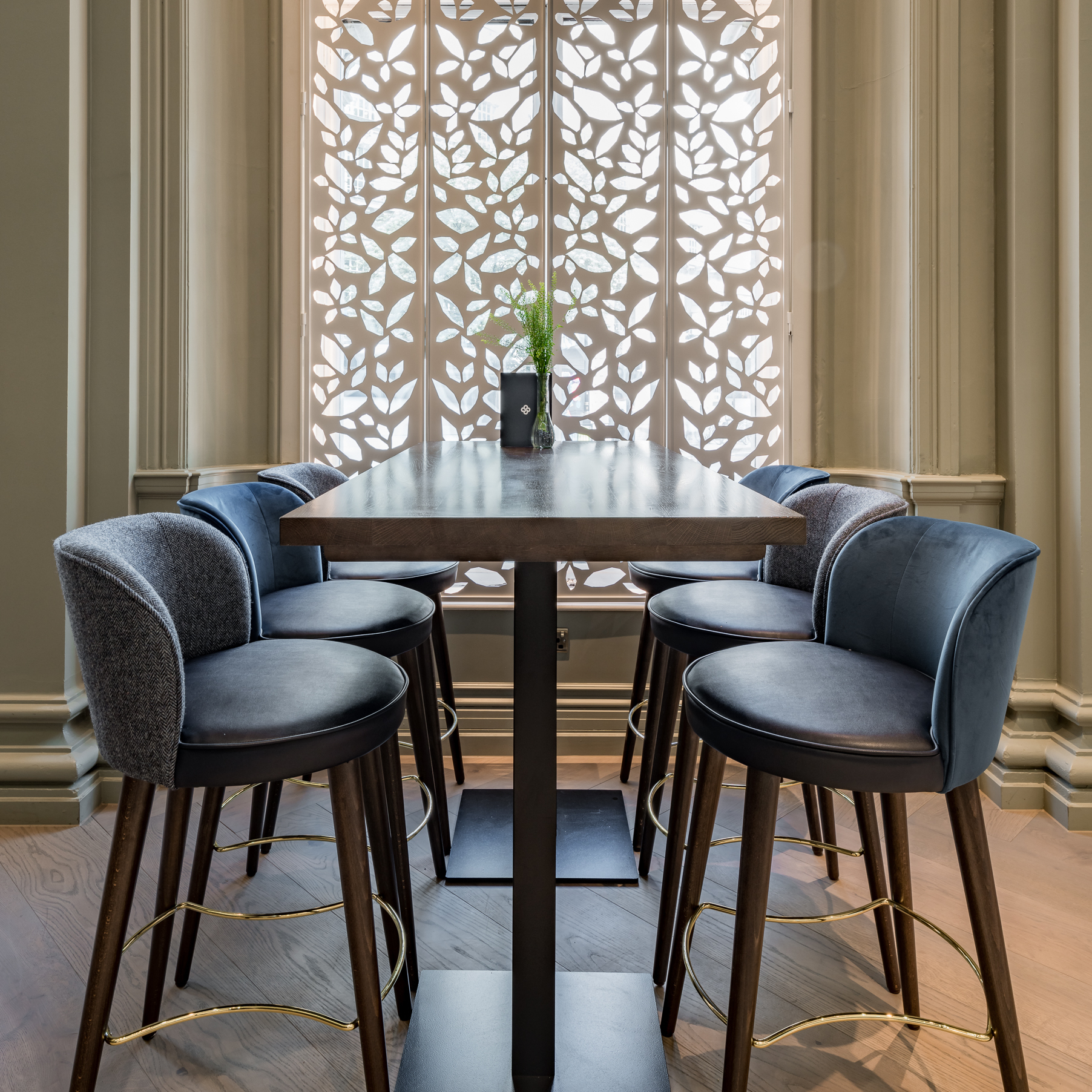 In the restaurant and bar area, our Merano Side Chairs in dark wood and leather upholstery sit perfectly alongside our concrete table tops - a great mix of textures and finishes next to the peacock blue velvet of the fixed seating. Our bespoke side and armchairs are dotted around the stylish space with bright pops of colour contrasting with the dark wood and concrete table tops - a winning combination of classic and contemporary design.
