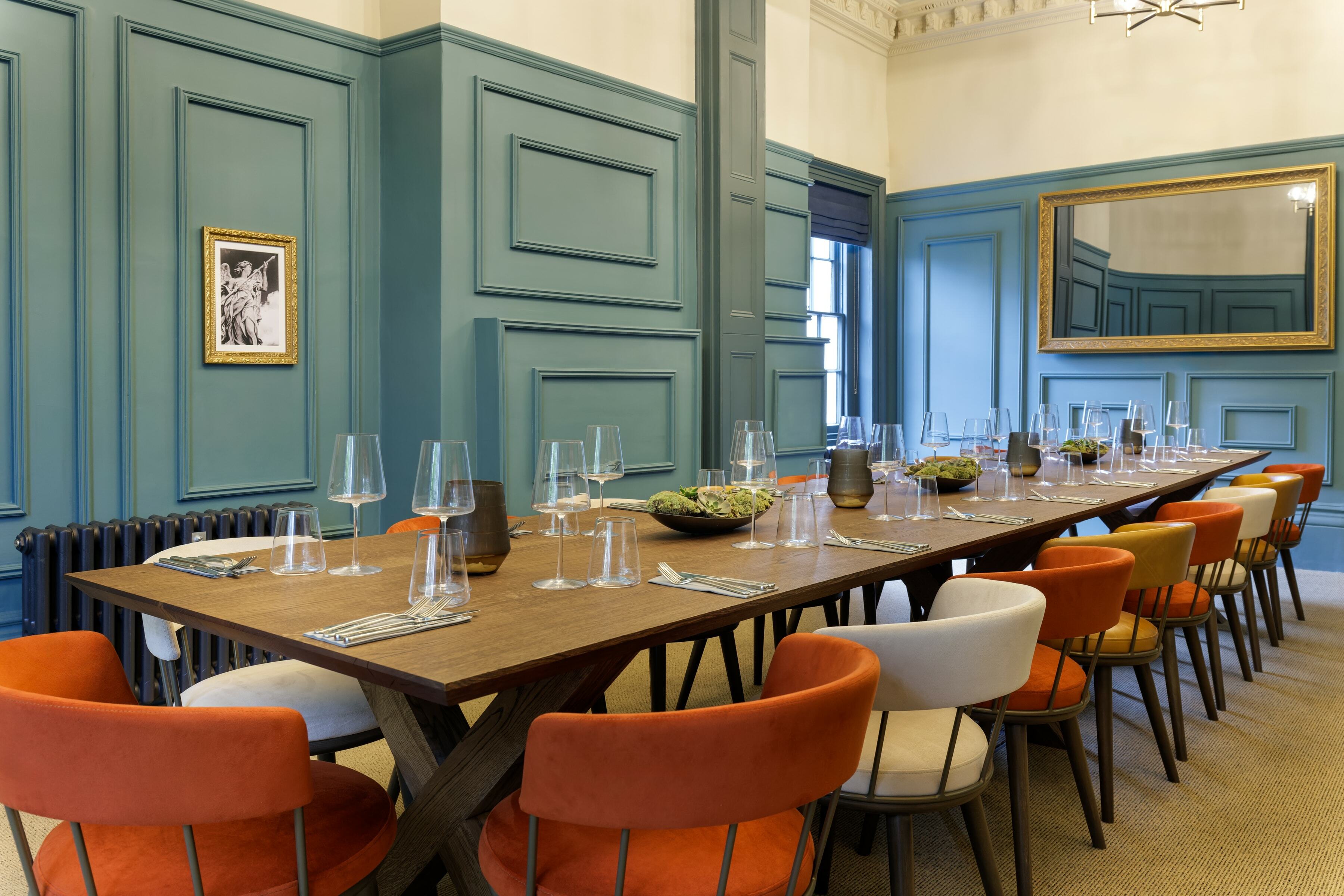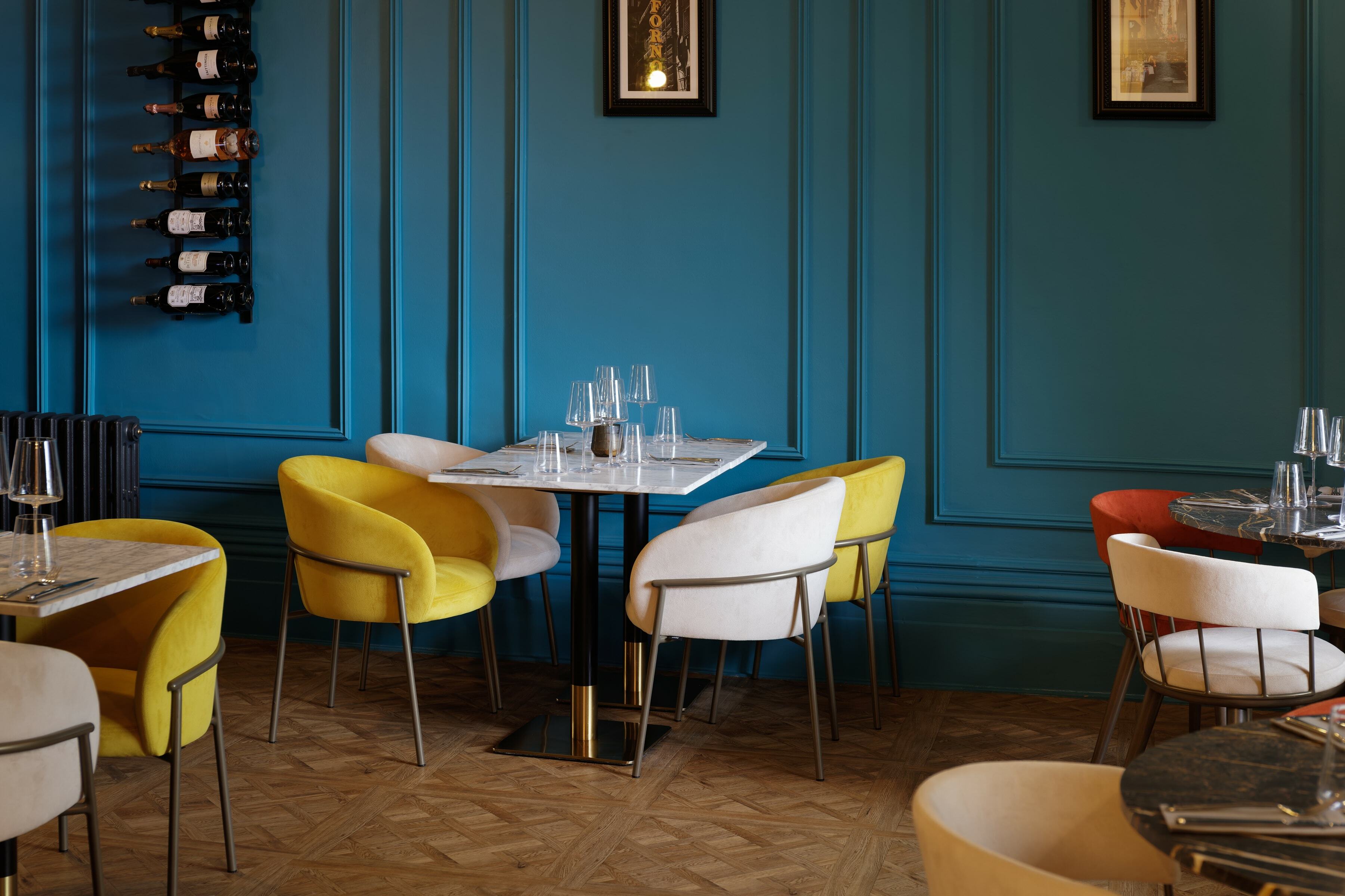 On the top floor is The Imperiale, a gorgeous private dining room which can also be used for meetings. For the long table, we placed our Meru Armchair as before in the same colour palette as the main dining space. It's a fantastic result against the backdrop of the blue walls.