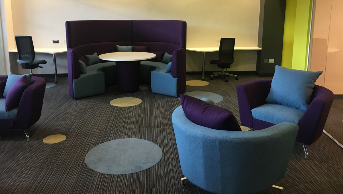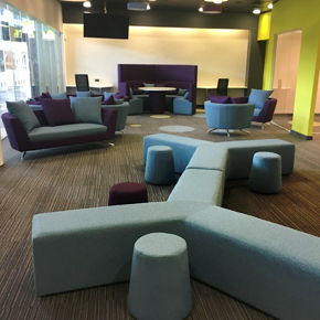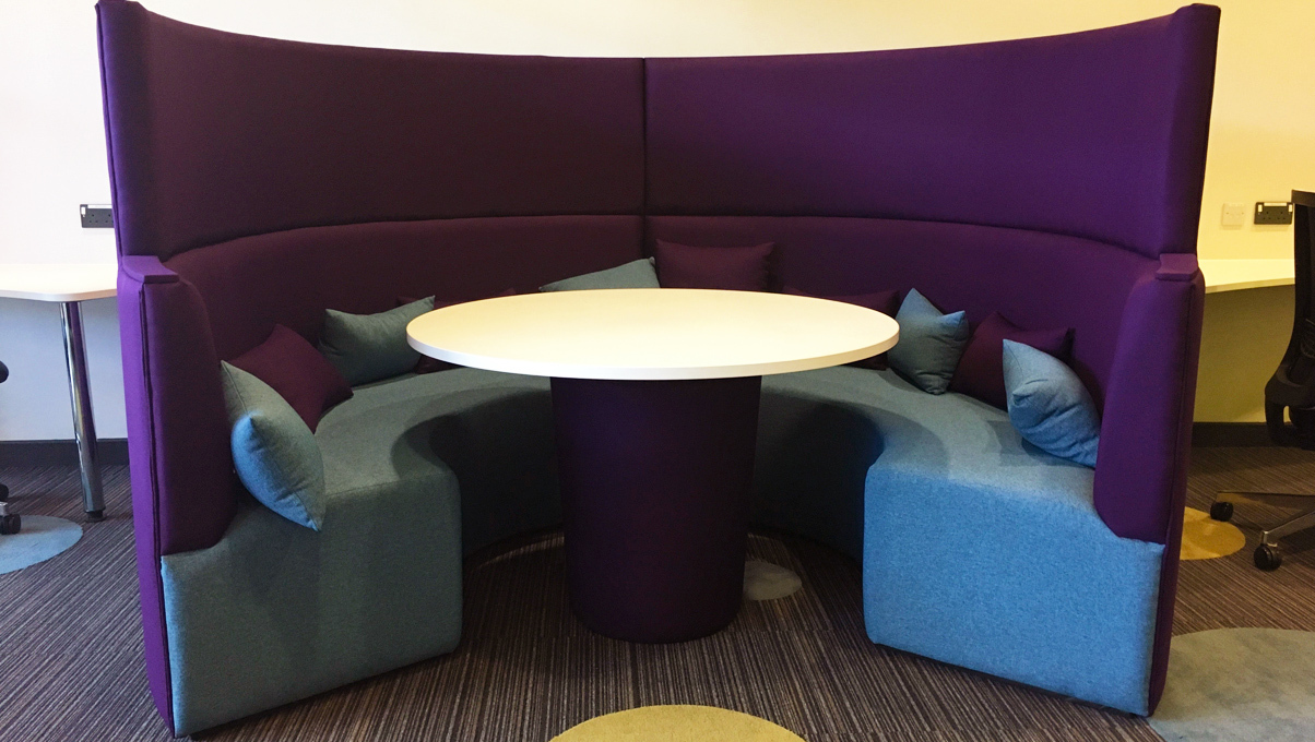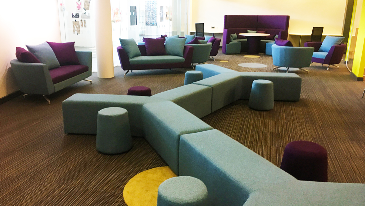 Our brief was to deliver modular furniture to enable collaborative thinking and team working, with a contemporary, stylish feel to suit the space. We came up with a selection of eclectic shapes, textures and pieces. Round curvy sofas complement lounge armchairs in the same style. Modular ‘Y’ shaped benches were set beside the sofas and armchairs, with frustum-shaped stools set alongside.